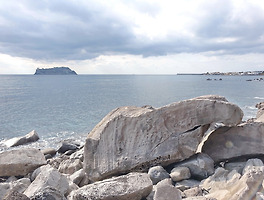 사진 3; 제주도 전통적인 돌담은 사림 키 높이 이하에서 바람이 통하게 돌을 쌓아 놓았다