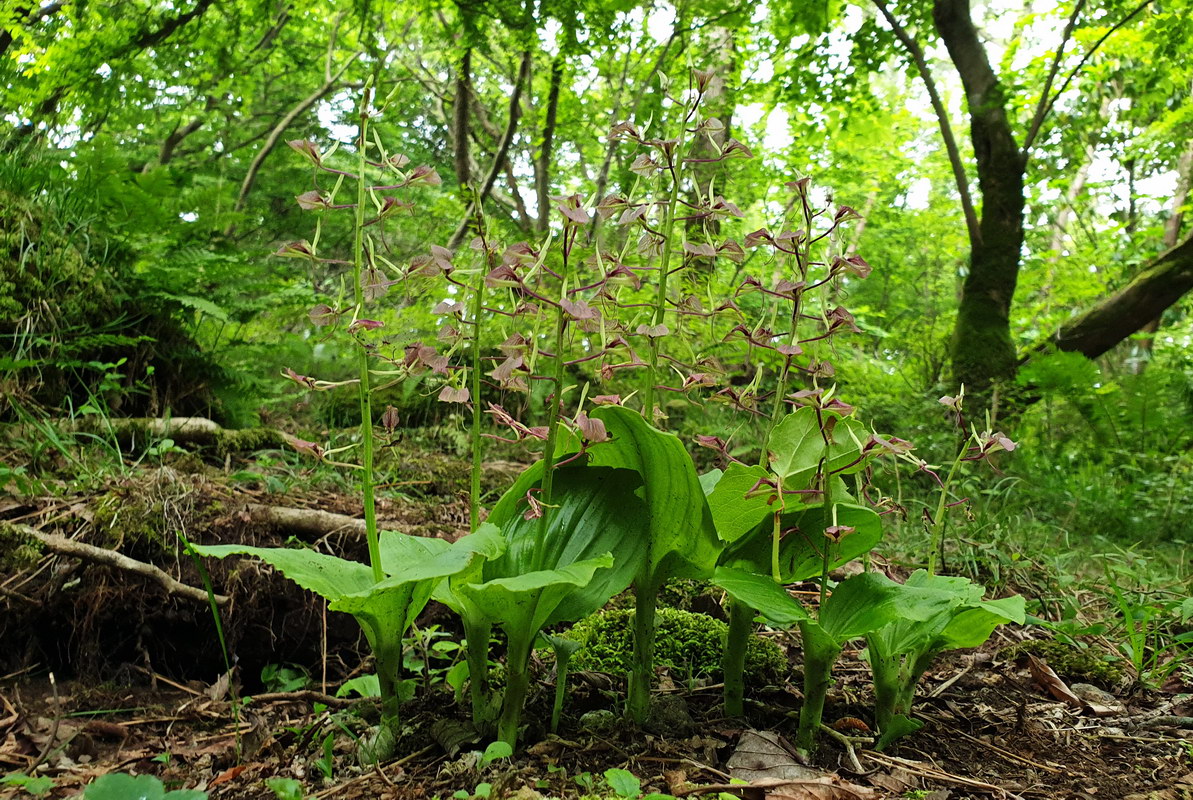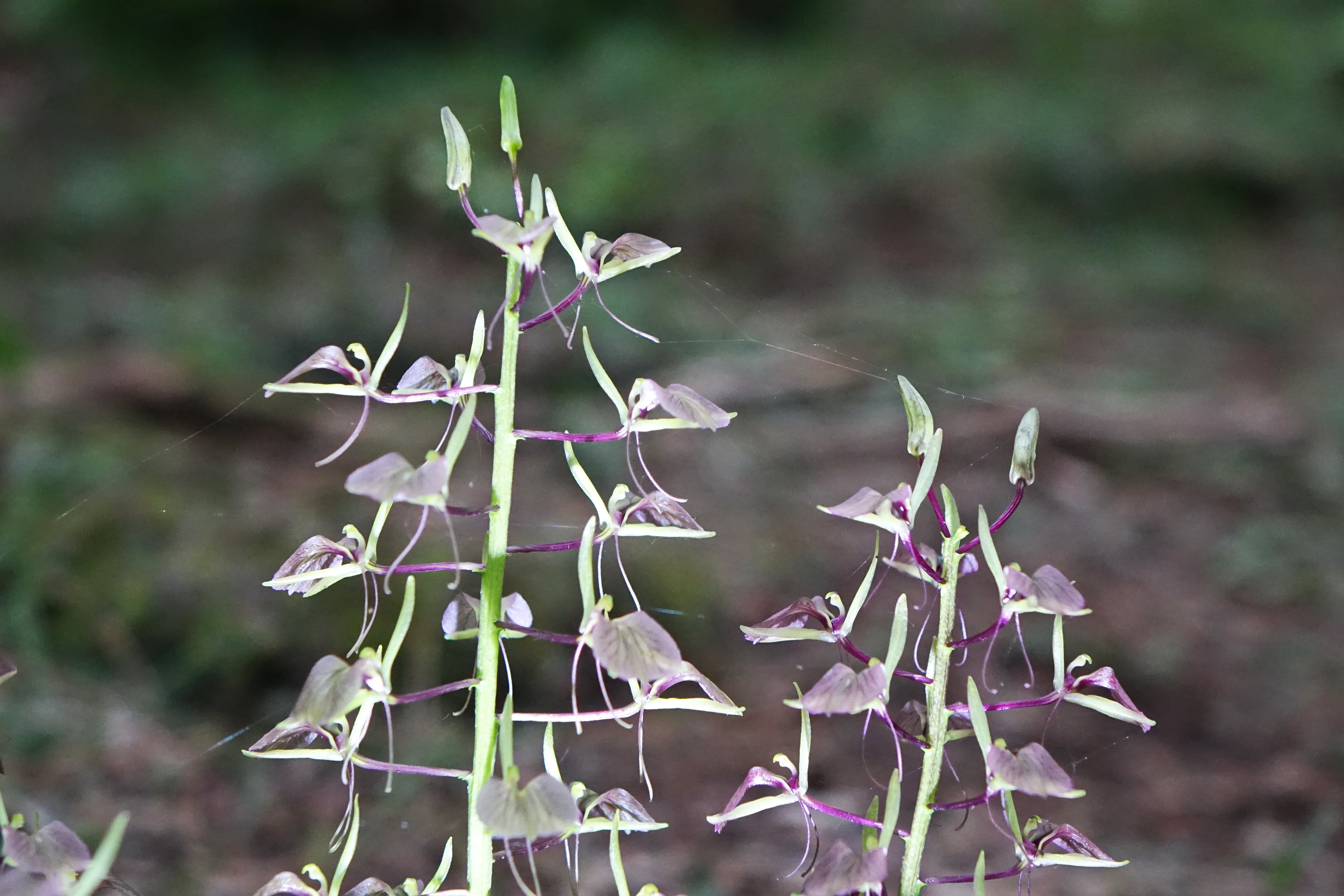 나리난초; 깊은 산 숲 속 나무그늘 아래에서 자란다. 입술 꽃 위아래로 꽃술과 꽃받침이 가는 줄기 모양으로 나 있다.