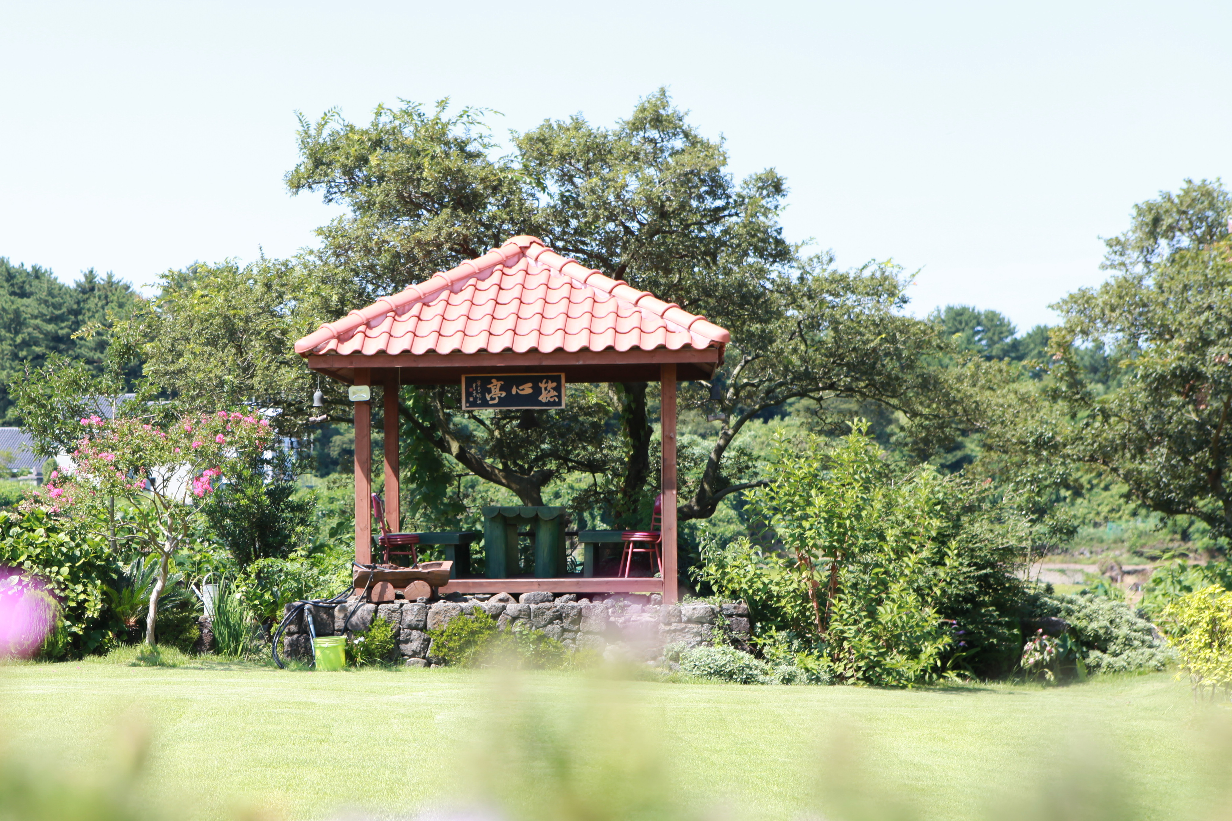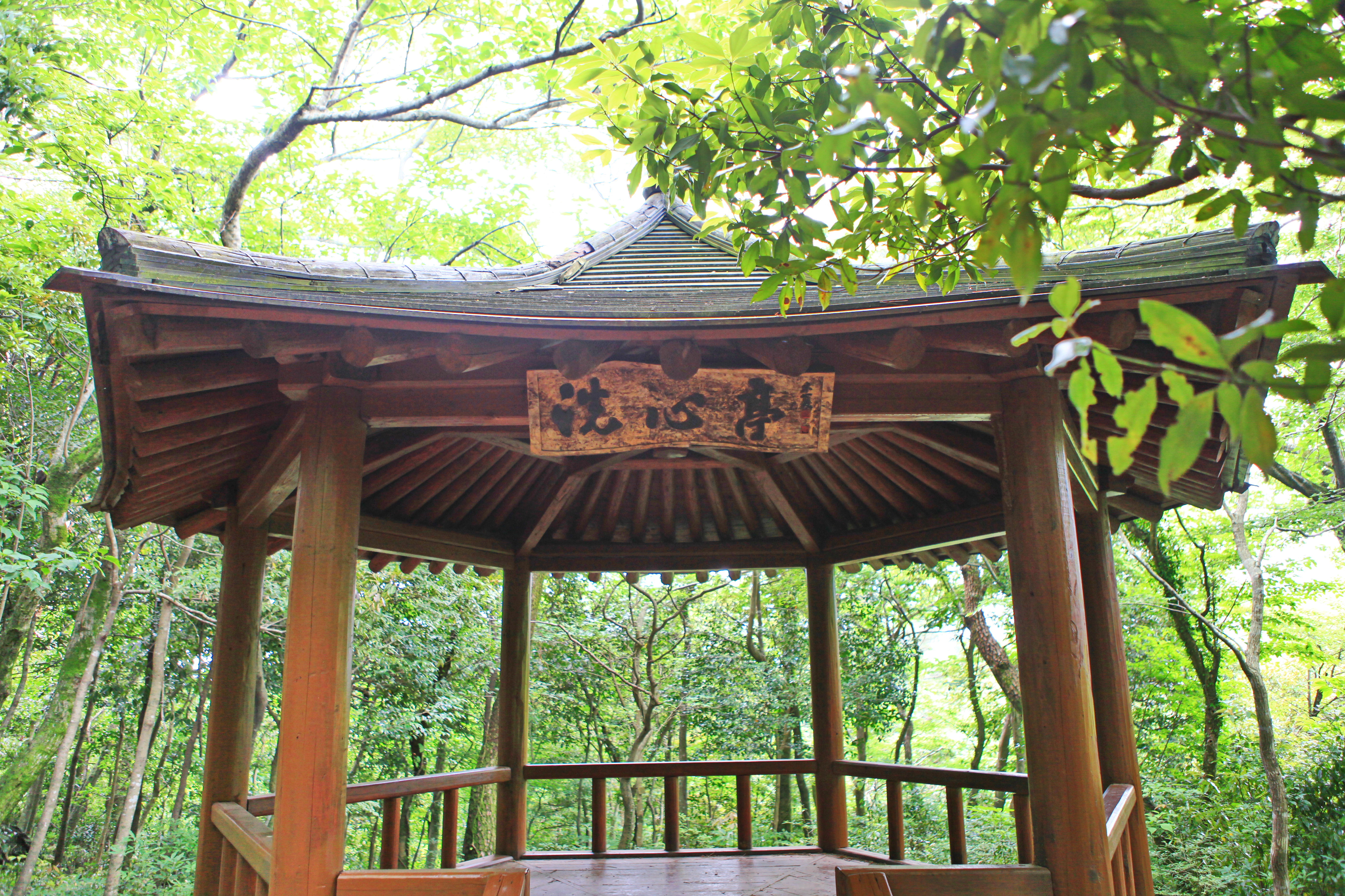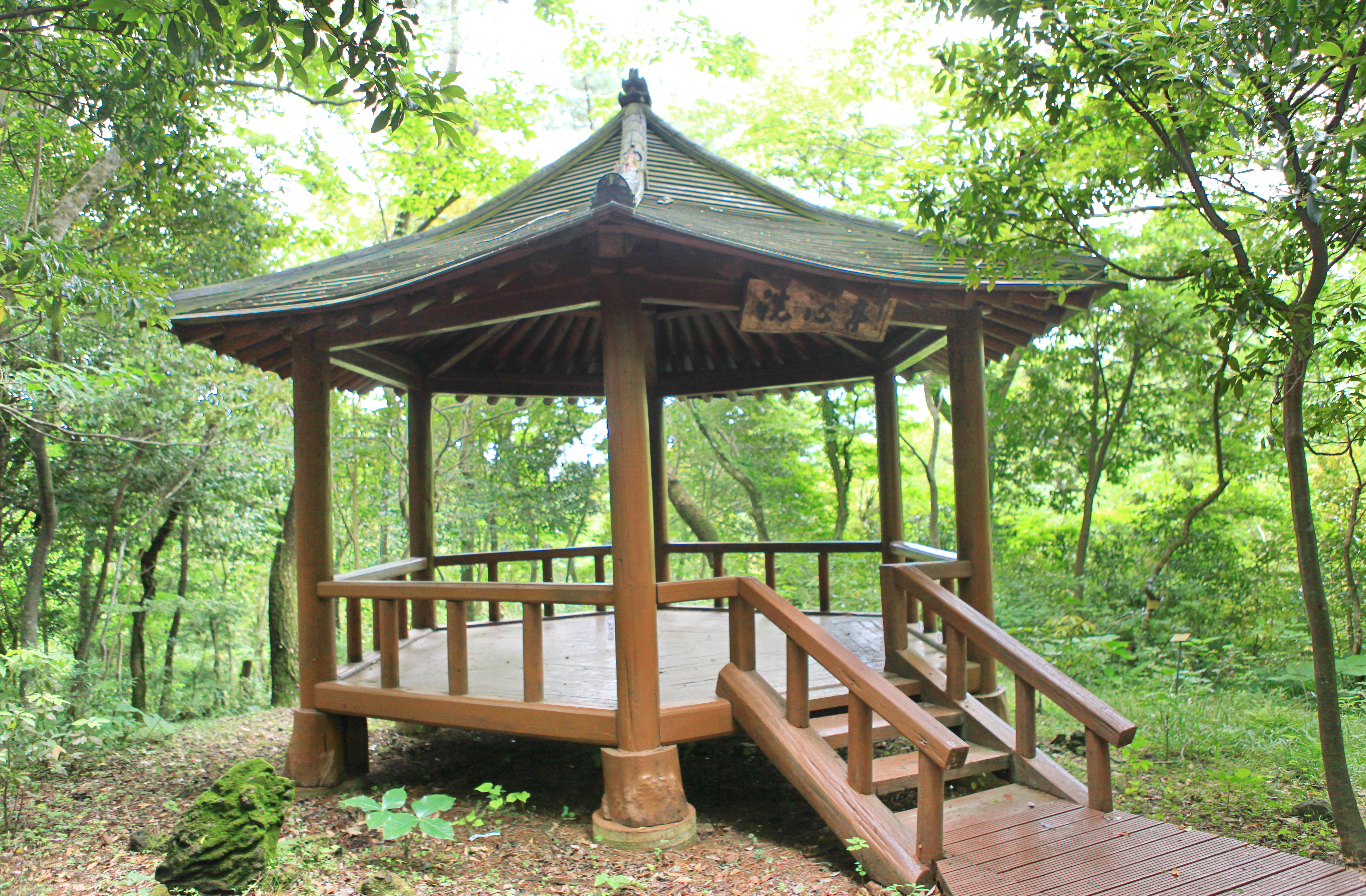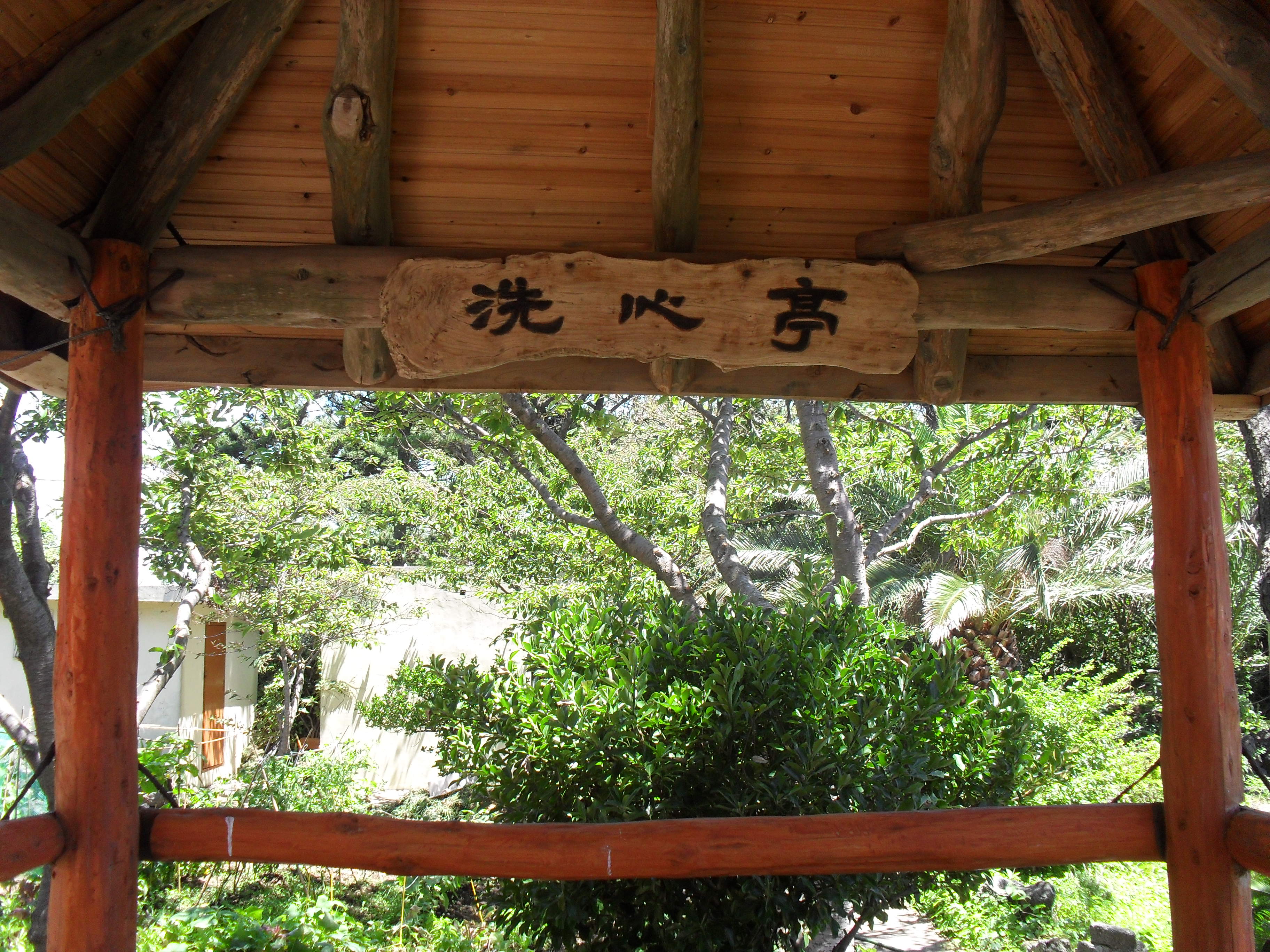 <사려니오름 뒤편 숲 산책로변에 있는 세심정 간판의 정자>