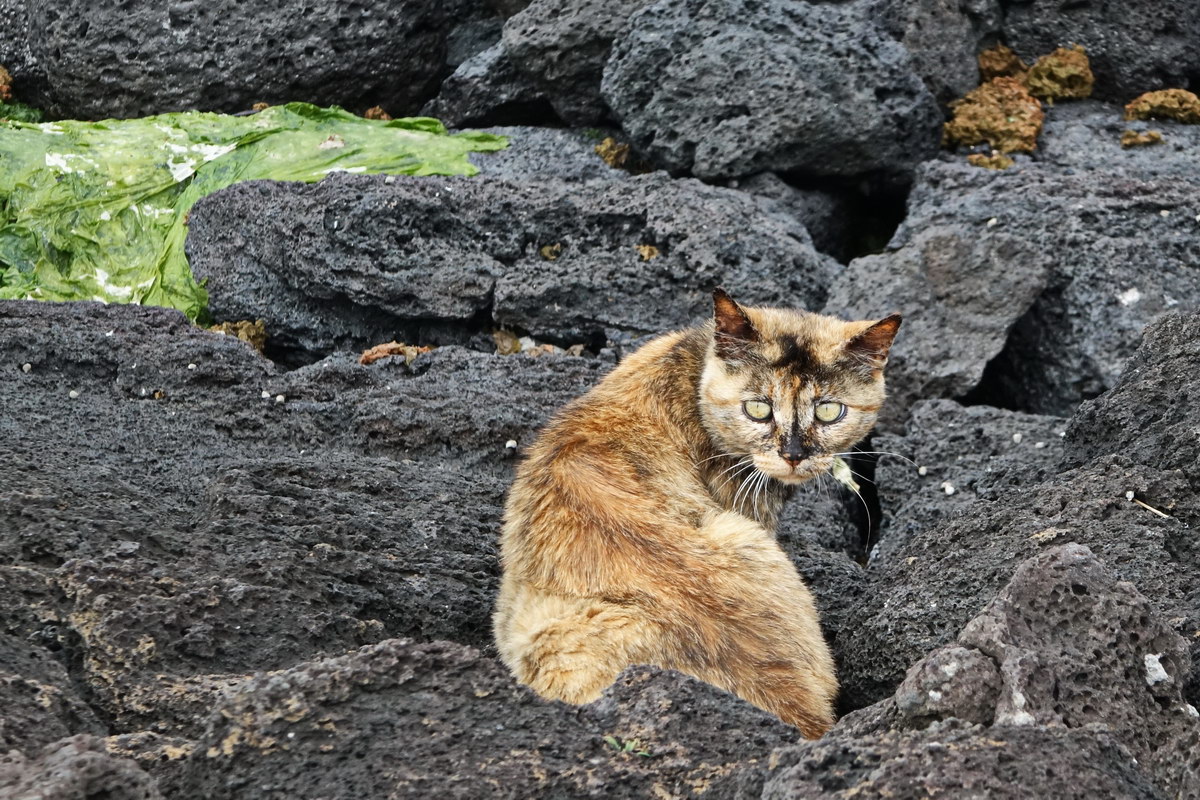 검은 모래 바닷가를 어슬렁거리는 고양이