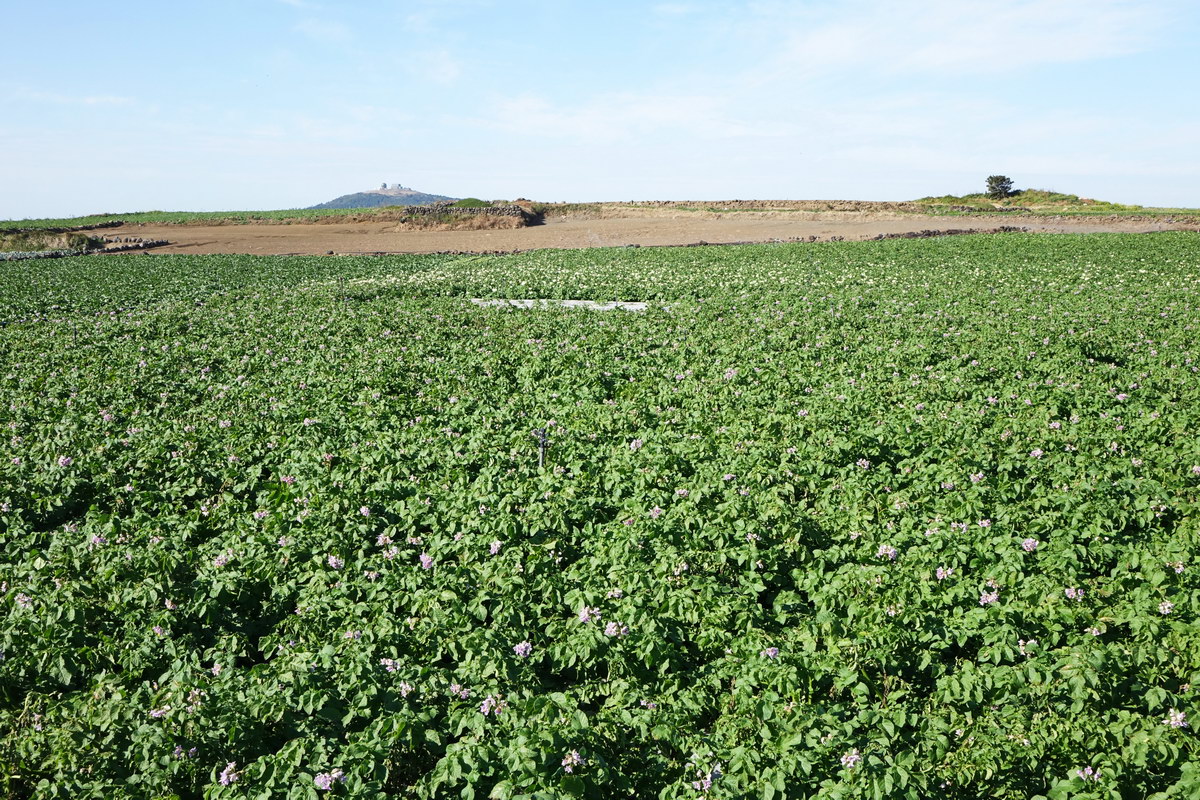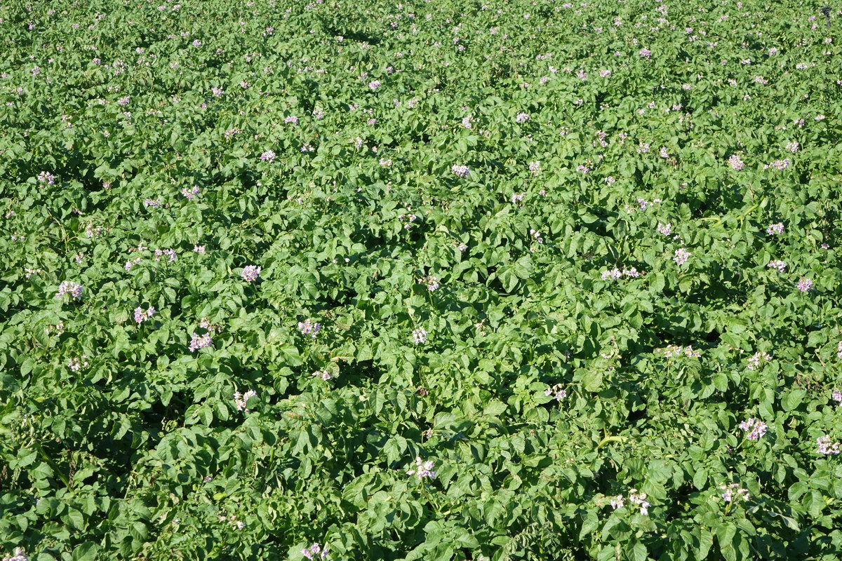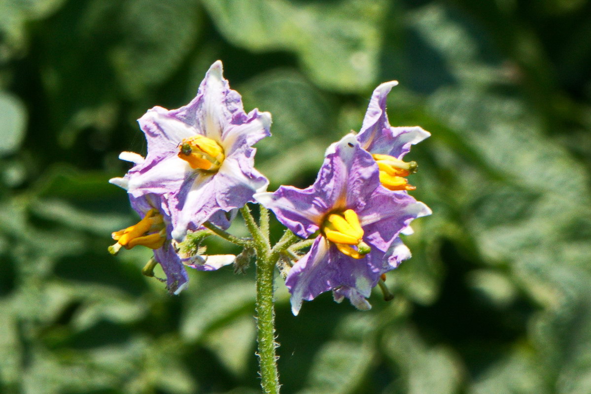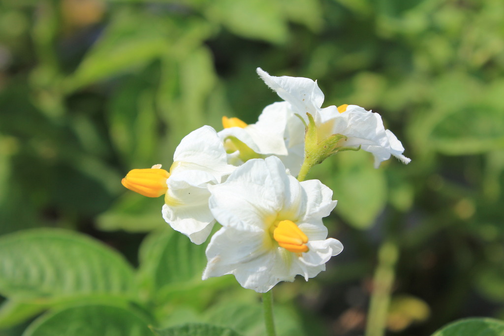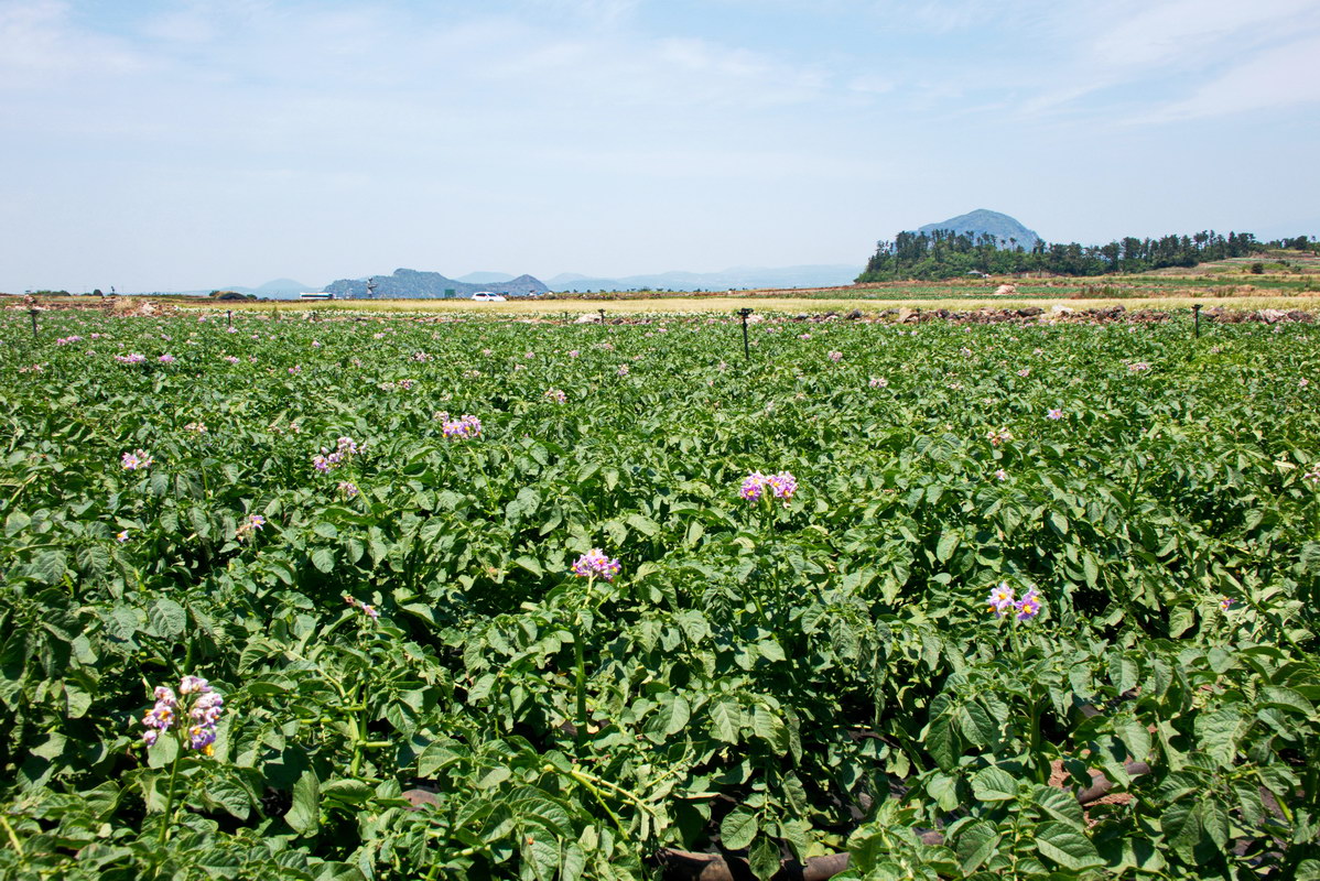 감자꽃; 감자도 꽃이 피고 열매를 맺는다. 흰색과 분홍색, 그리고 자주색 계열의 꽃을 피우는데 제주도에서는 여름과 겨울에 두 번에 걸쳐 수확하므로 꽃도 2차례 핀다. 자주색 꽃을 피우는 것은 자주감자로 늦가을 대정읍 알뜨르 지역에서 주로 볼 수 있다. 감자꽃이 피면 감자라고 부르는 알뿌리가 크게 성장하도록 꽃을 따주기 때문에 감자꽃을 볼 수 있는 기간이 짧다. 꽃을 그대로 두면 방울토마토만 한 열매를 맺지만 알칼리성분의 아린 맛이 나는 독성이 있어 먹지 못하며 유전자 연구 차원에서나 재배한다고 한다. 꽃말은 "당신을 따르겠습니다."