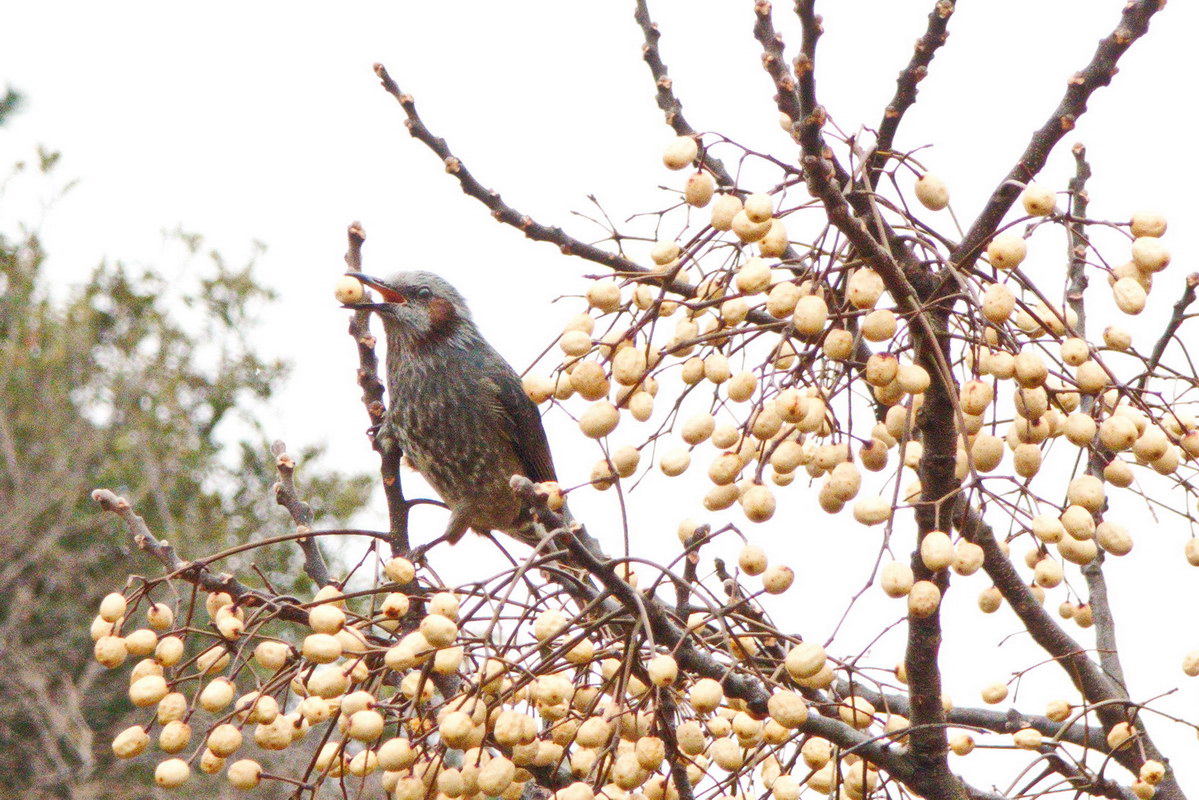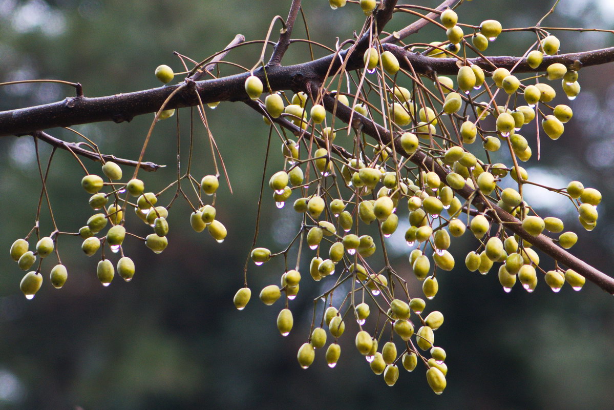 멀구슬나무; 구주목이라는 이름도 있으며 추위에 약해 남부지방에서 주로 자라는 큰키나무로써 제주에서는 멀쿠실낭이라 부른다. 5월에 보라색의 풍성한 꽃을 피우고 가을에 담황색의 열매를 맺는데 다음 해 2~3월까지 열매를 달고 있는 모습을 많이 볼 수 있어 새들의 겨울 양식이 된다. 한방에서는 열매를 천련자, 뿌리껍질을 고련피라 하여 구충제 등 다양한 용도로 사용했는데 최근 치매 치료제로 연구된다고 한다. 꽃말은 "경계"