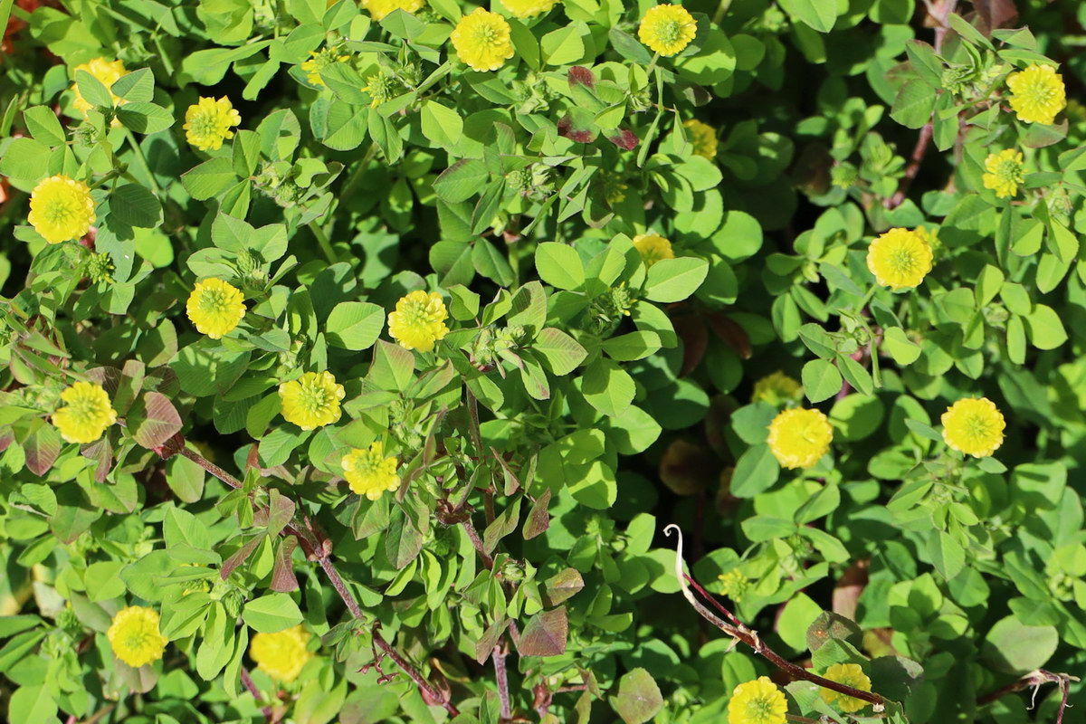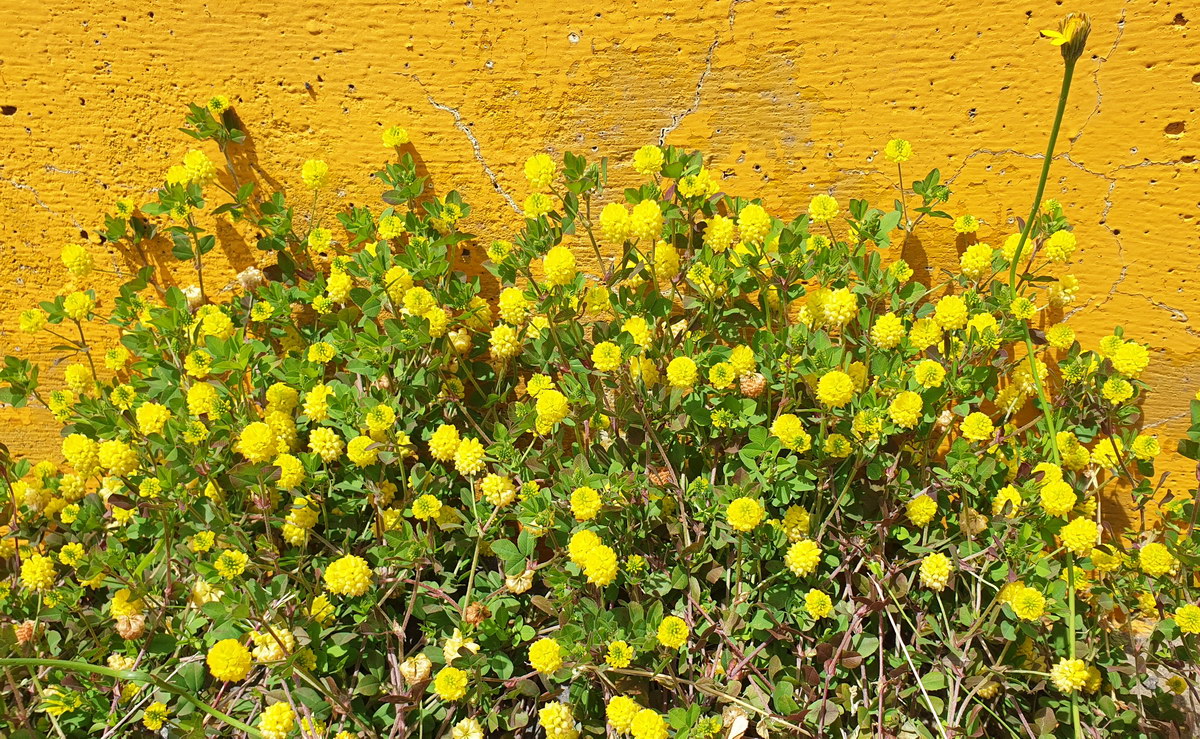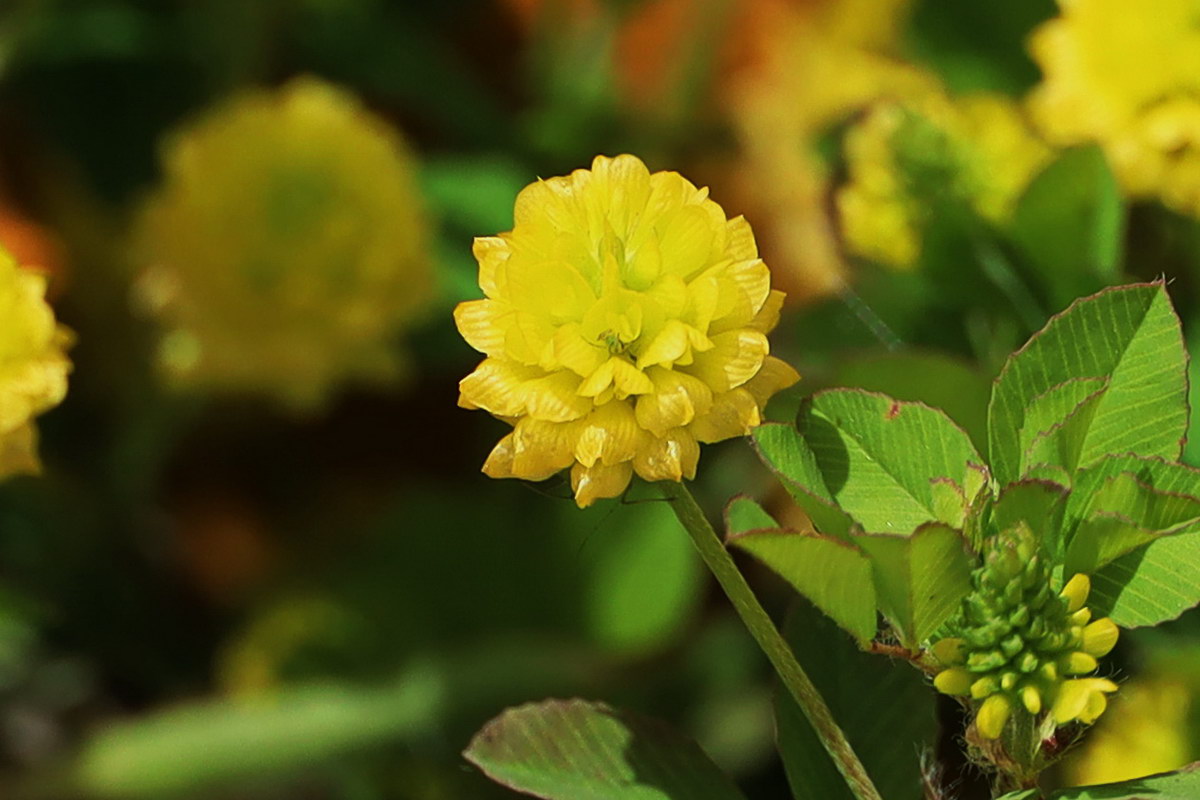 노랑토끼풀; 노란색 꽃이 피는 클로버 종류라는 뜻의 이름으로 북아프리카가 원산지의 한해살이풀로 제주도 구좌지역과 충남의 서산에서 발견된다. 높이 10~25㎝까지 자라며 잎은 어긋나기하고 3개씩 달리는데 네 잎도 있다고 한다. 꽃은 5~6월에 위쪽 줄기의 잎겨드랑이에 달리는 긴 꽃대 끝에 노란색으로 피며, 둥글게 두상꽃차례를 이루고 시들면 갈색으로 변한다. 흔히 보이는 애기노랑토끼풀과 비교할 때 식물체가 크고 꽃차례도 크며 홈이 파이는 점이 다르다고 한다. 꽃말은 “약속, 쾌활”
