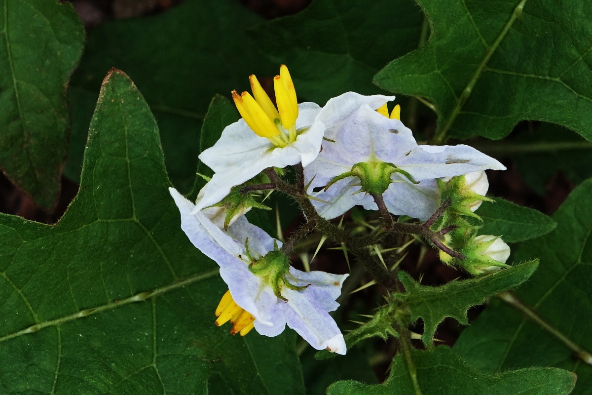 도깨비가지; 목장이나 빈터에서 자라는 북미 원산의 귀화식물이다. 생명력과 번식력이 강해 생태계 교란 식물로 지정되어 있을 뿐만 아니라 줄기와 잎에 날카로운 가시가 많아 혐오감을 주기도 한다. 겨울철에 독성이 강한 노란색의 열매가 많이 달리는데 꽃은 여름에 가지나 감자꽃 비슷한 모양으로 핀다. 제주도에는 더 큰 왕도깨비가지도 번성하고 있다. 꽃말은 '믿을 수 없음“