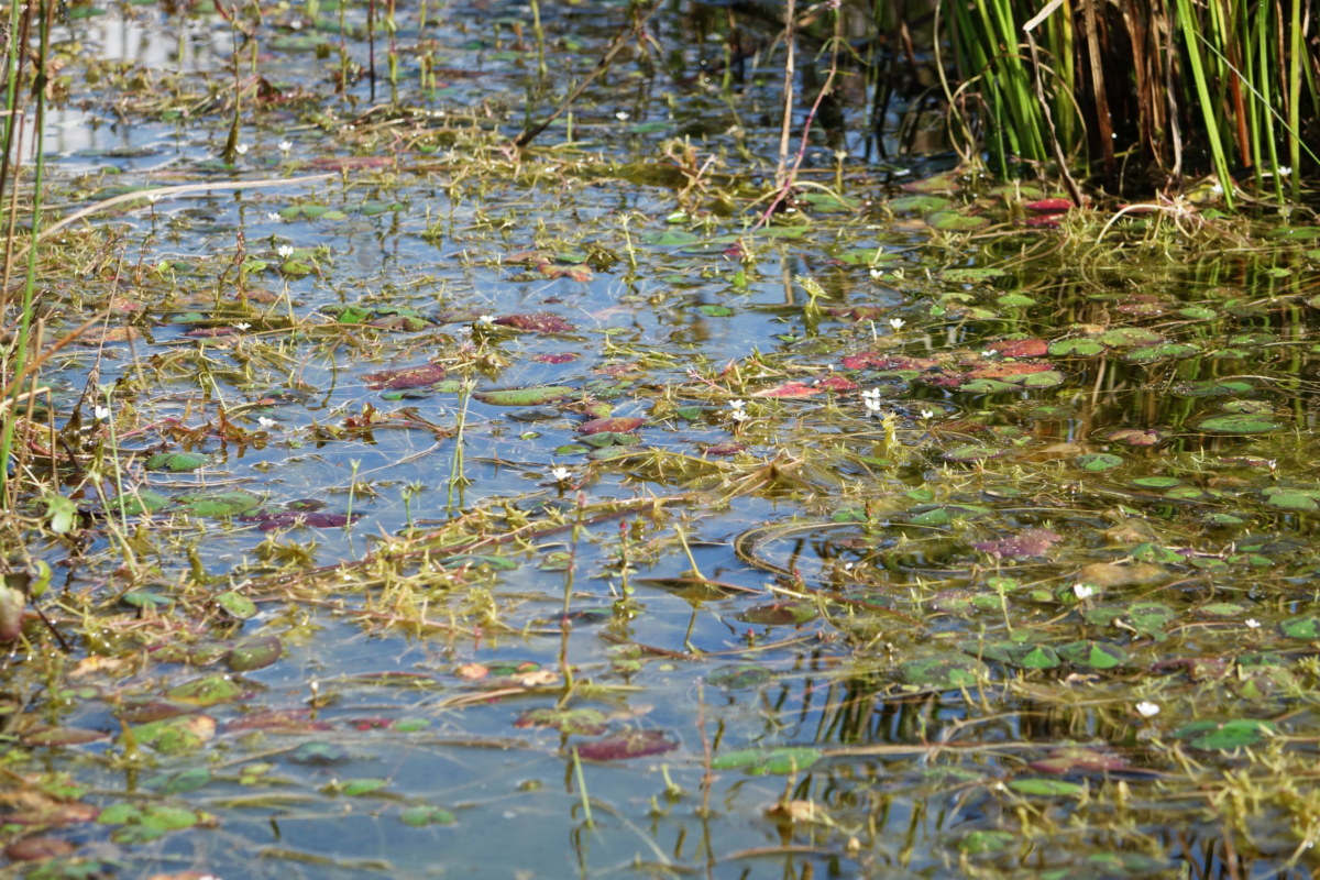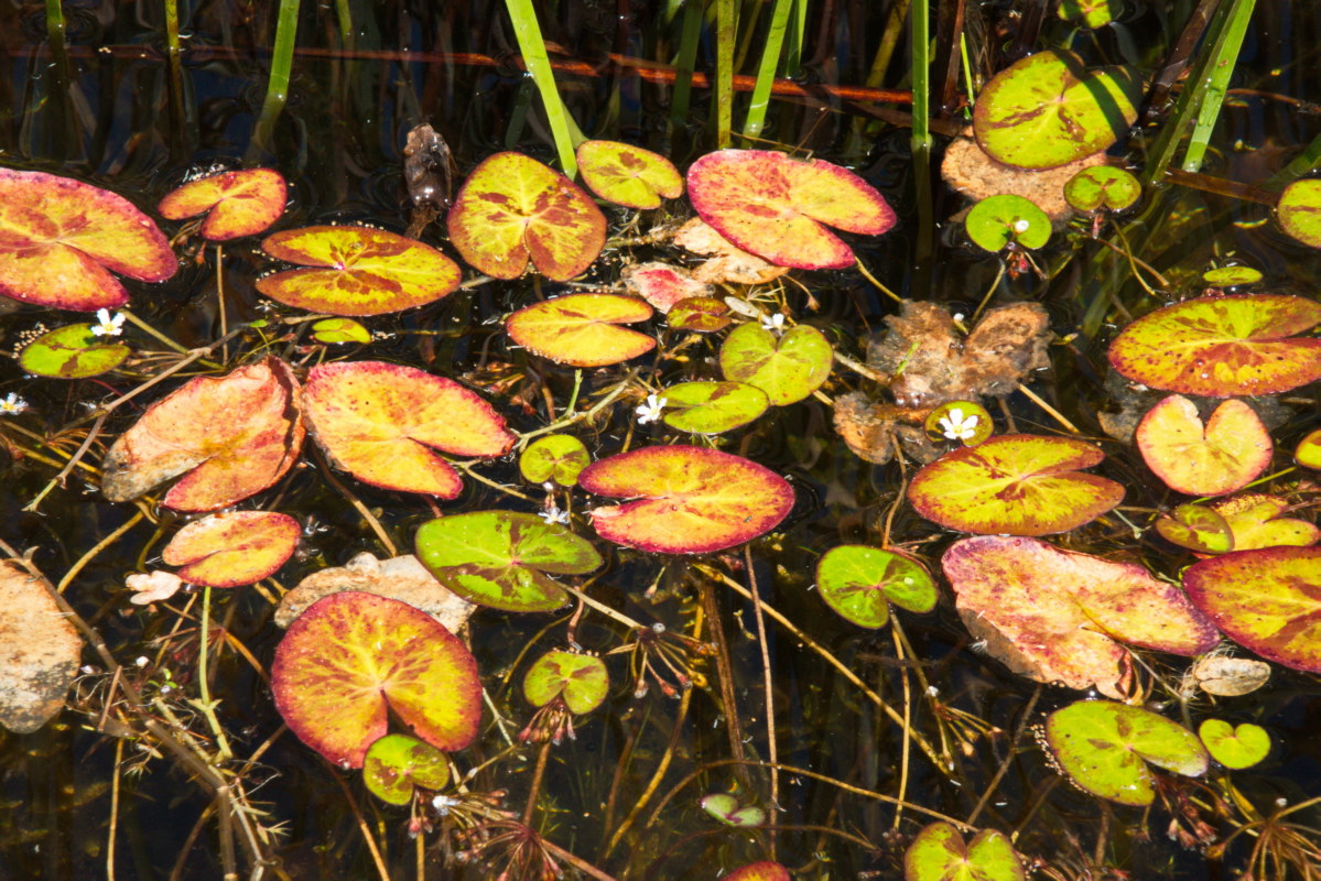 좀어리연꽃; 작은 연못에서 자라는 조름나물과의 여러해살이 수초로 애기어리연꽃이라고도 한다. 잎이 수면 위에 떠서 심장 모양 또는 달걀형으로 지름이 2~6cm 정도, 높이 1~10cm로 자라는데 일부는 가을에 단풍이 들어 연못을 붉게 물들인다. 어리연꽃보다 작은 꽃이 6~7월 흰색으로 핀다고 도감에 쓰여 있지만 제주도에서는 8월부터 11월까지 노란 꽃술 박힌 흰꽃을 볼 수 있다. 꽃말은 “청순한 사랑”