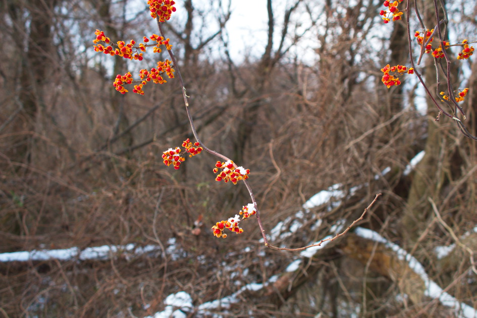 노박덩굴; 숲 가장자리나 산비탈에서 자라는 덩굴성 낙엽 지는 목본으로 길에서 머문다는 노박(路泊) 의미가 있고 노박따위나무·노방패너울·노랑꽃나무라는 이름도 있다. 주로 다른 나무를 감고 오르거나 돌무덤 등지에서 왕성한 생육을 과시하며 지름 40cm, 길이 10m까지 자라는 것도 있다. 꽃은 5~6월에 황록색으로 피지만 작고 볼품이 없는데 대신 겨울철에 열매가 빛을 발휘한다. 한방에서는 남사등이란 약명으로 생리통 등에 사용했다고 한다. 꽃말은 “진실, 명랑”