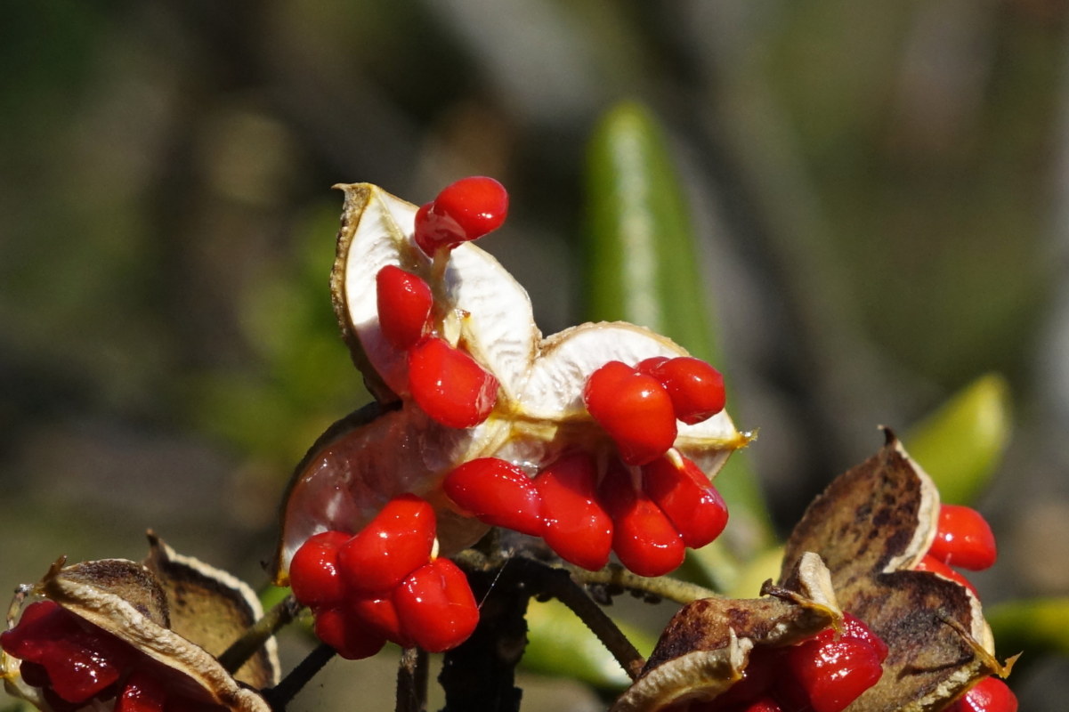 돈나무; 남쪽 섬 지역 바닷가나 산기슭에서 자라는 상록성 관목으로 섬음나무, 갯똥나무 등 지역에 따라서 여러 가지 이름으로 불린다. 열매가 갈라지면 파리가 많이 모여드는 모습을 보고 제주도에서 똥낭(낭=나무)이라고 부른 것이 돈나무로 명명되었다고 한다. 화분에 가꾸는 금전수(돈나무)와는 다르다. 봄에 피는 꽃이 향기가 좋아 만리향으로도 부르고 한방에서는 칠리향이라는 이름으로 고혈압 등에 사용했다고 한다. 꽃말은 "포용"