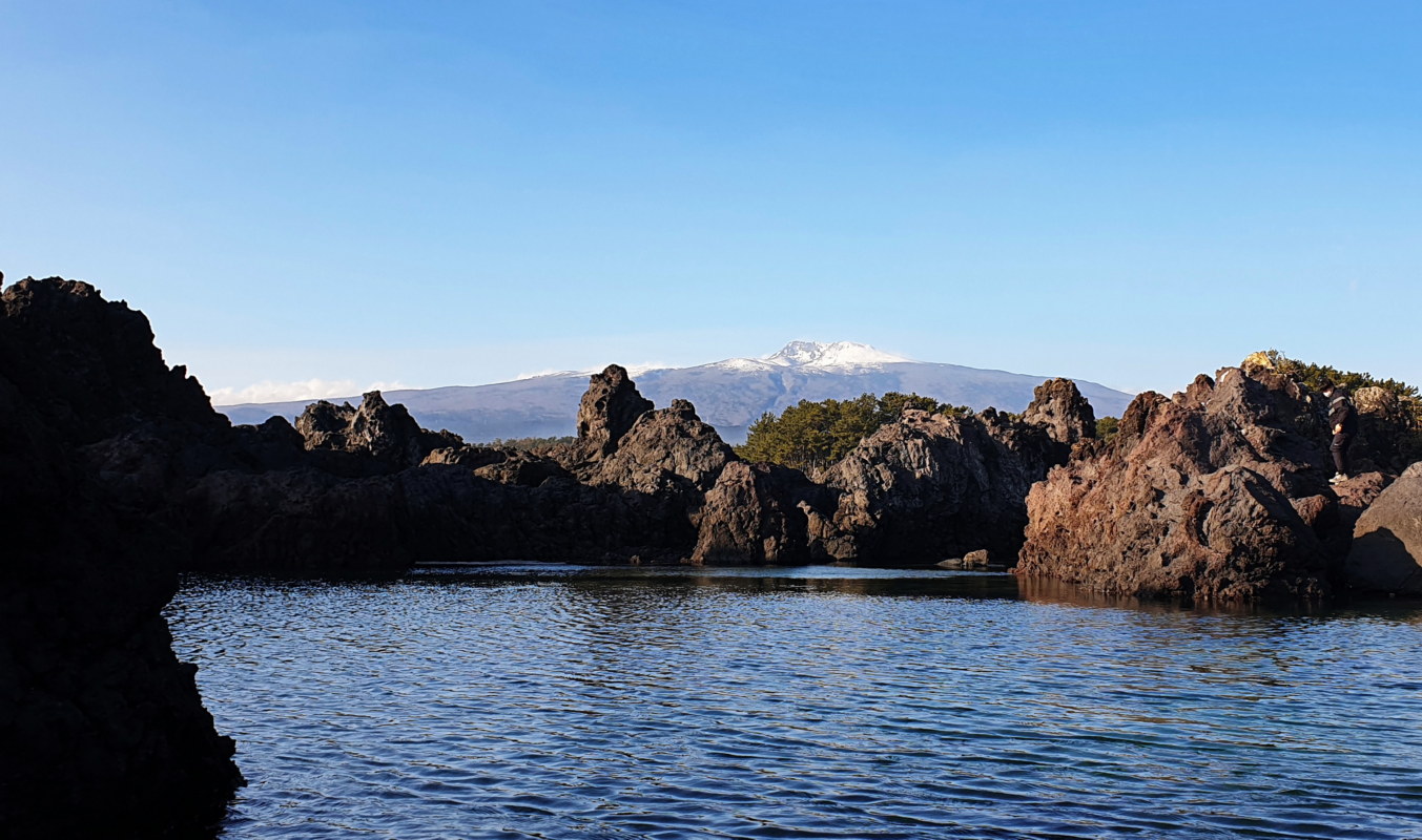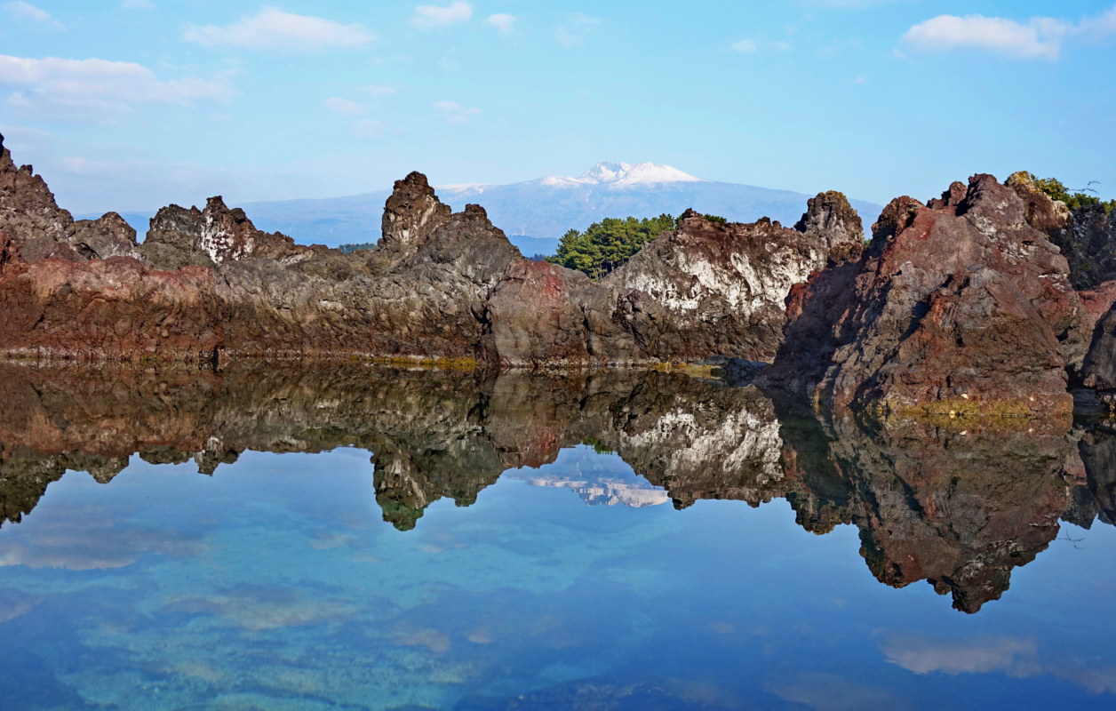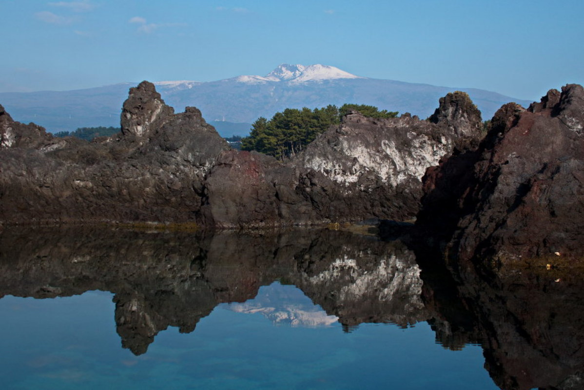 <소천지; 서귀포시 보목동 바닷가에 있으며 갯바위에 둘러싸여 만들어진 작은 호수가 백두산 천지 형태를 보여 소천지라는 이름이 붙었다. 물은 얕지만 눈 쌓인 한라산 반영 모습이 백미로 알려져 있는데 밀물과 썰물의 시간대 및 바람에 의한 잔물결로 사진 촬영이 어렵다.>