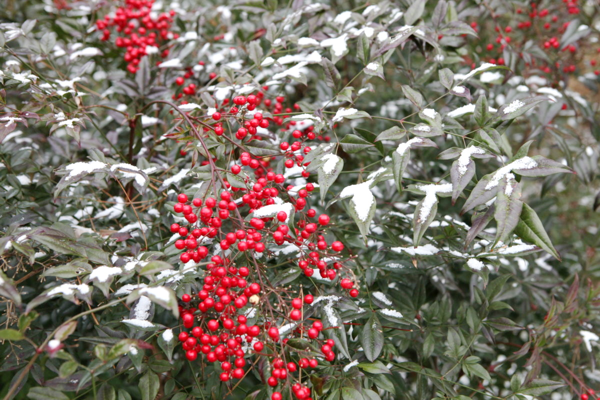 남천; 남부지방 따뜻한 곳에서 자라는 상록활엽관목으로 남천죽이라고도 한다. 잎이 미려하고 꽃과 단풍과 열매도 일품이므로 관상용으로 많이 심는다. 7~8월에 흰색의 꽃이 피고 가을에 단풍이 들며 겨우내 빨간 열매를 볼 수 있다. 열매는 남천실이란 이름으로 감기 등 다양한 용도로 사용된다. 꽃말은 "전화위복"