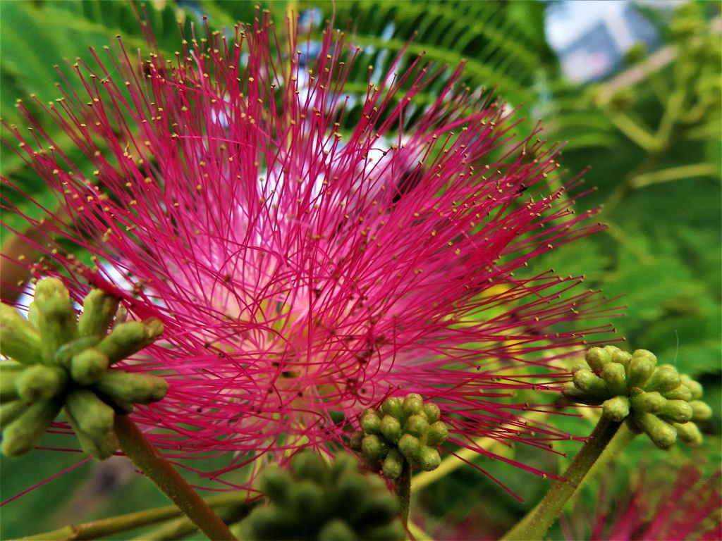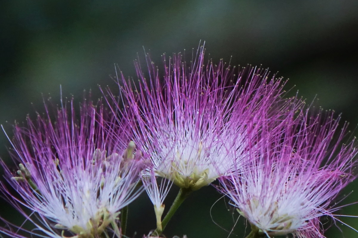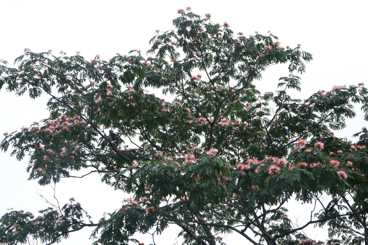 자귀나무; 부부의 금실을 뜻하는 합환수, 합혼수라고도 하고 소가 잘 먹는다고 하여 소쌀나무라고 부르는 곳도 있고 제주도에서는 귀신나무라고 한다. 자귀의 손잡이를 만드는 데 사용하여 자귀나무가 되었다고 한다. 여름에 밝고 고운 연분홍 꽃을 한 달간 피우는데 가을에 콩 꼬투리 형태의 열매가 된다. 해가 지면 잎이 접히는 특징이 있다. 껍질을 약재로 사용한다고 한다. 꽃말은 “가슴이 두근거림, 환희”