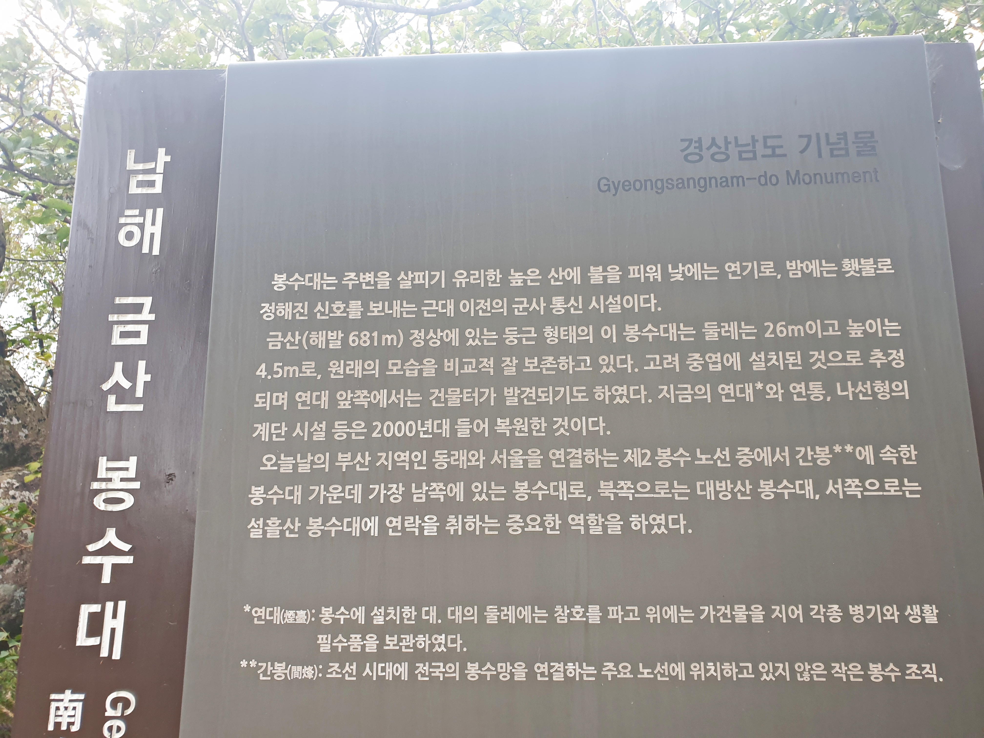 금산의 해발이 681m임을 표시하고 가장 남쪽의 봉수대임을 알린다.