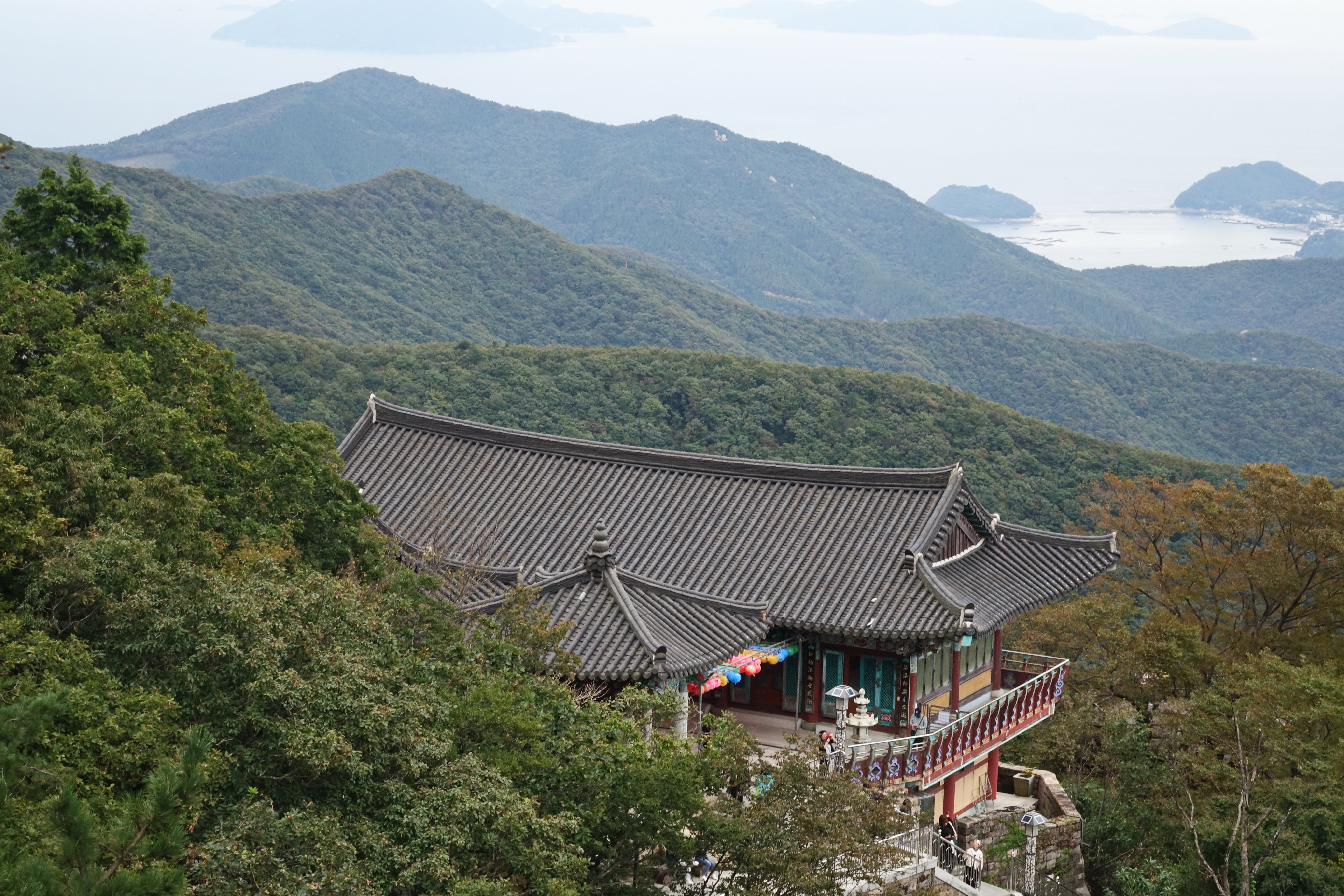 저 아래 멀리 사찰의 지붕이 보이기 시작한다.