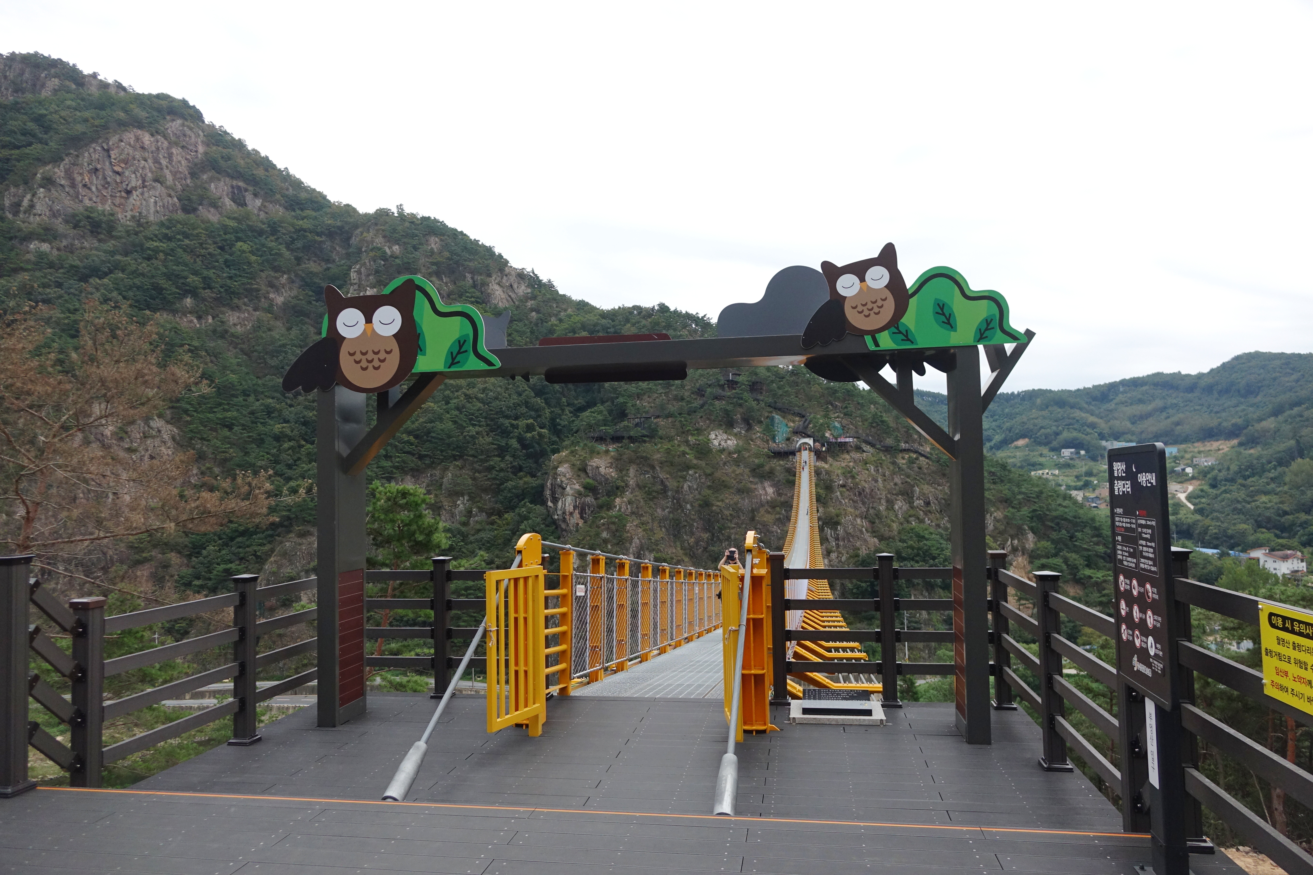 부엉산 쪽에서 건너는 출렁다리, 부엉산임을 알리기 위해 부엉이 잠 자는 모습이 보인다.