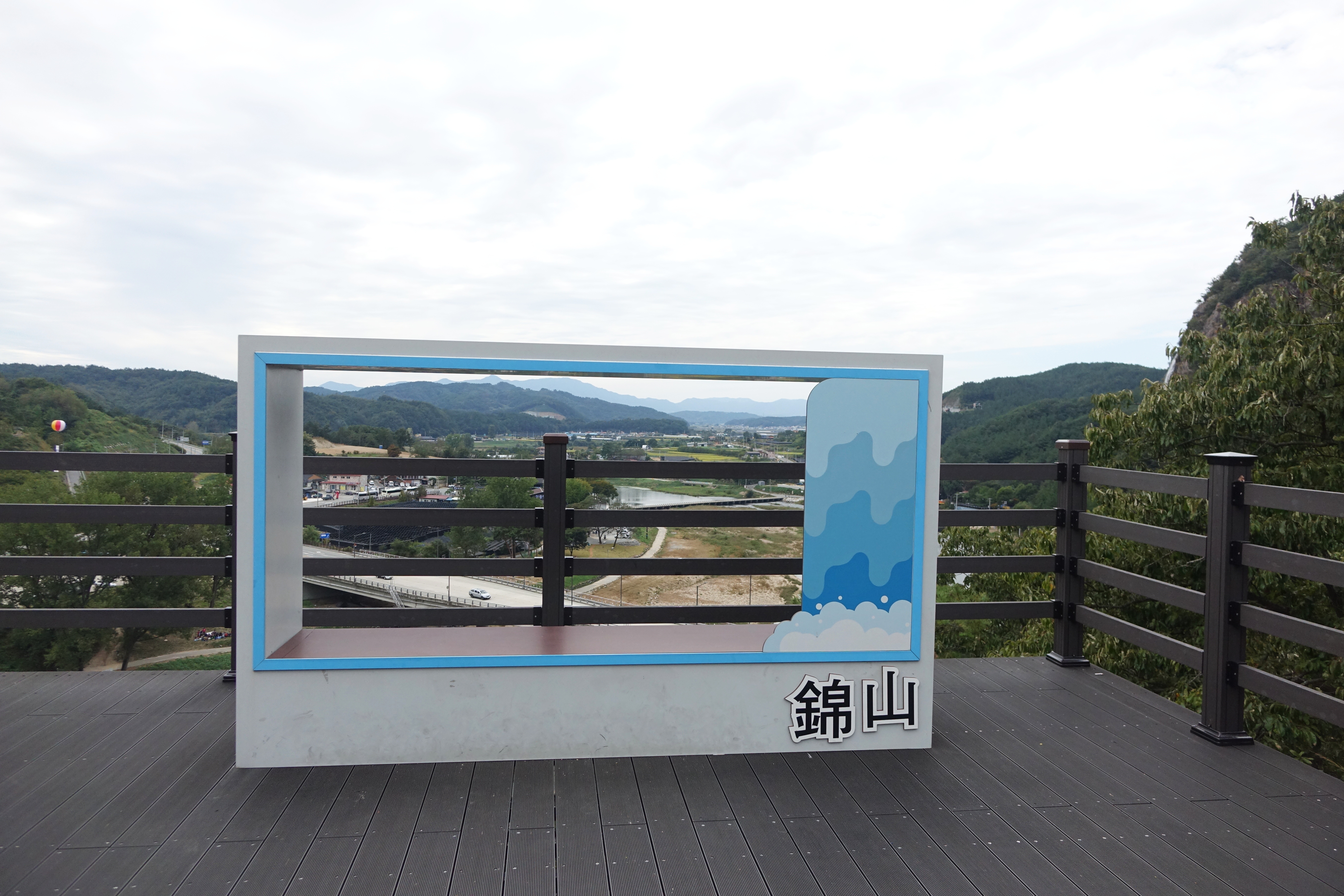금산 시내 방향으로 인공폭포 아래에 강 따라 데크길이 조성되어 있다.