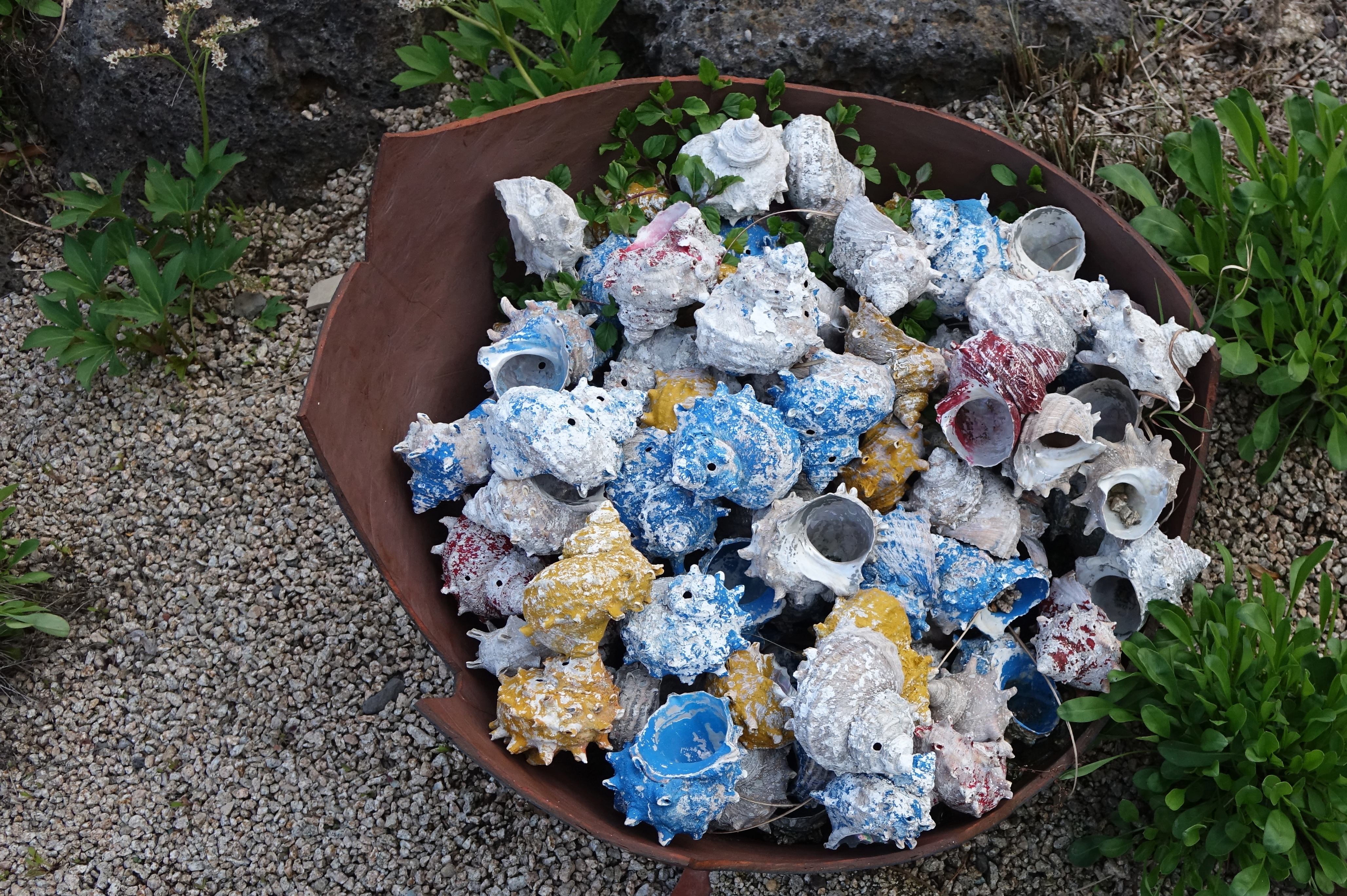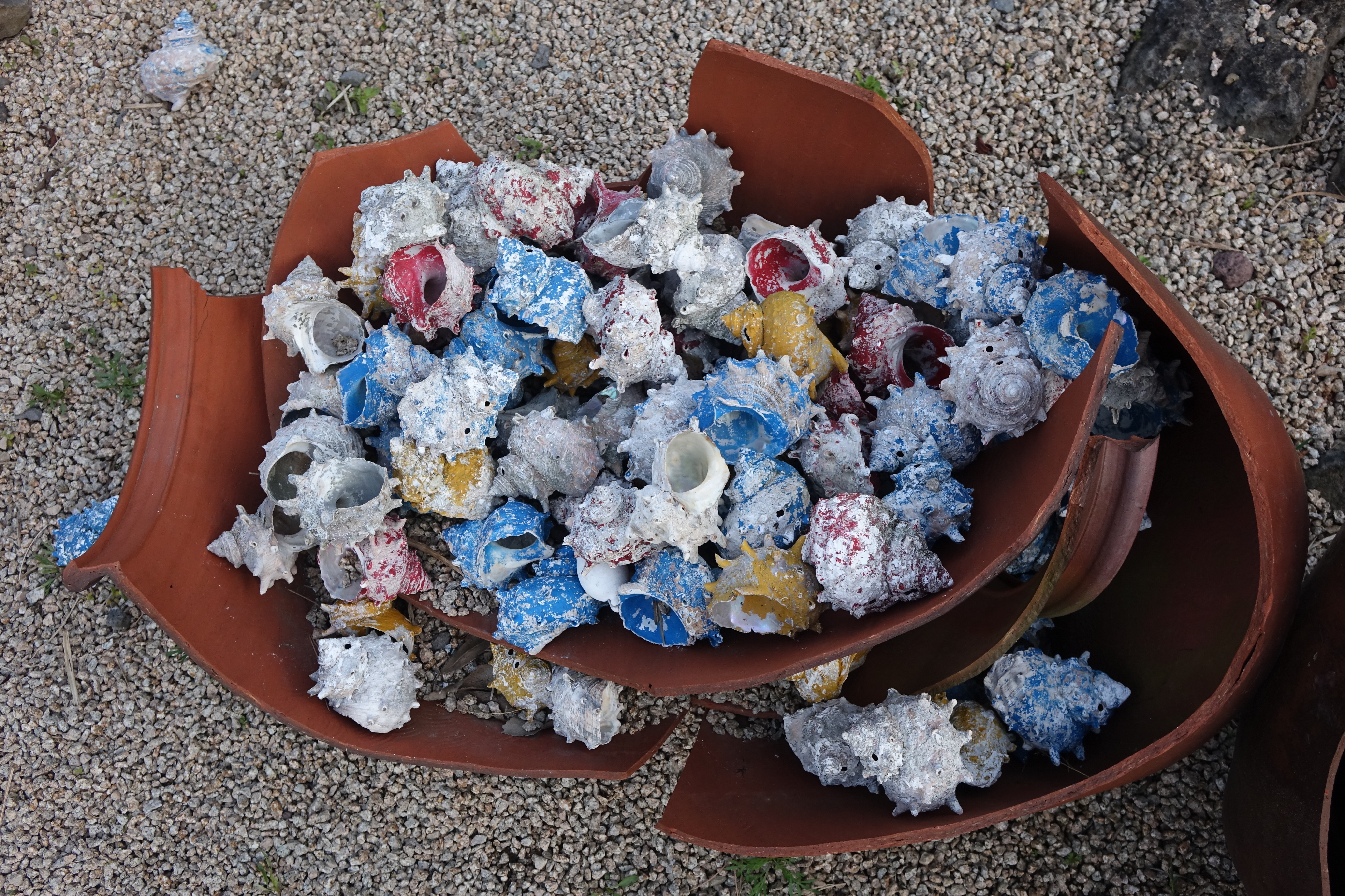 깨진 항아리에 색칠한 소라 껍질을 놓아두면