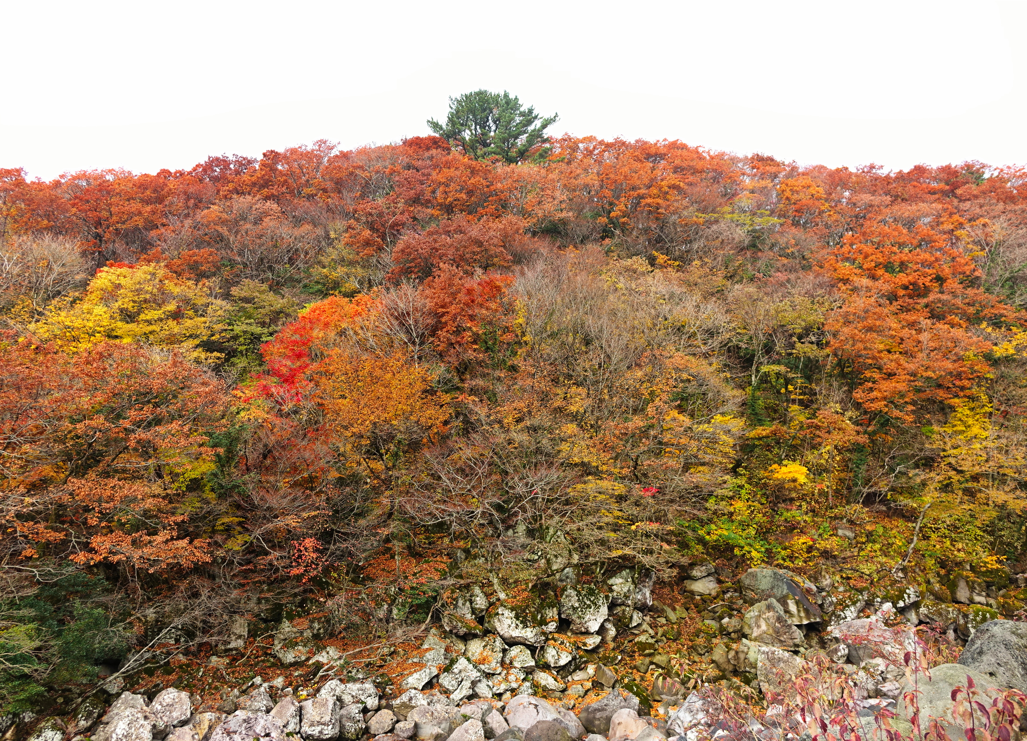 <제주도에서 가을 단풍으로 알아주는 천아계곡의 산등성이에 홀로 푸르름을 자랑하며 우뚝 솟아 있는 소나무>
