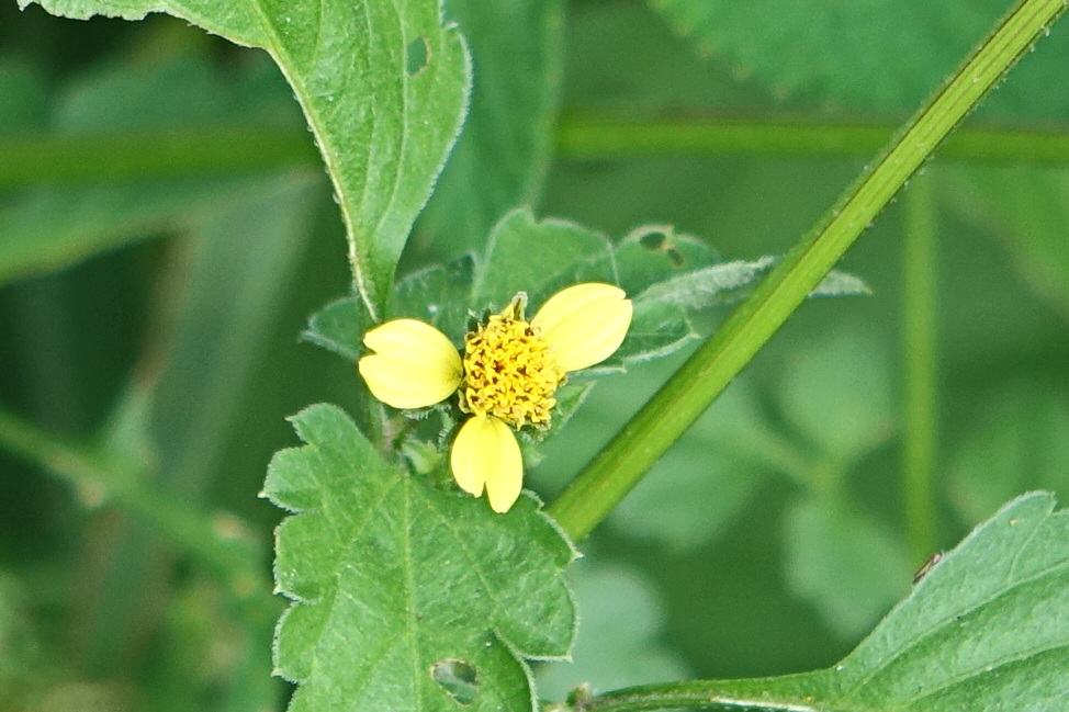 도깨비바늘; 도깨비풀, 털가막살이, 차귀사리 등으로도 불린다. 동물의 몸에 씨앗을 붙여 종족을 번식시키는 대표적인 식물이다. 가시 돋친 열매를 맺는 통꽃 주변에 1 ~3개의 혀꽃(설상화)를 갖고 있는데 혀꽃이 없는 것은 울산도깨비바늘이라고 하며 제주도에서는 가을과 겨울철에 많이 보인다. 어린잎은 식용하고 전초는 생즙을 내어 독충에 물리거나 상처 난 데 발랐다고 한다. 한방에서는 귀침초란 이름으로 백반증, 청혈, 해독, 통풍, 간염 등에 처방했는데 최근에는 항암제로 연구된다고 한다. 꽃말은 "흥분"