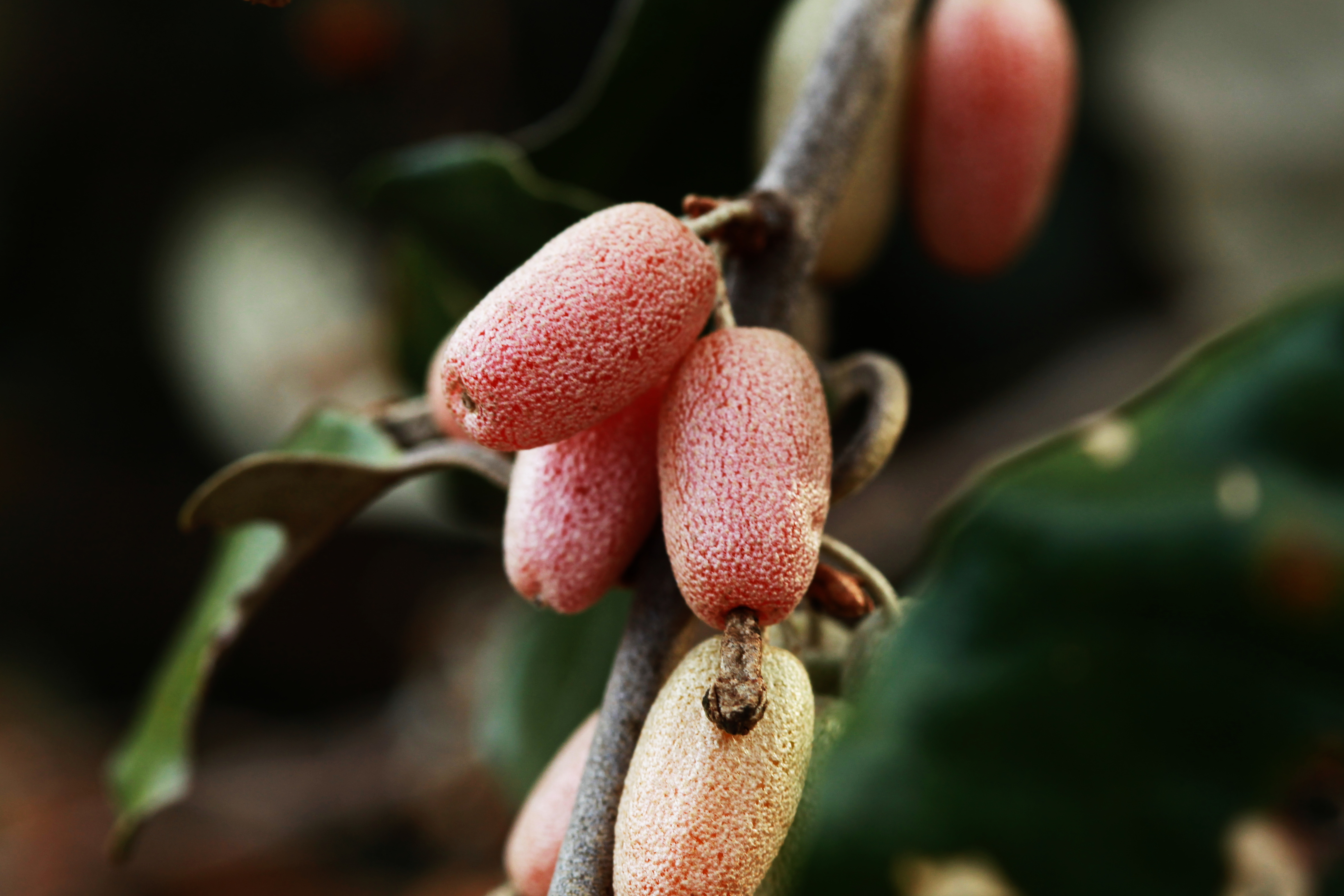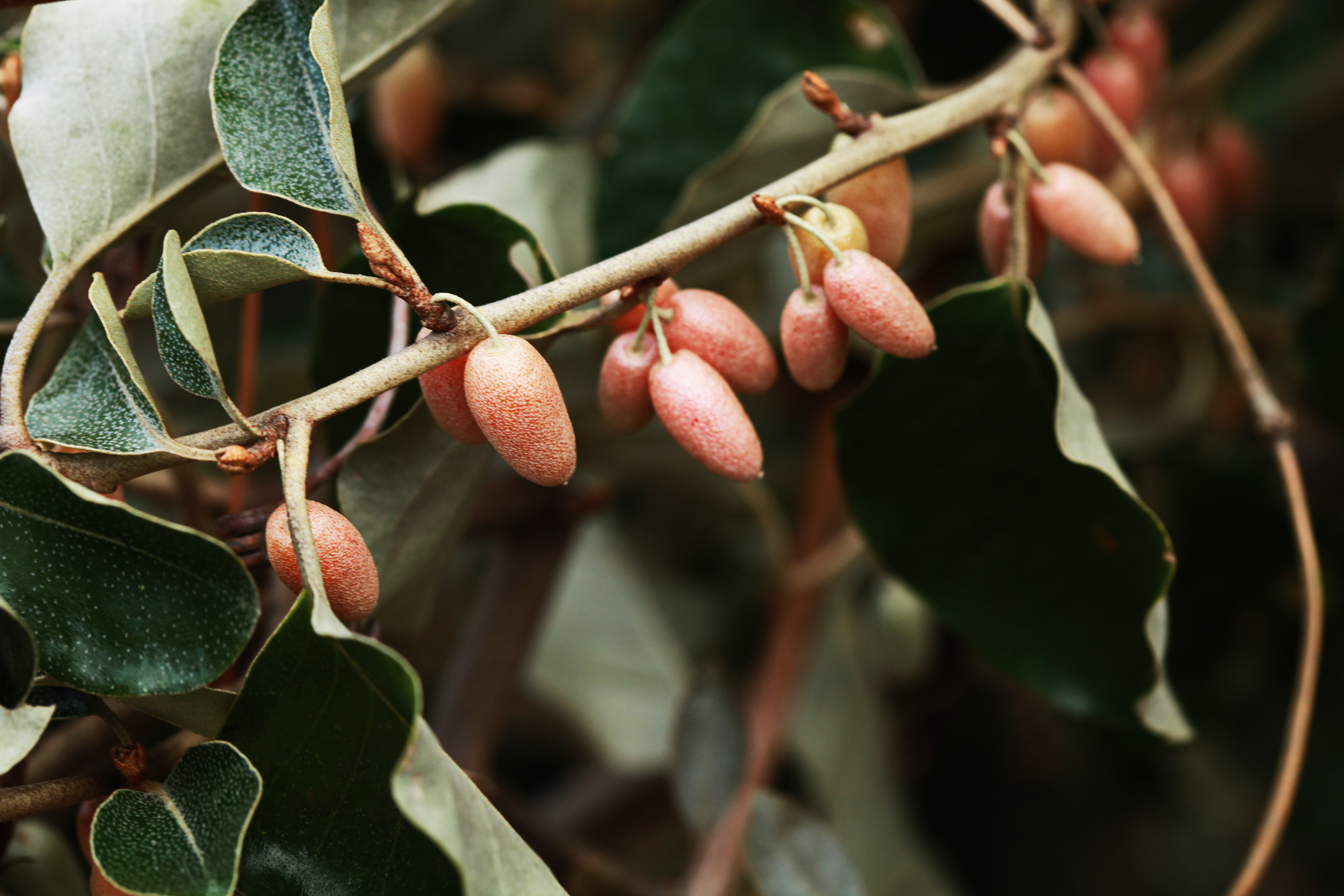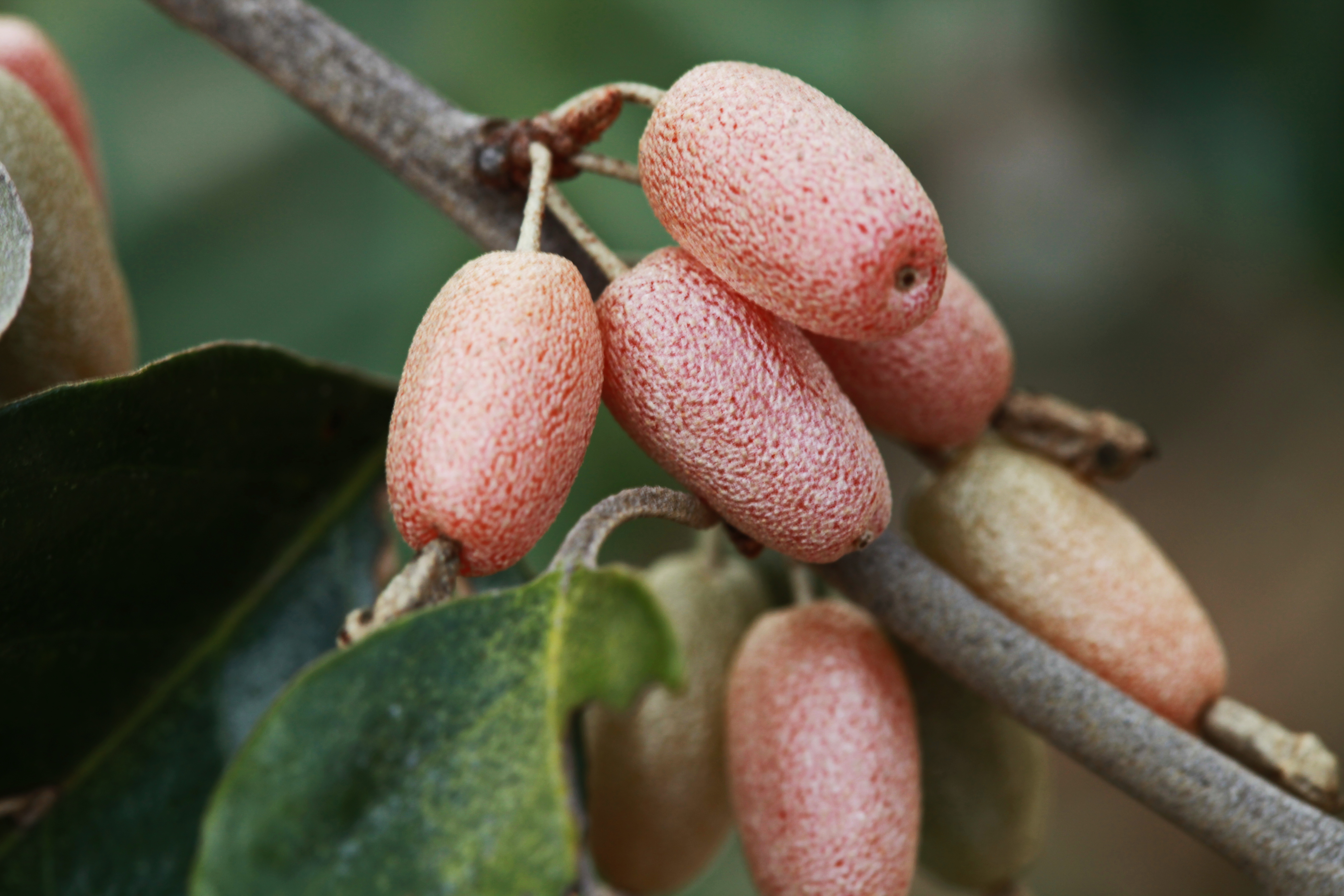 잎은 어긋나며 넓은 달걀형이다. 표면에 은백색 인모가 있으나 차츰 떨어진다. 뒷면에는 은백색 인모가 밀생하여 잎 뒷면이 은백색으로 보인다. 꽃은 10∼11월에 잎겨드랑이에서 백색 또는 연한 황백색의 양성화가 1∼3개씩 모여 달린다. 열매는 타원형이고 이듬해 3∼4월에 적색으로 익는다. 열매는 먹을 수 있으며 표면에 은백색 인모가 밀생한다.