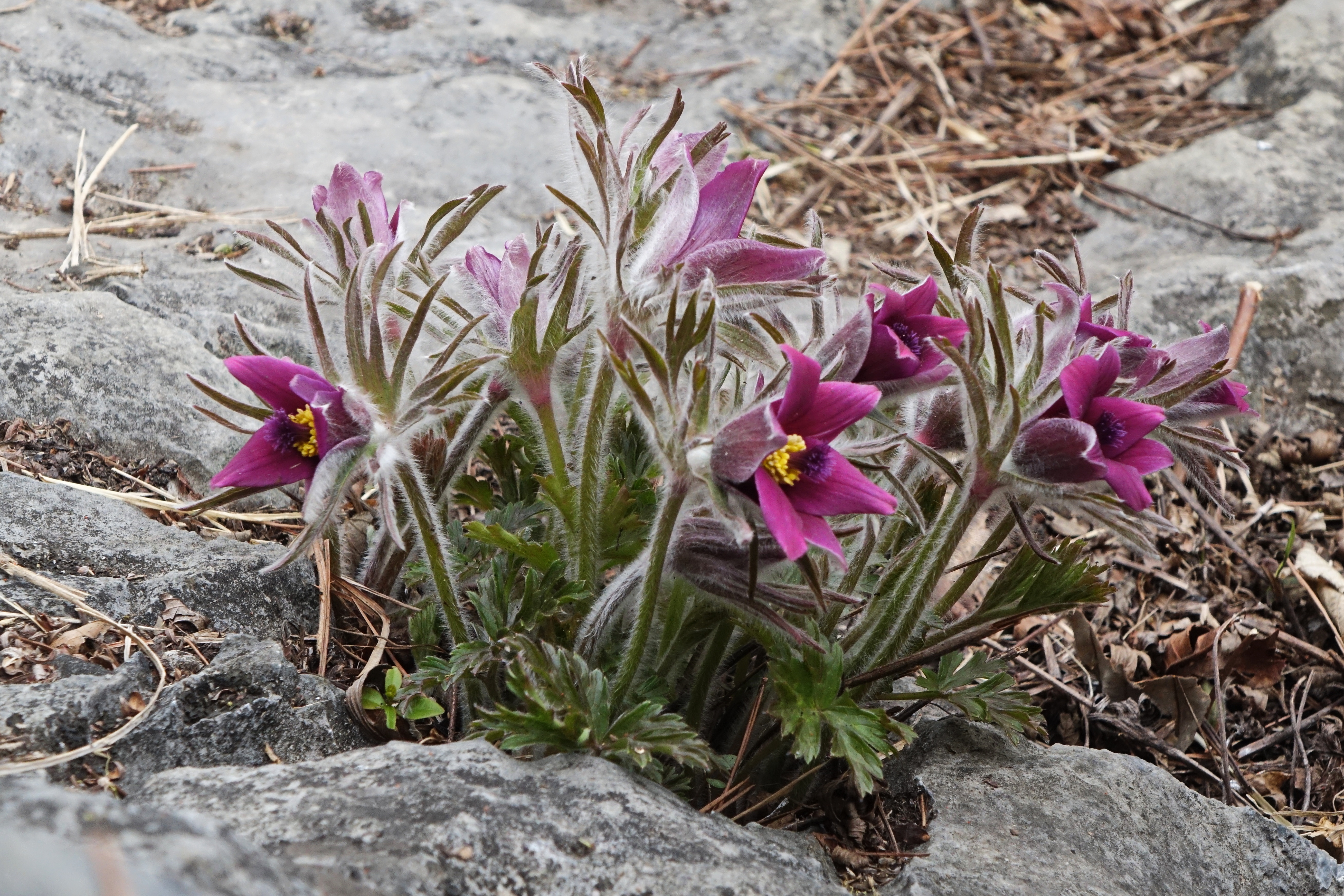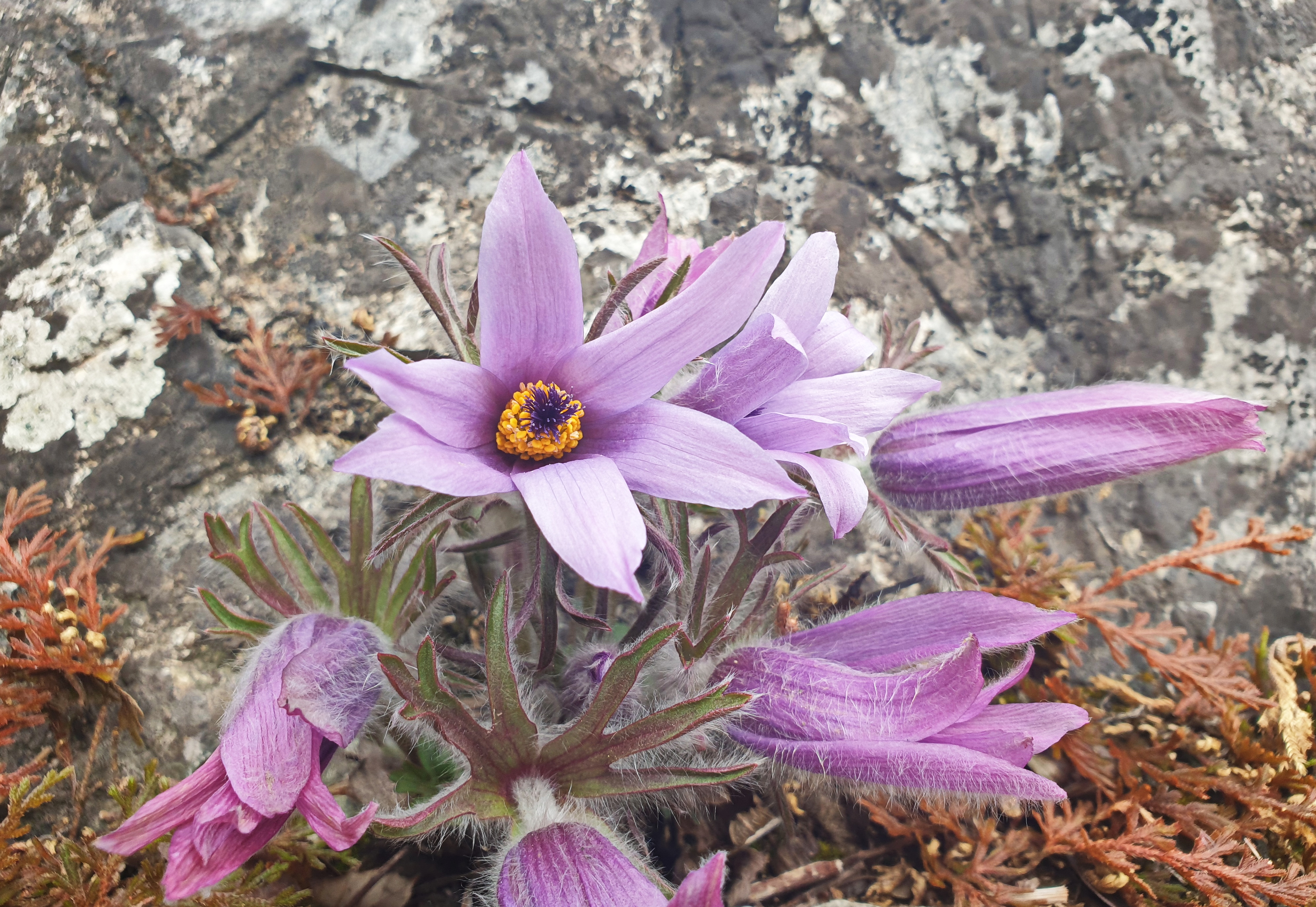 꽃은 4월에 피고 꽃줄기 끝에서 위를 향해 1개씩 달리며, 자주색, 홍자색, 분홍색, 흰색 등으로 핀다. 꽃줄기는 중앙부에서 나오고 길이 15∼20cm이다. 작은포는 꽃대 밑에 달려서 3개로 갈라지고 다시 잘게 갈라지며, 겉에 흰 털이 빽빽이 난다. 화피갈래조각은 6개이고 긴 타원형이며, 길이 3.5cm, 나비 1.2cm이다. 겉에 털이 있으나 안쪽에는 없다. 열매는 수과로서 긴 달걀 모양이며 끝에 4cm 내외의 암술대가 남아 있다.