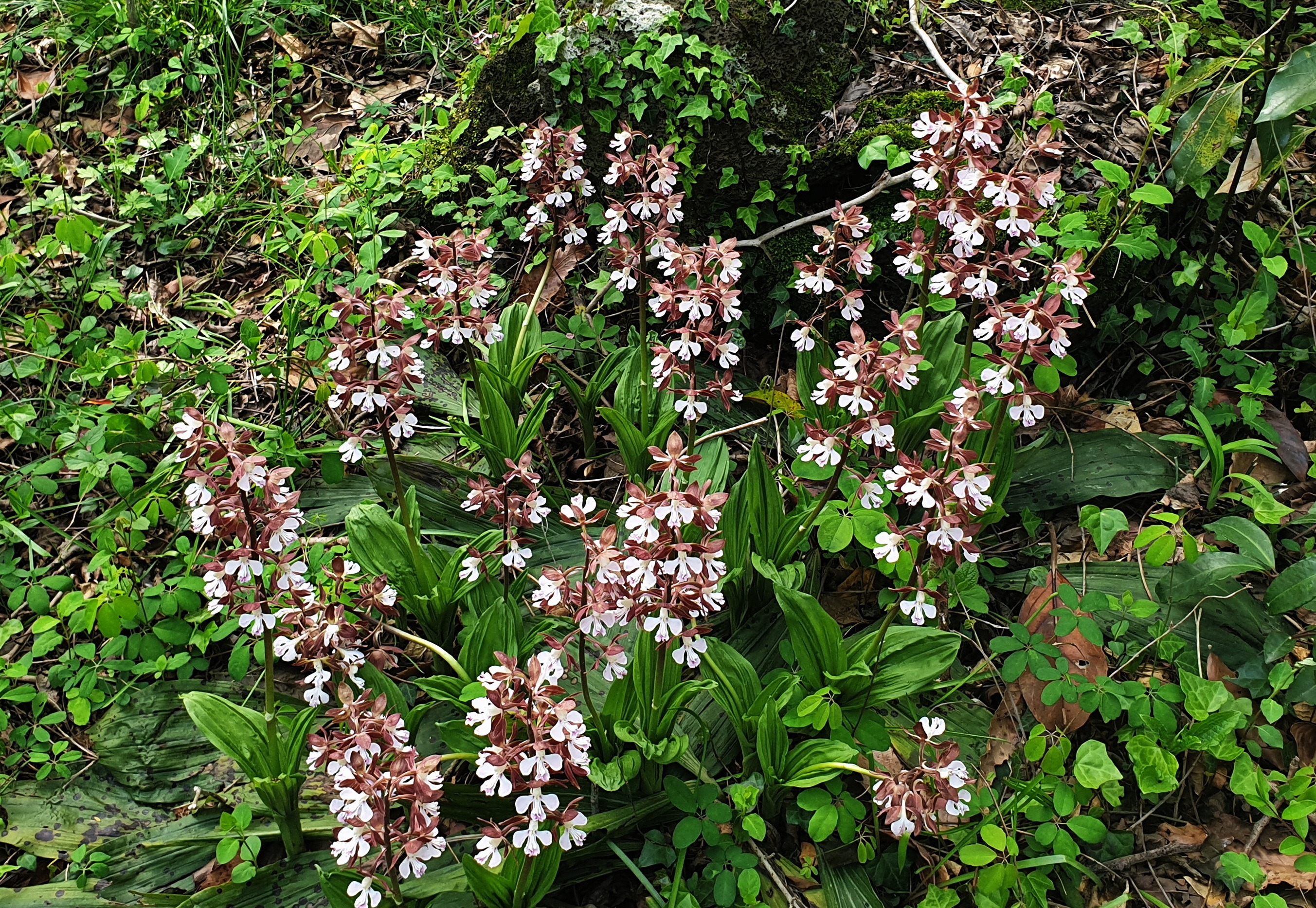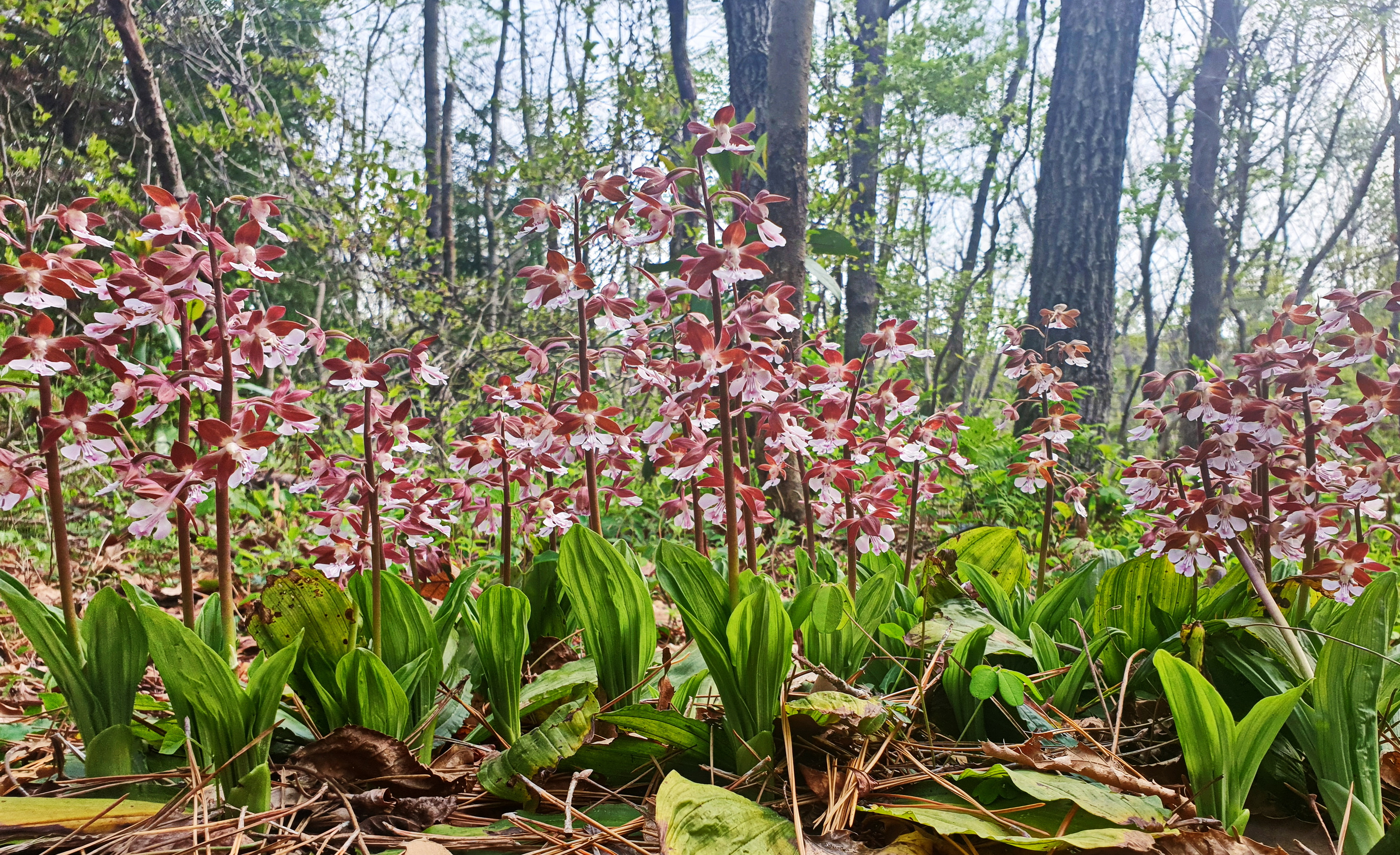 새우난초; 제주도와 안면도 및 일부 남부지방의 숲속에 자라는 야생이란 이다. 잎이 긴 타원형 모습이며 양 끝이 좁고 주름이 잡혀있다. 뿌리줄기가 새우등처럼 생기고 새우 몸통 같은 마디가 있다고 하여 이름이 붙었다. 구자연환초란 생약명으로 편도선염 등에 썼다고 한다. 꽃말은 "겸허, 성실“