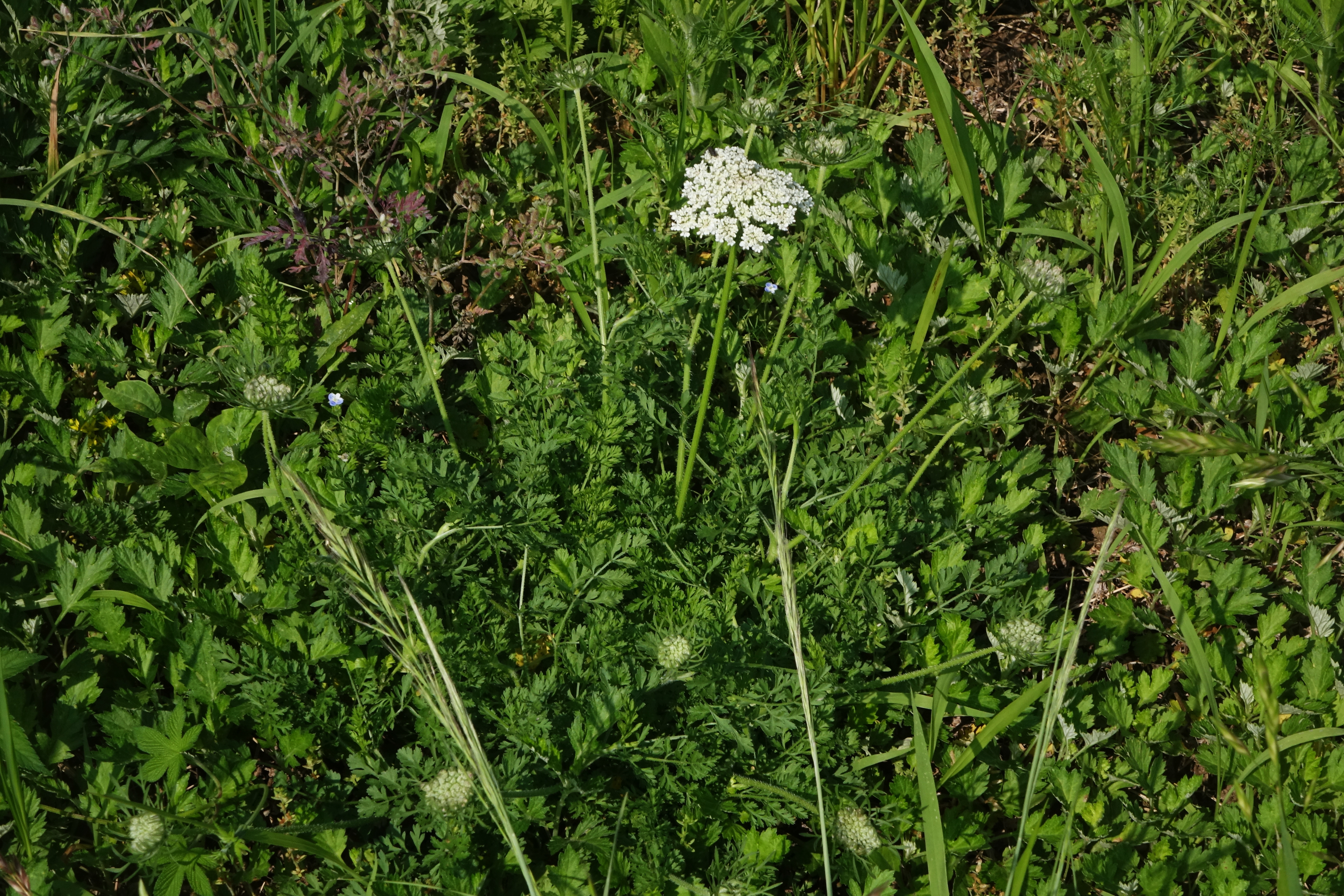 산당근; 잎과 꽃이 당근과 조금 비슷하기는 하나 키는 훨씬 크고 당근 같은 뿌리는 없는 여러해살이풀로 유럽 등지에서 들어 온 귀화식물이라고 한다. 들어 온 시기나 사는 곳도 불분명하나 앞으로 여기저기서 발견될 가능성이 크다고 한다. 당근은 중앙아시아가 원산지로 홍당무란 뿌리를 말하기도 하는데 조선 말기에 들어 온 왜래 식물로 귀화식물이라는 점에서 산당근도 같다고 할 수 있다.