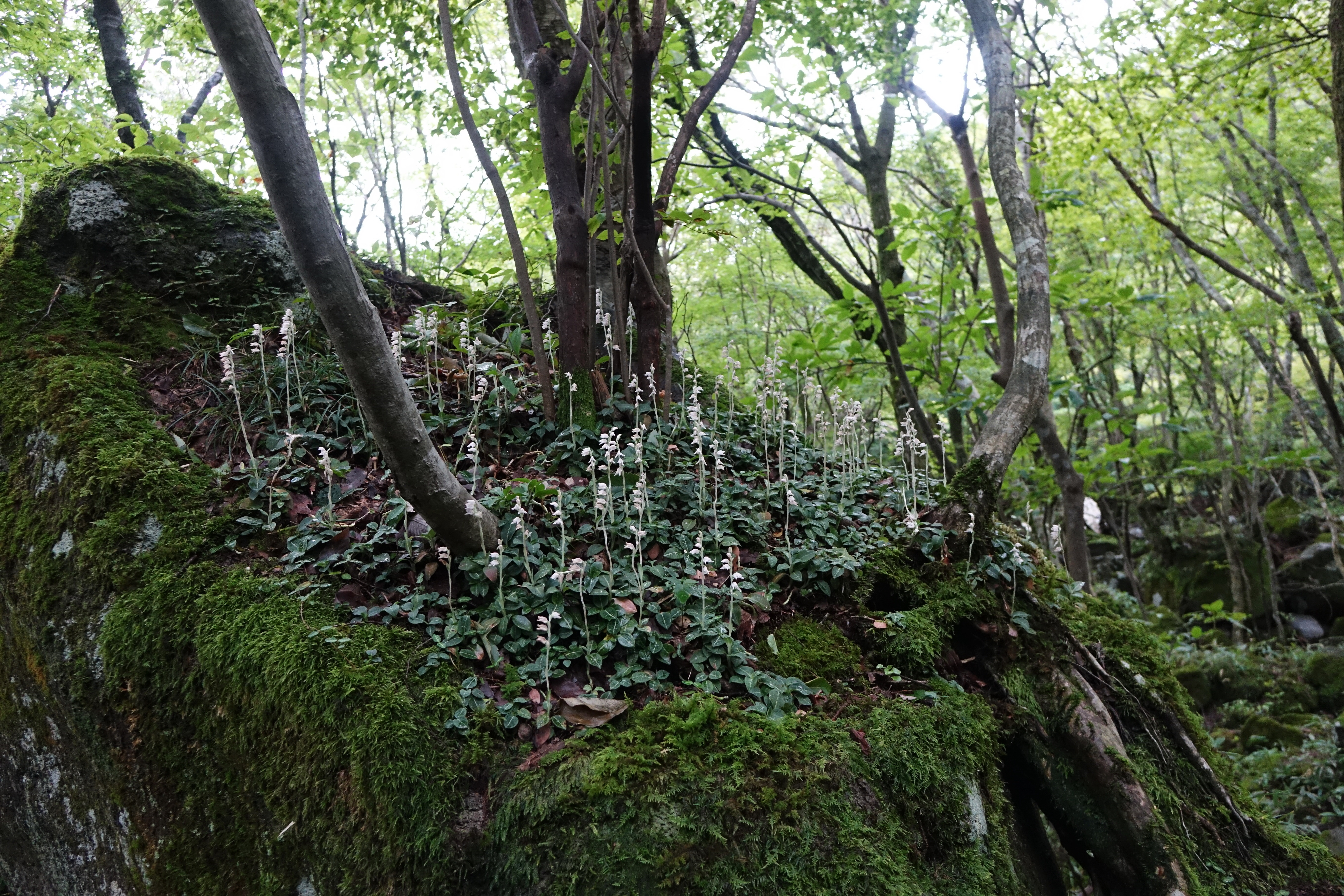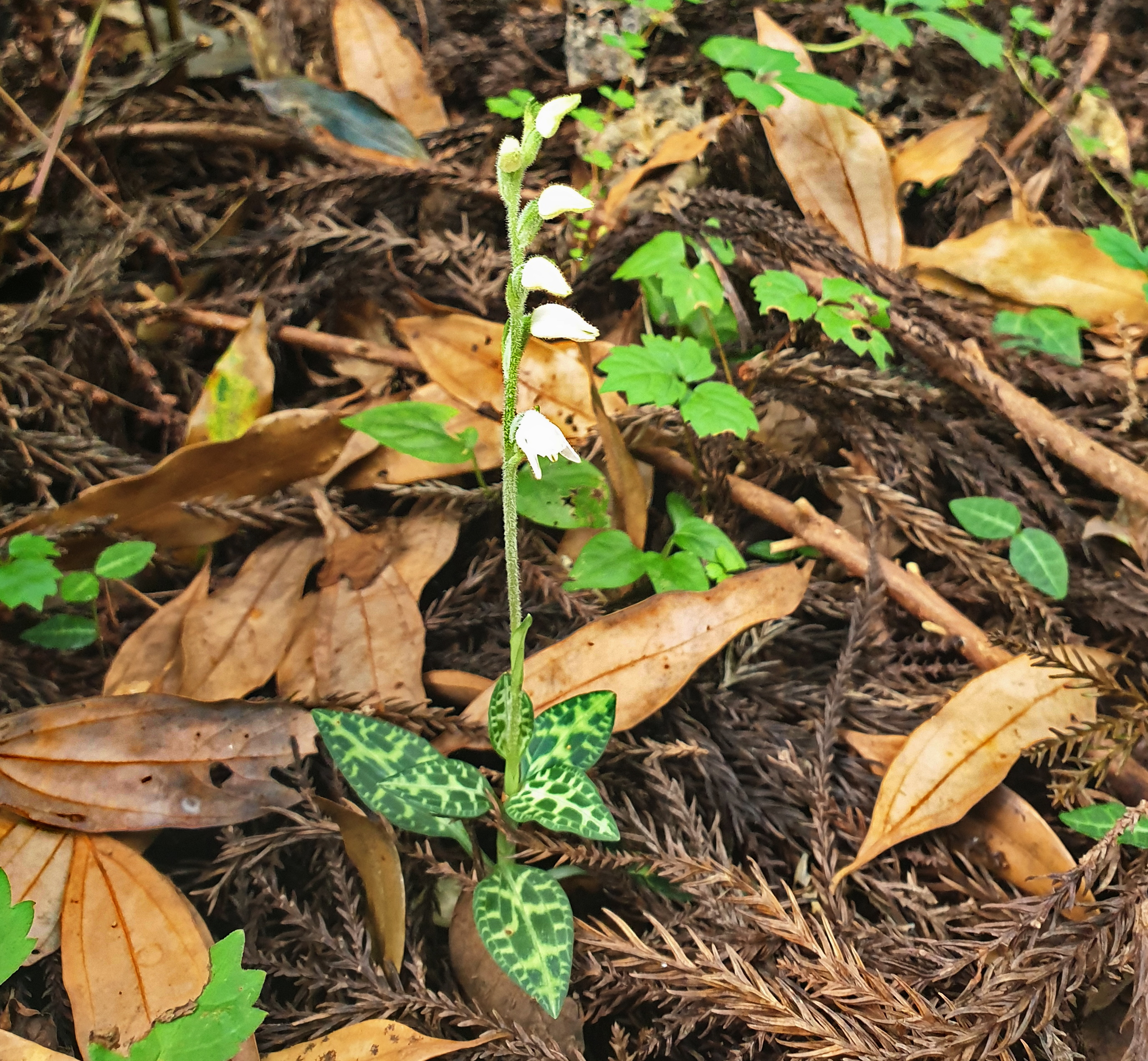 사철란; 이파리 무늬 때문에 알록난초라고도 하는데 깊은 숲의 약간 건조한 땅에서 자라는 여러해살이풀이다. 8~9월에 피는 꽃은 흰색 바탕에 붉은색 점이 있고 7~15개가 한쪽으로 치우쳐 달린다. 붉은사철란, 털사철란, 섬사철란 등의 깃대종이다. 꽃말은 "숲속의 요정"