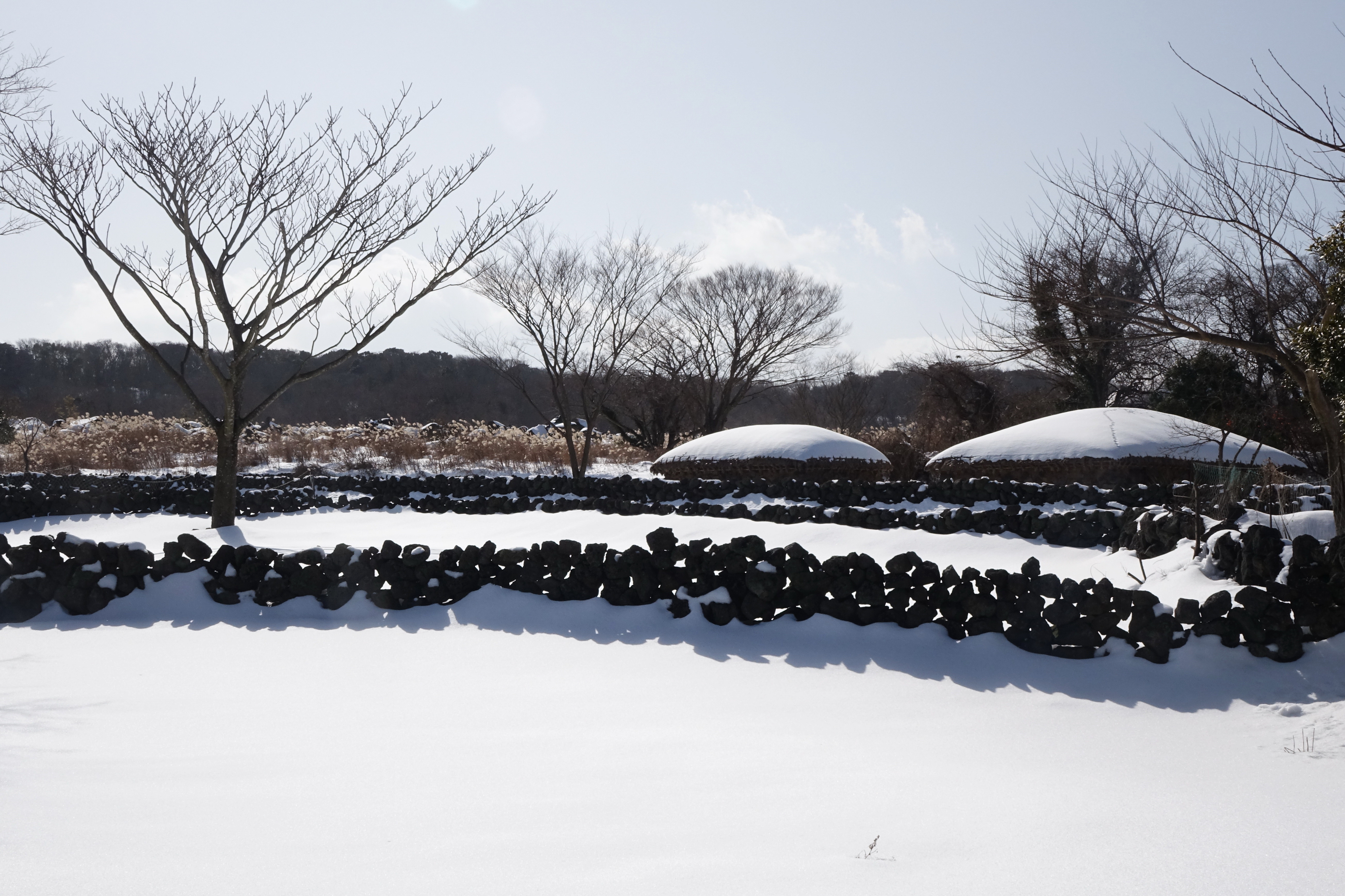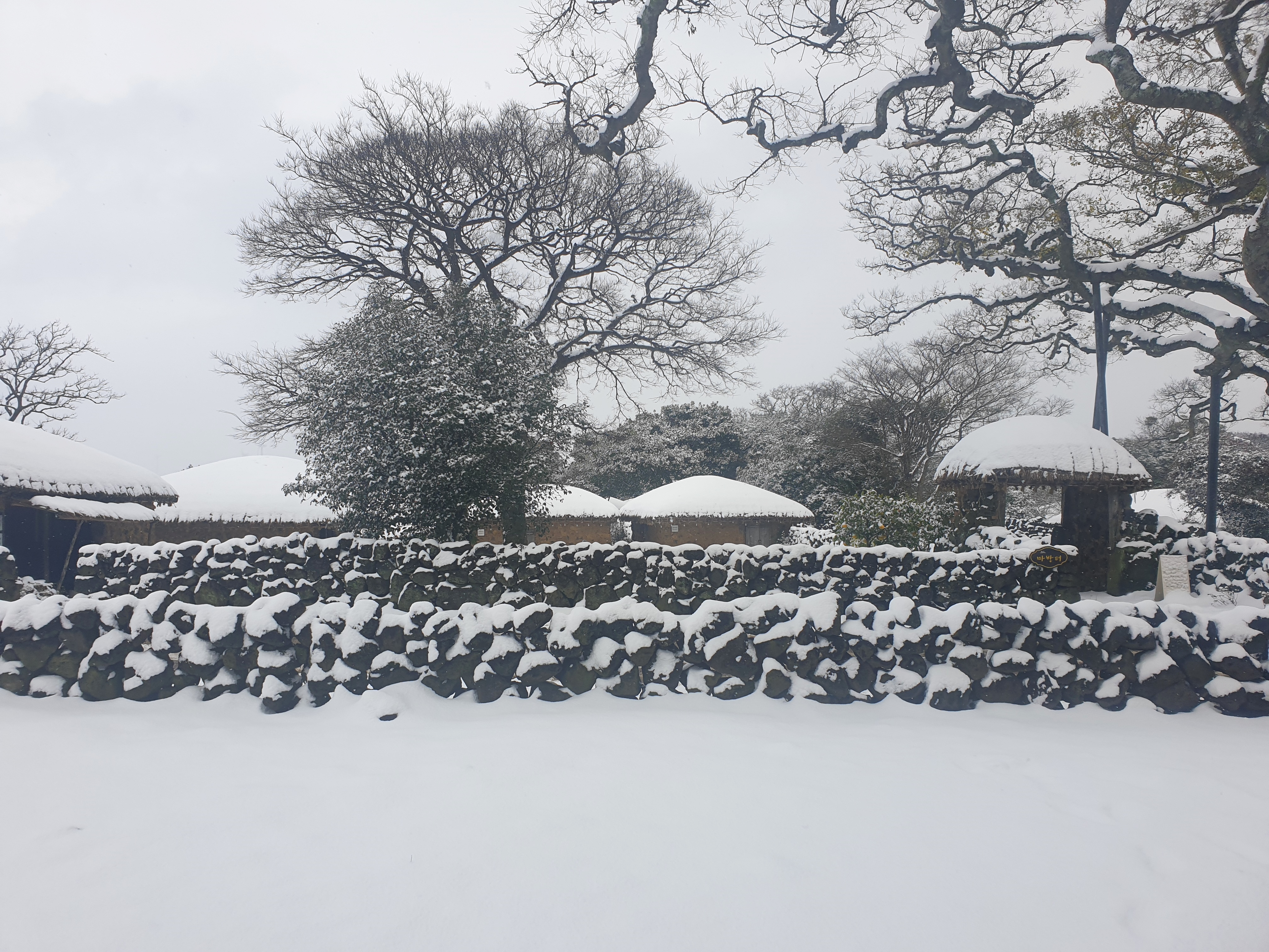 흰 눈이 쌓여서 집과 밭의 경계선은 더 뚜렷