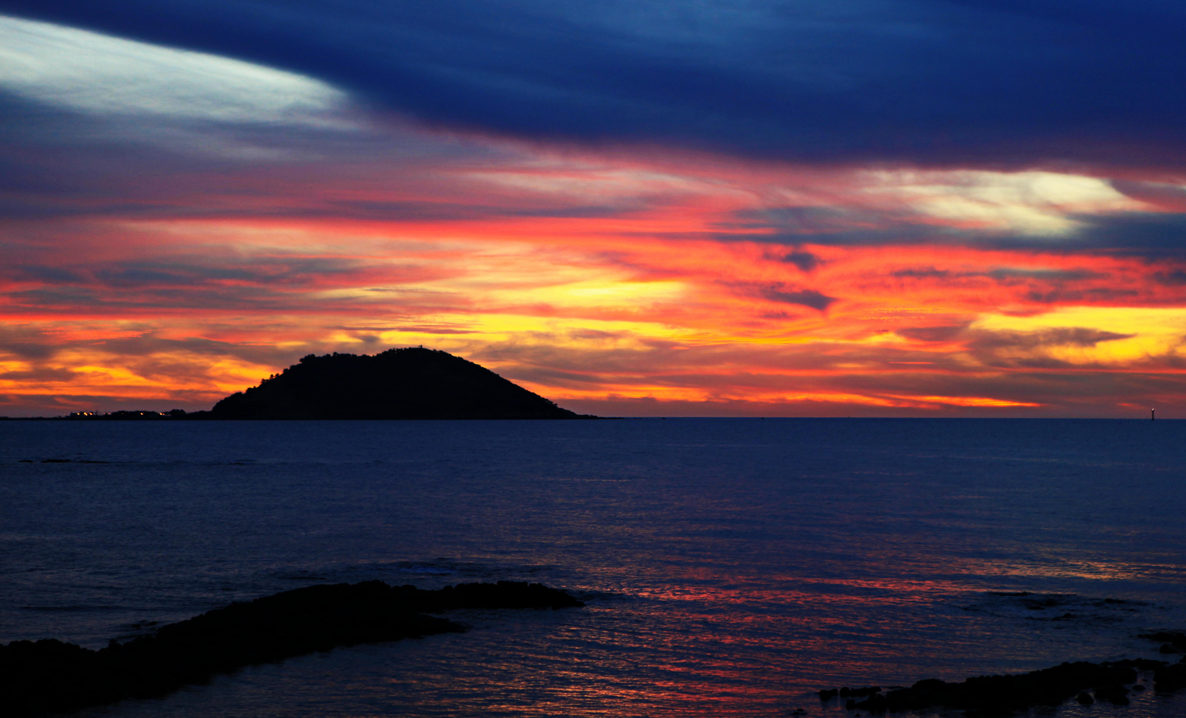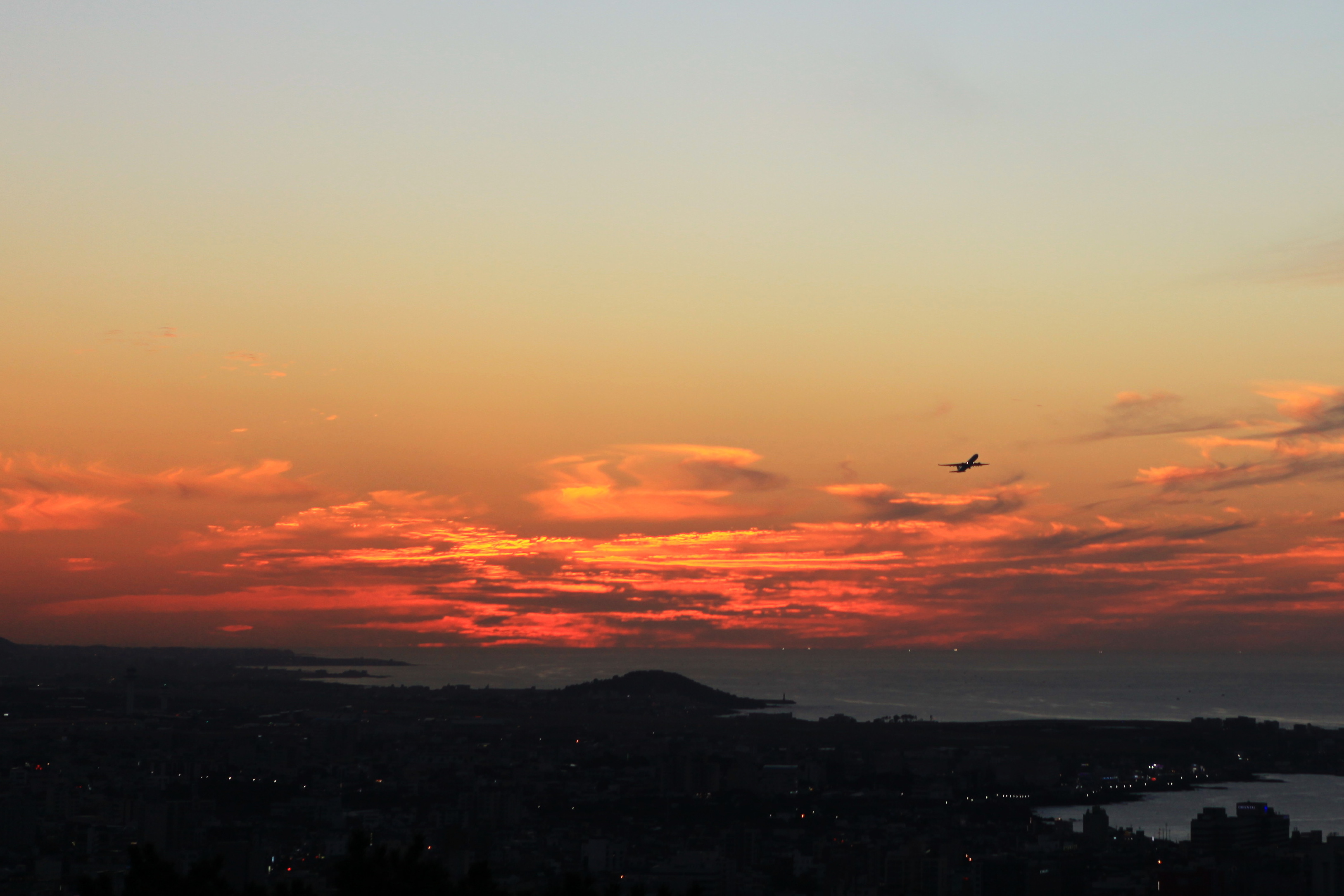 제주도의 아름다운 대표적 명승지를 일컬을 때는 [영주십경]을 거론한다. 하루의 일과 시작이 [성산일출]이라면 끝은 [사봉낙조]가 된다. [사봉낙조]란 제주시 건입동에 있는 사라봉에 올라가서 애월읍 쪽으로 해가 진 후의 황혼 경치를 감상하는 것이다. 저녁놀이 꽃 바다를 만들고 그 위로 비행기가 날아가는 모습은 탄성을 자아내기 충분하다. 사진은 사라봉 정상 망양정에서 본 낙조 풍광이다.