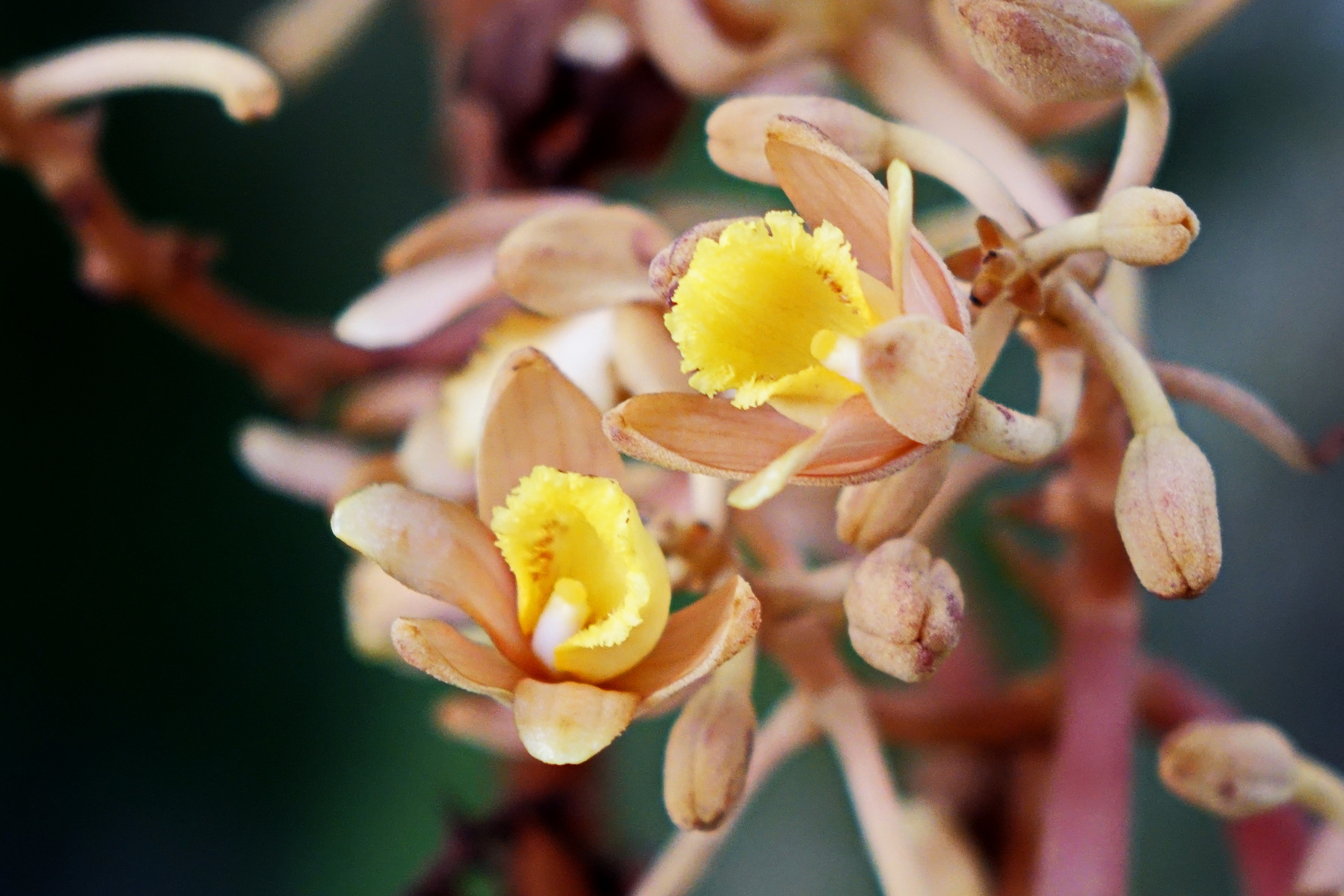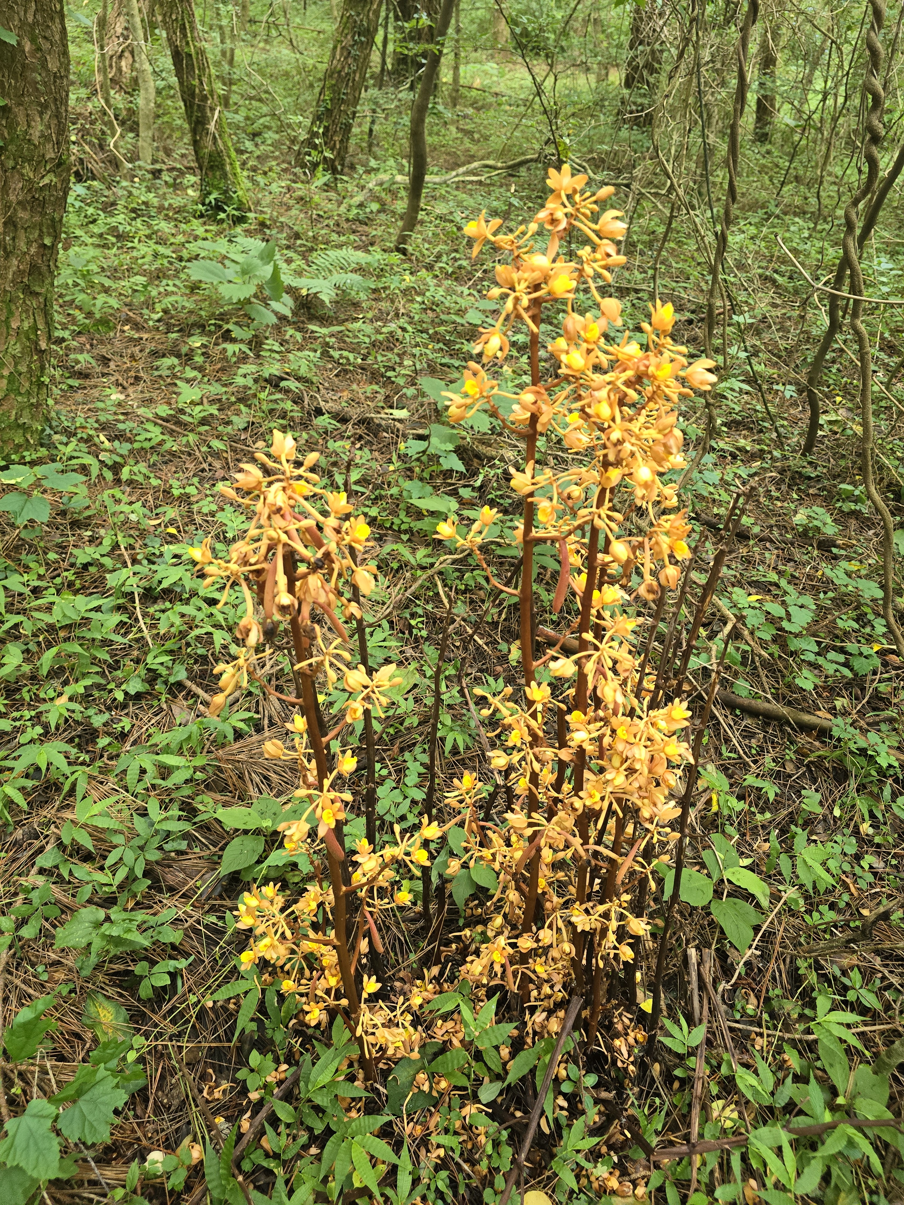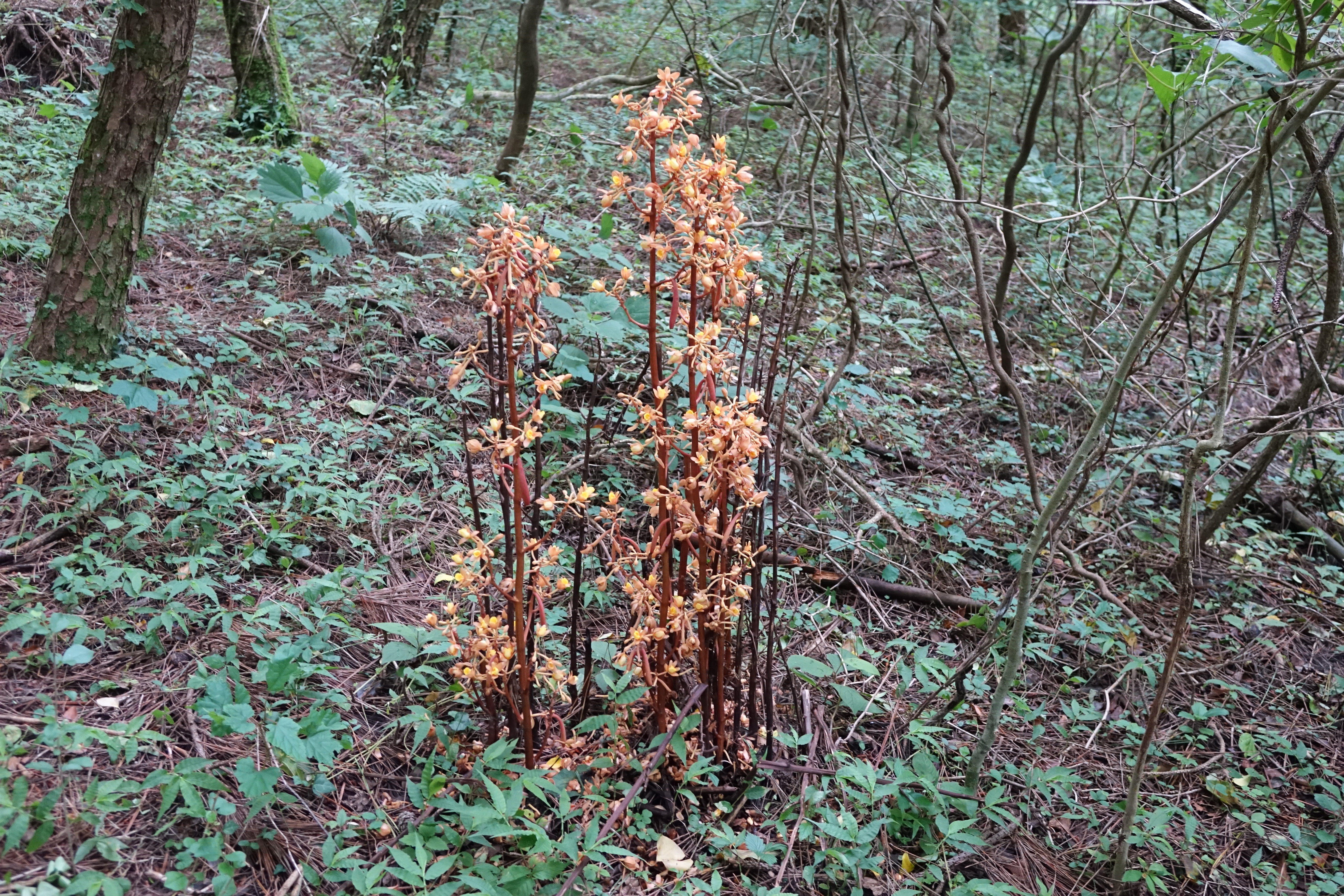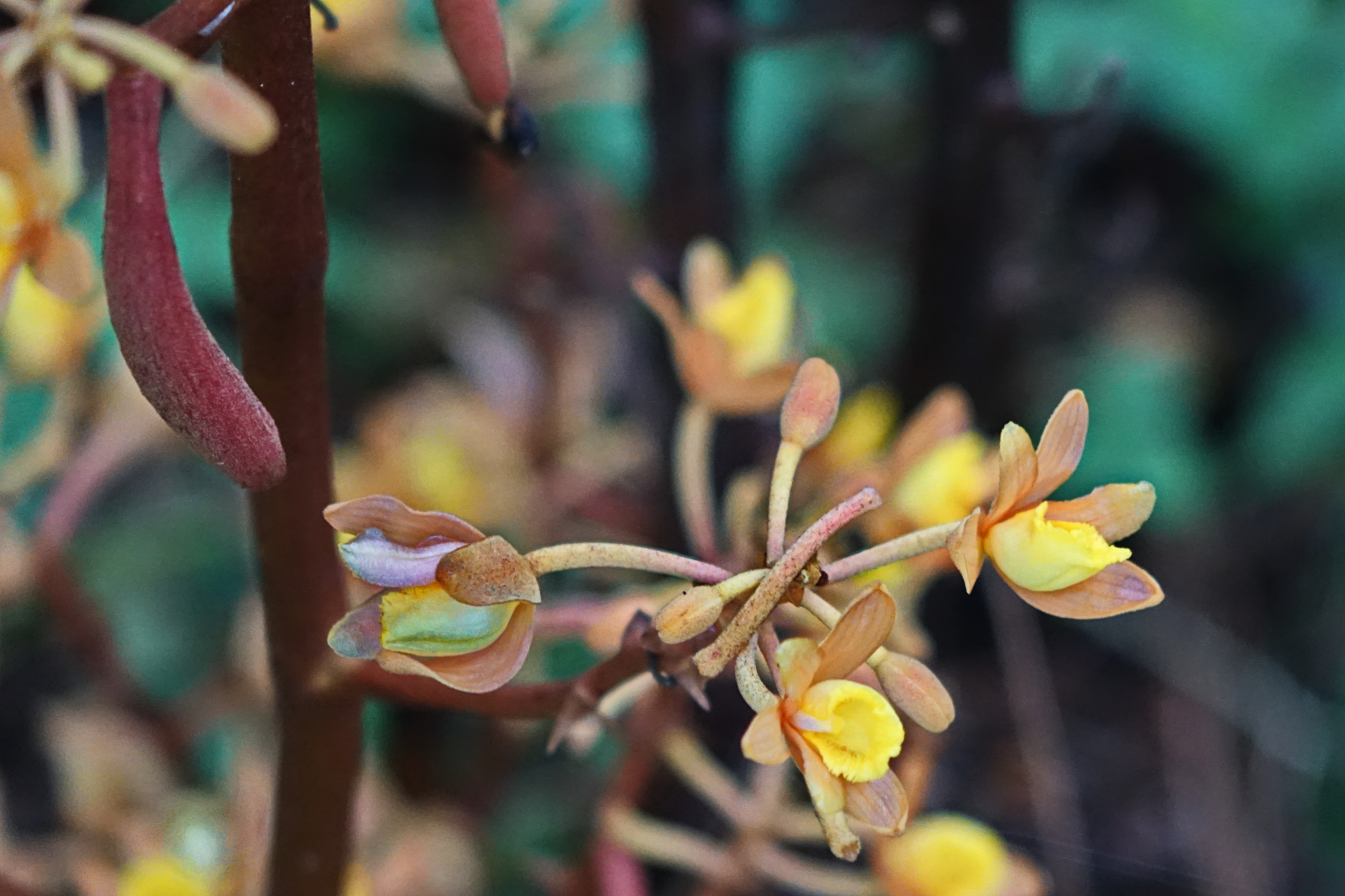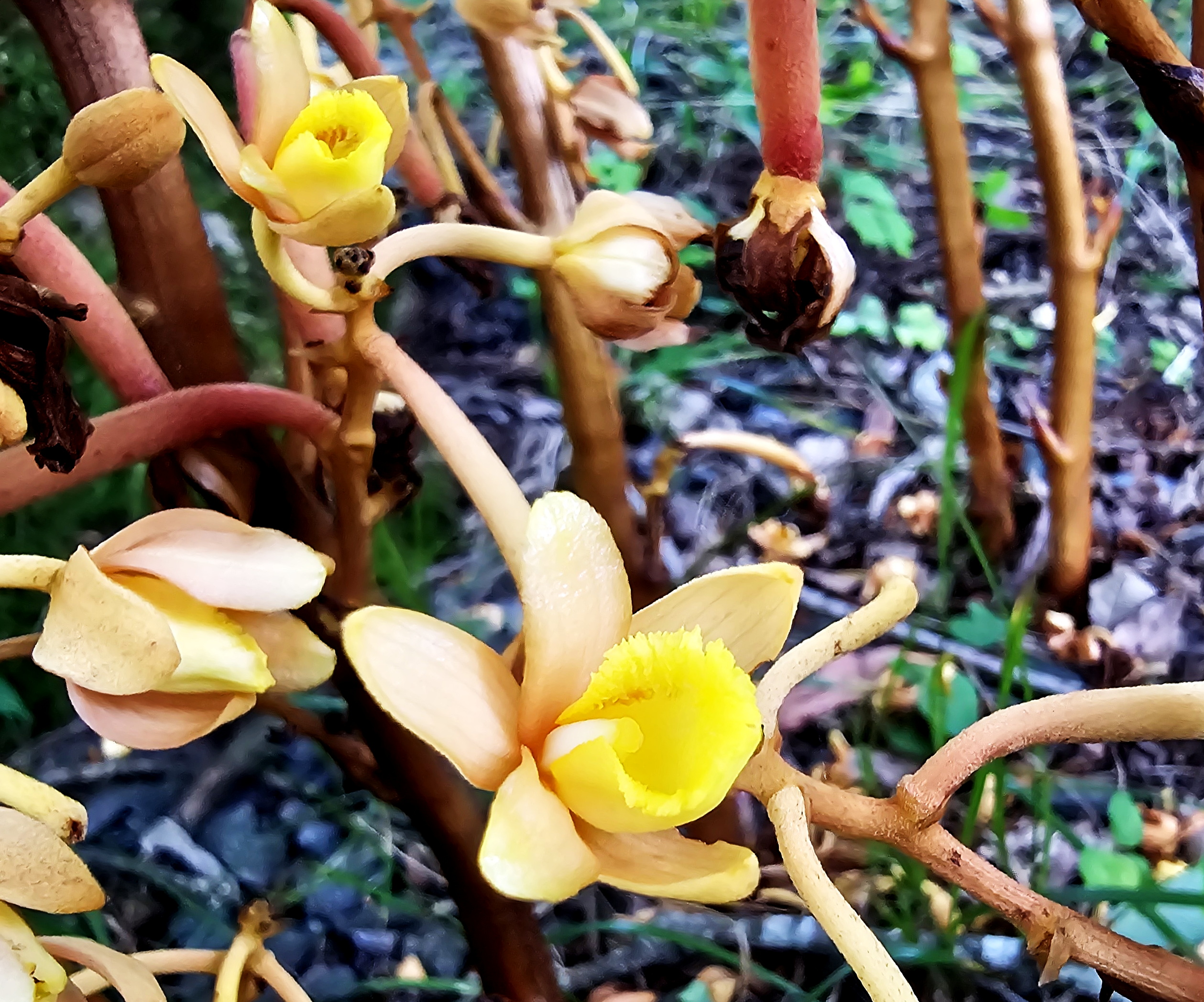 으름난초; 한라산에서 자생하는 멸종위기 식물이다. 개천마라고도 부르며 잎이 없는 상태에서 꽃대가 1m까지 자란다. 낙엽이 쌓여 있는 곳에서 광합성을 하지 않고 버섯 균사체의 도움을 받아 살아가는 아열대성 부생식물로서 열매가 으름 모양으로 생겼다고 하여 1940년대 말 으름난초로 명명되었다고 한다. 푸른 색을 찾아볼 수 없고 전체가 갈색 또는 황갈색을 띠며 꽃은 노랗고 열매는 빨간색이다. 해거리를 하여 있던 곳을 찾아가면 보이지 않으며 "걸어 다니는 꽃"이나 "산신령의 지팡이" 등 별명이 붙어있을 정도로 찾기가 어렵다. 한방에서는 토통초라는 이름으로 열매와 뿌리를 강장제나 강정제로 사용한다고 한다. 꽃말은 "부드러움"