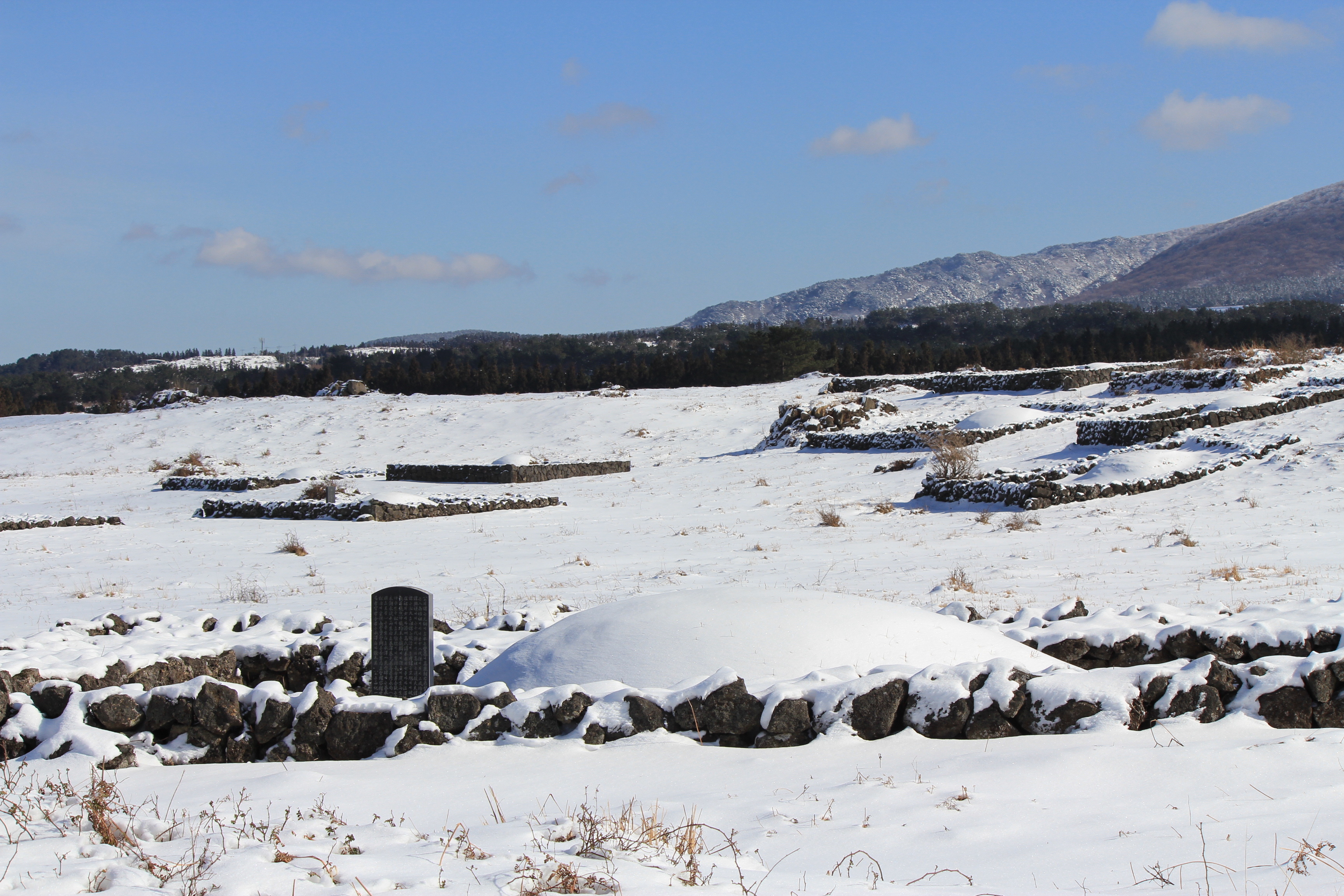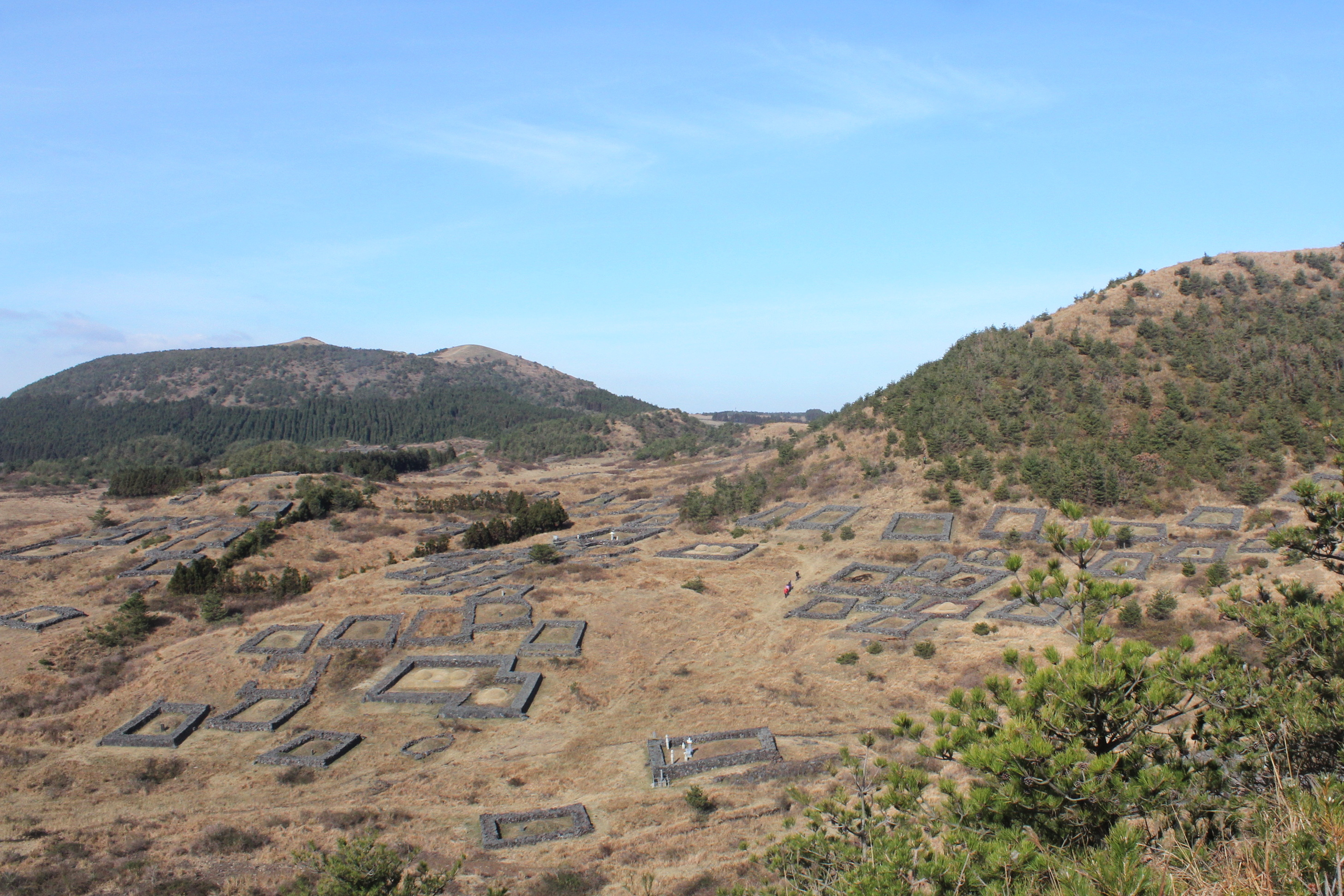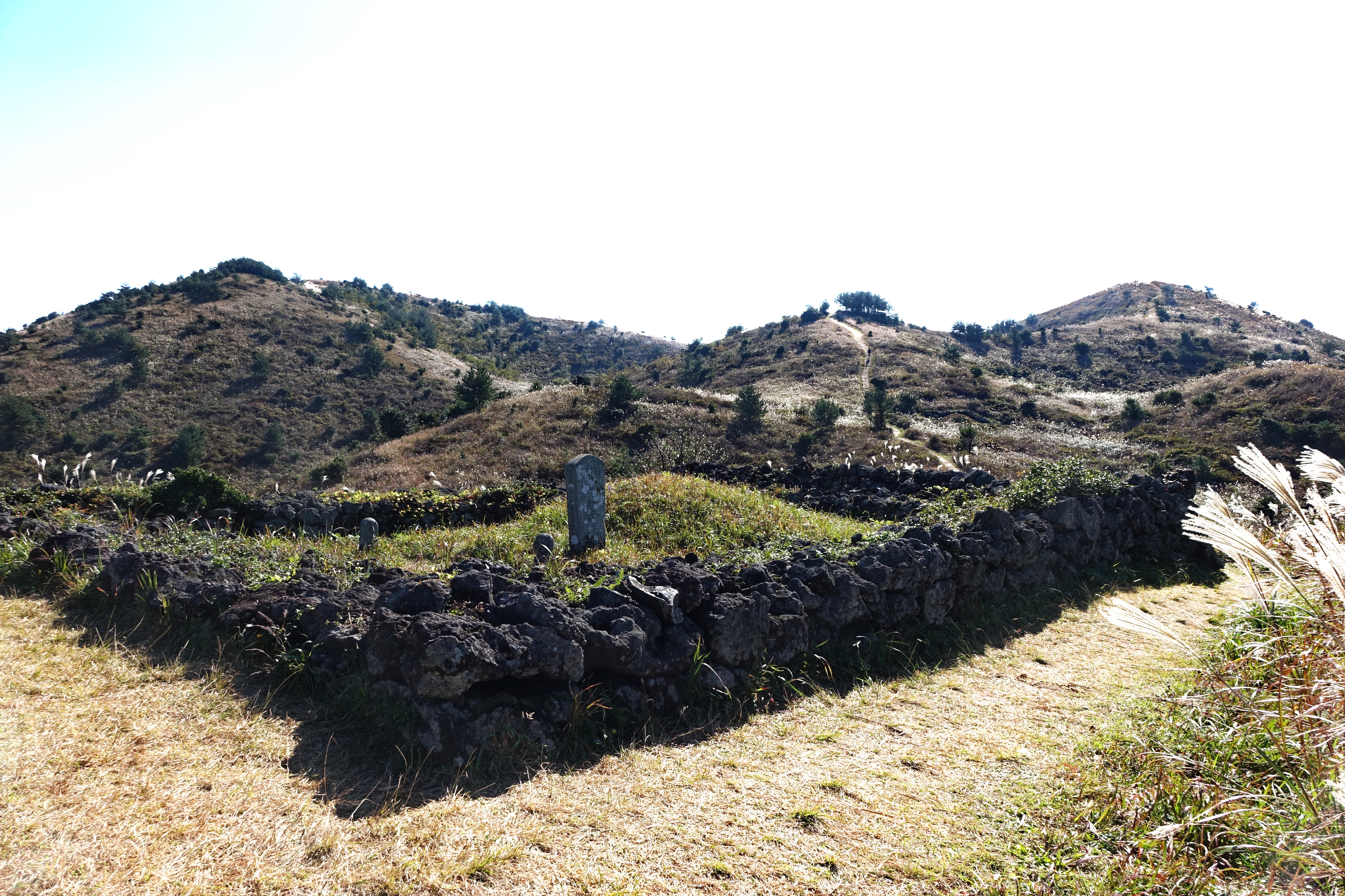 산담; 제주 지역의 무덤 주위로 네모지거나 둥글게 둘러싼 돌담을 말하며 무덤이 망자의 집이라면 ‘산담’은 망자의 집 울타리인 셈이다. 산담 한쪽에는 신이 드나드는 출입문인 ‘시문’을 만들었다고 하는 등 사연이 많이 들어 있다.