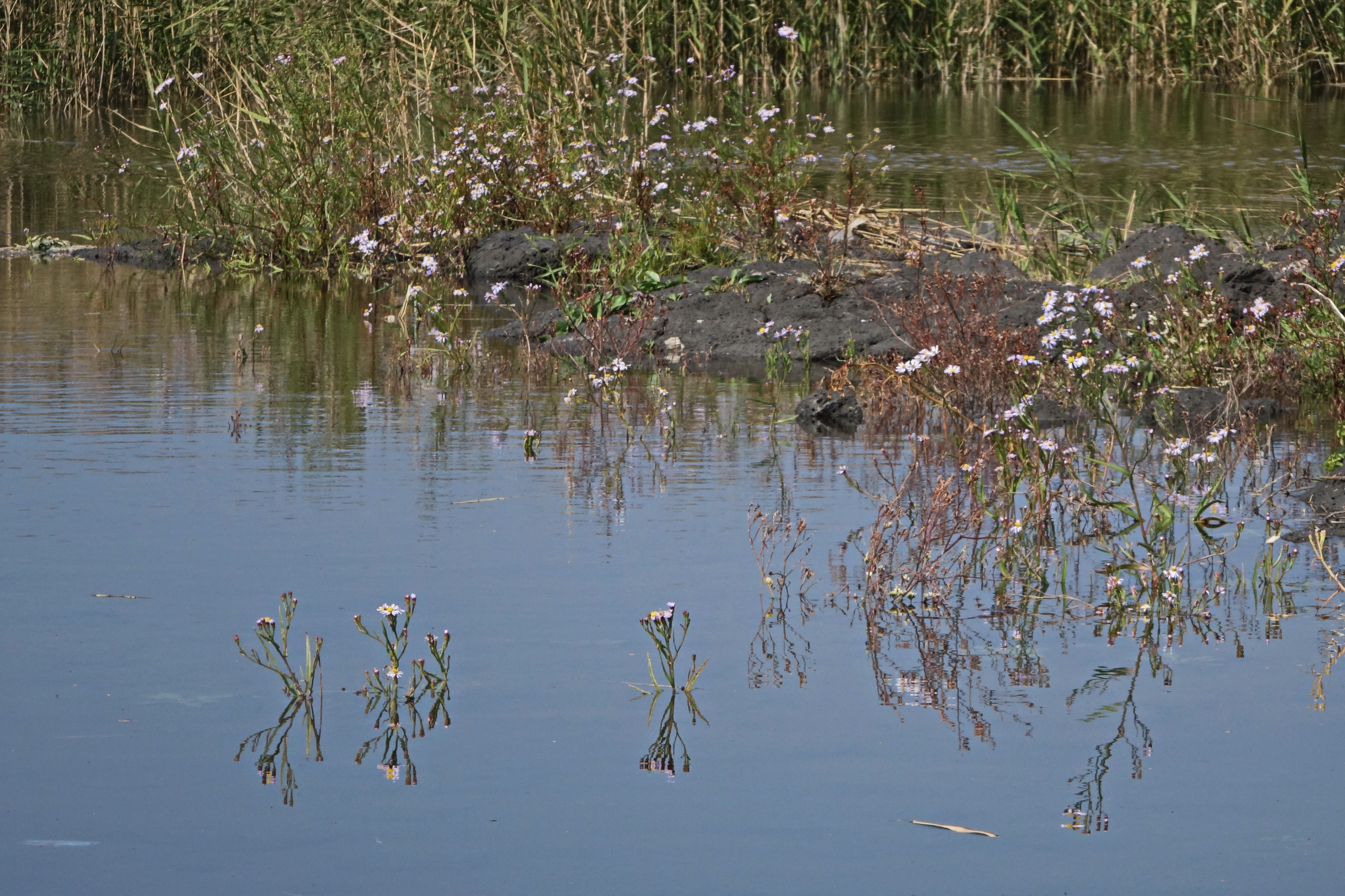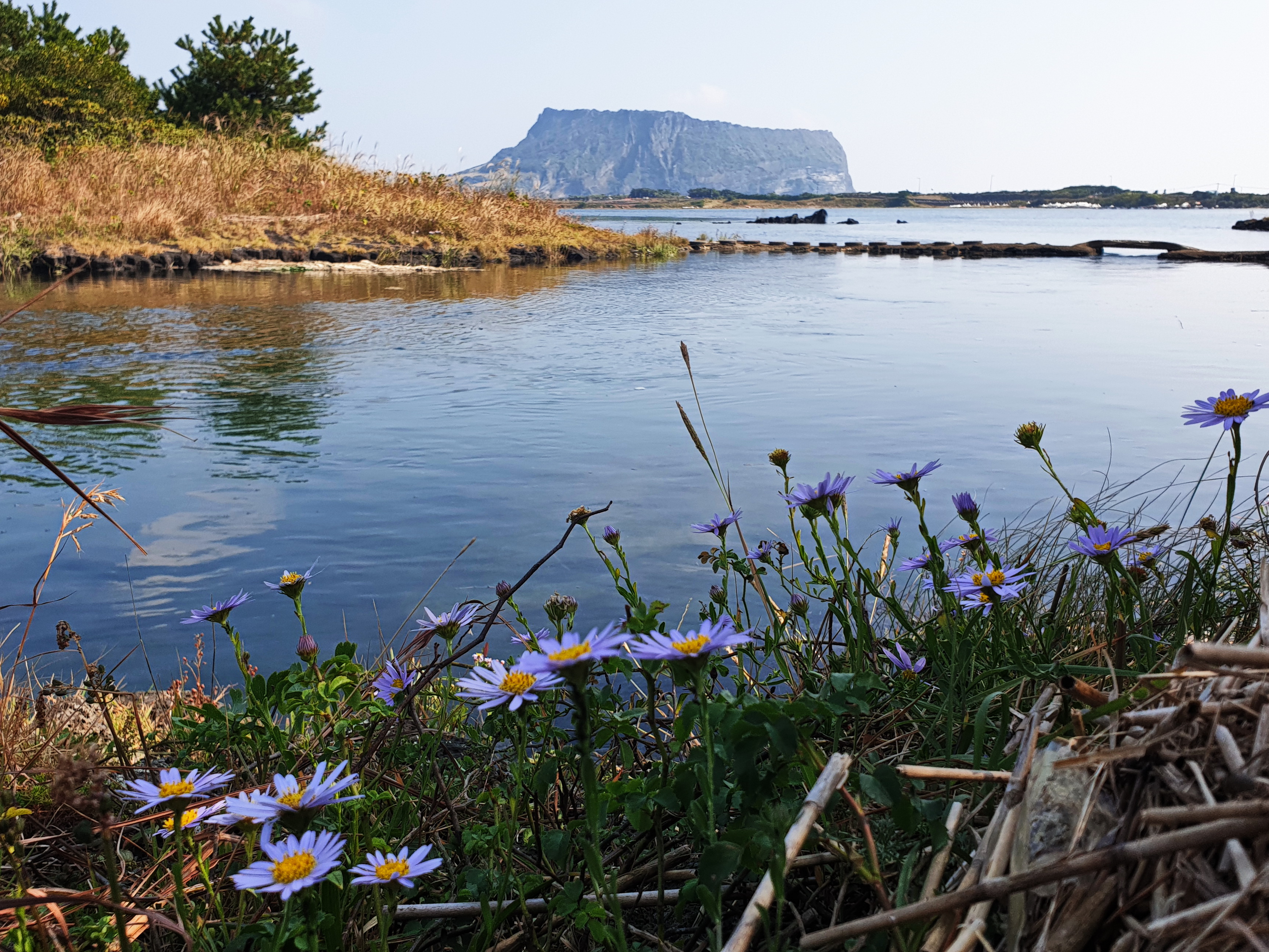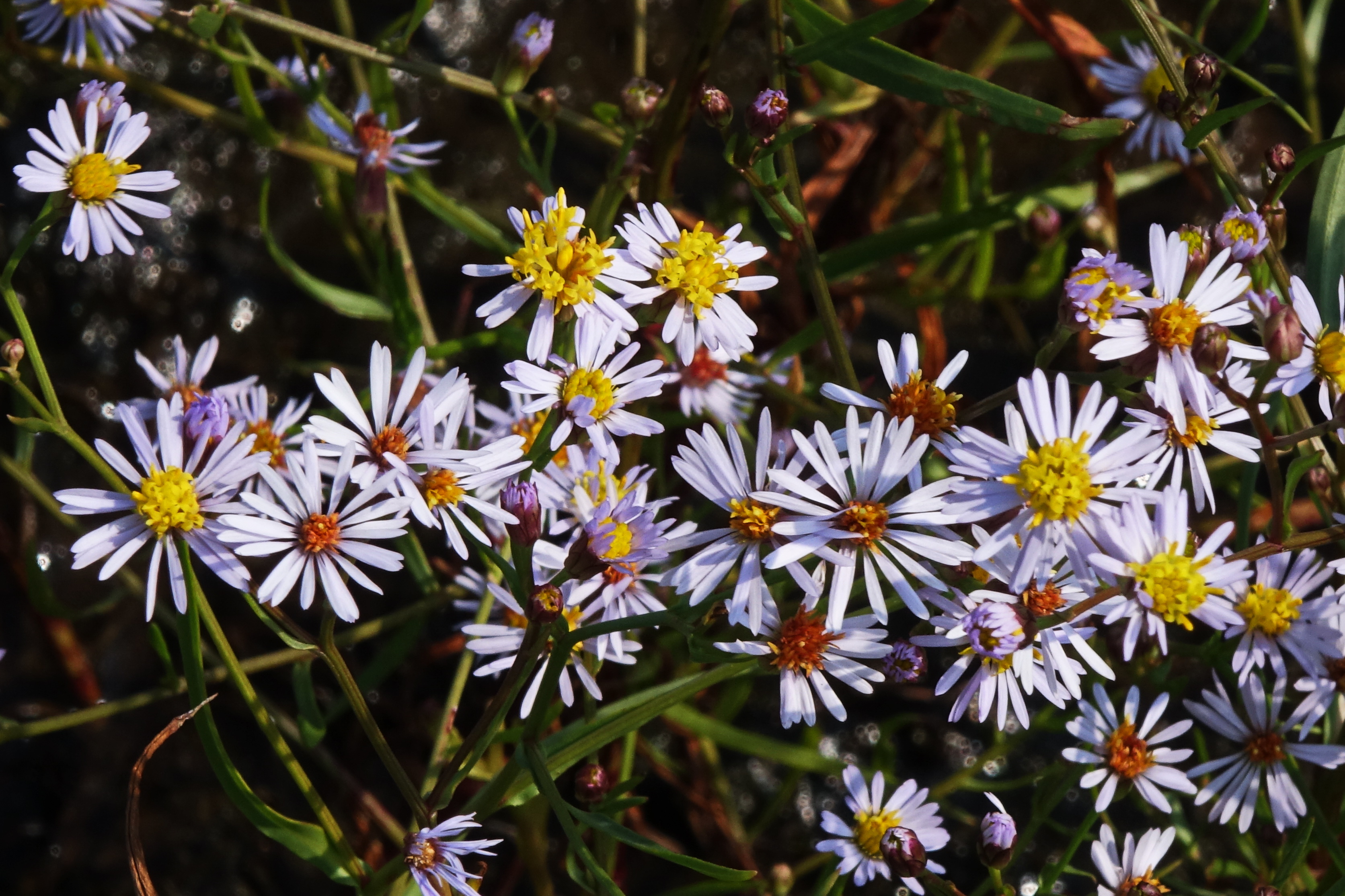 갯개미취; 도감에는 간척지의 습한 지역이나 갯벌에서 자라는 두해살이풀로 9~10월에 꽃이 핀다고 되어 있으나 제주도는 주로 특정 지역 바닷가 바위틈이나 갈대 사이에서 서식하고 10~11월에 꽃을 피운다. 갯자원,철간호, 죽엽국 등의 이명도 있는데 어린잎은 나물로 먹고 전초는 천식 등의 약재로도 썼다고 한다. 꽃말은 "추억"