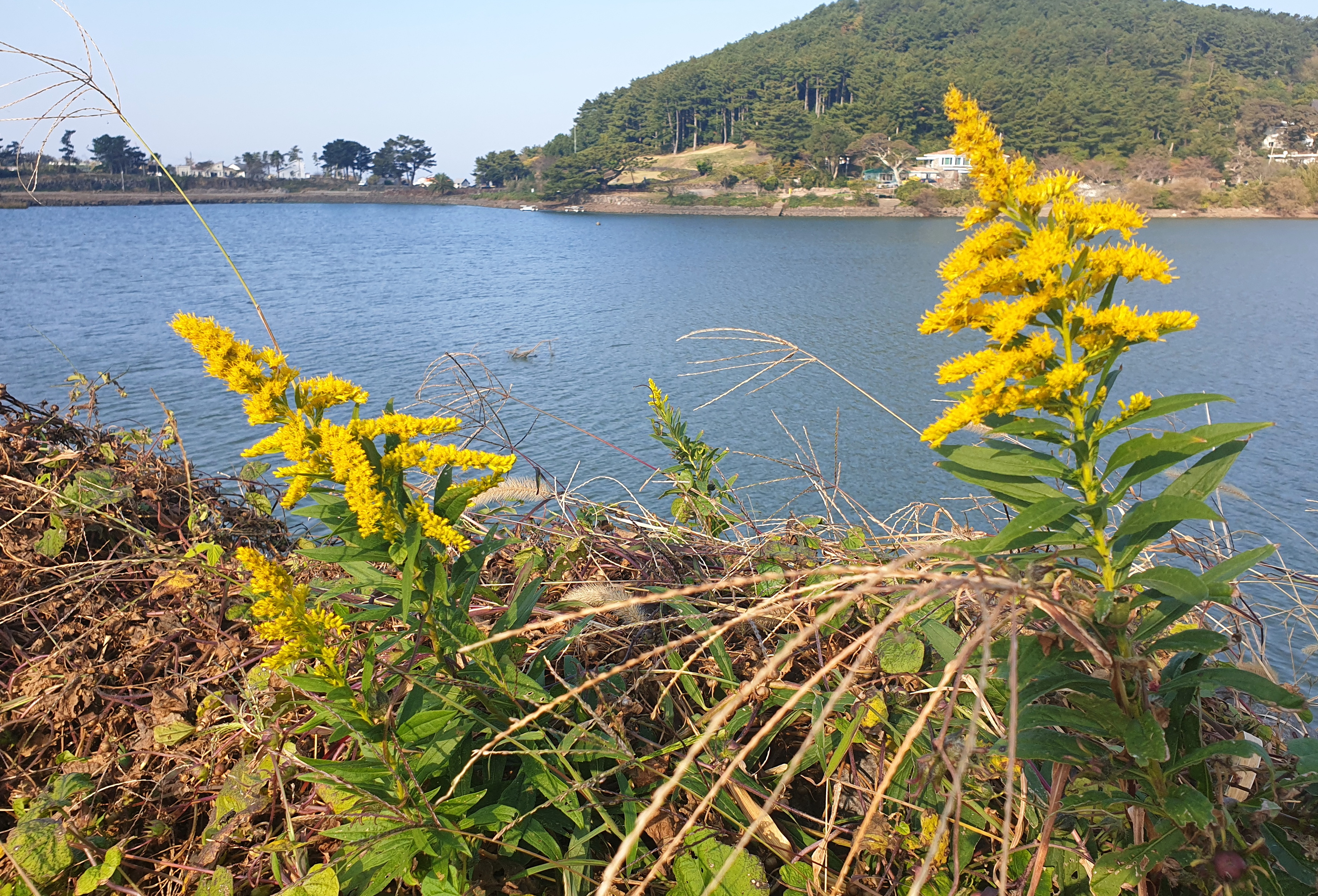 양미역취; 북미 원산의 귀화식물로 길가나 빈터에 자라는 여러해살이풀이다. 줄기는 높이 1~2.5m이고 전체에 연한 털 있으며 가을에 노란 꽃을 풍성하게 피우는데 제주도에서는 12월까지 볼 수 있다. 꽃을 포함하여 독성도 없고 혐오스럽지도 않지만 2009년 생태계교란생물로 지정되었다. 비슷하게 생겼어도 여름에 꽃 피는 미국미역취는 유해식물 지정을 피했다. 미역취의 꽃말은 "경계"