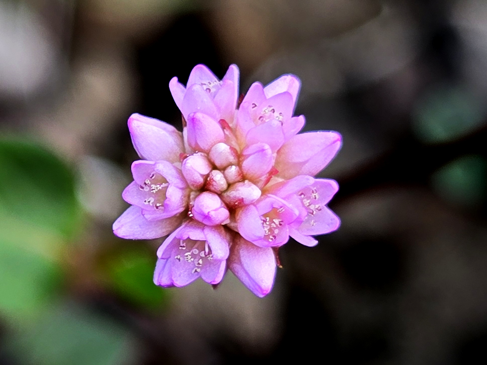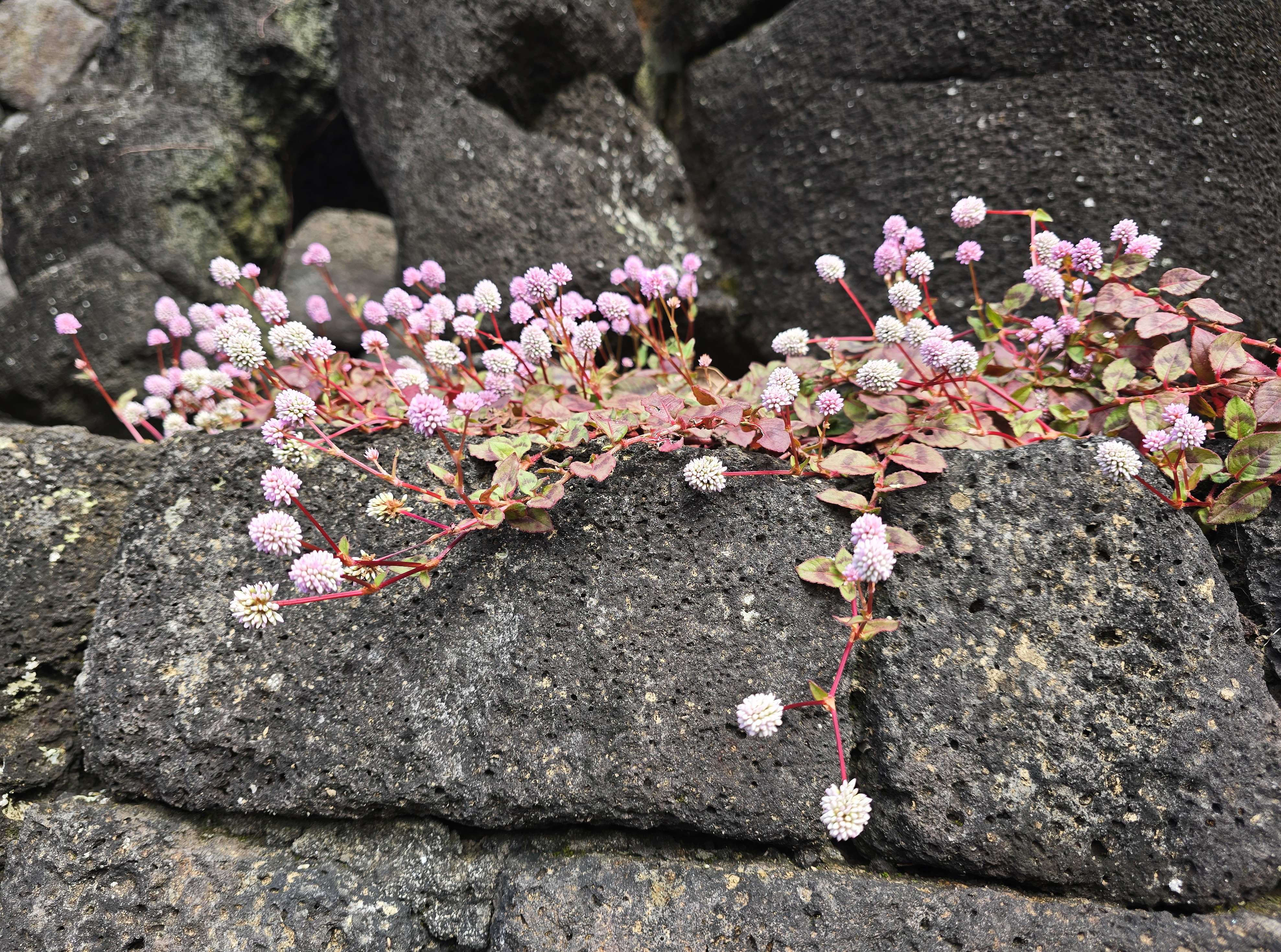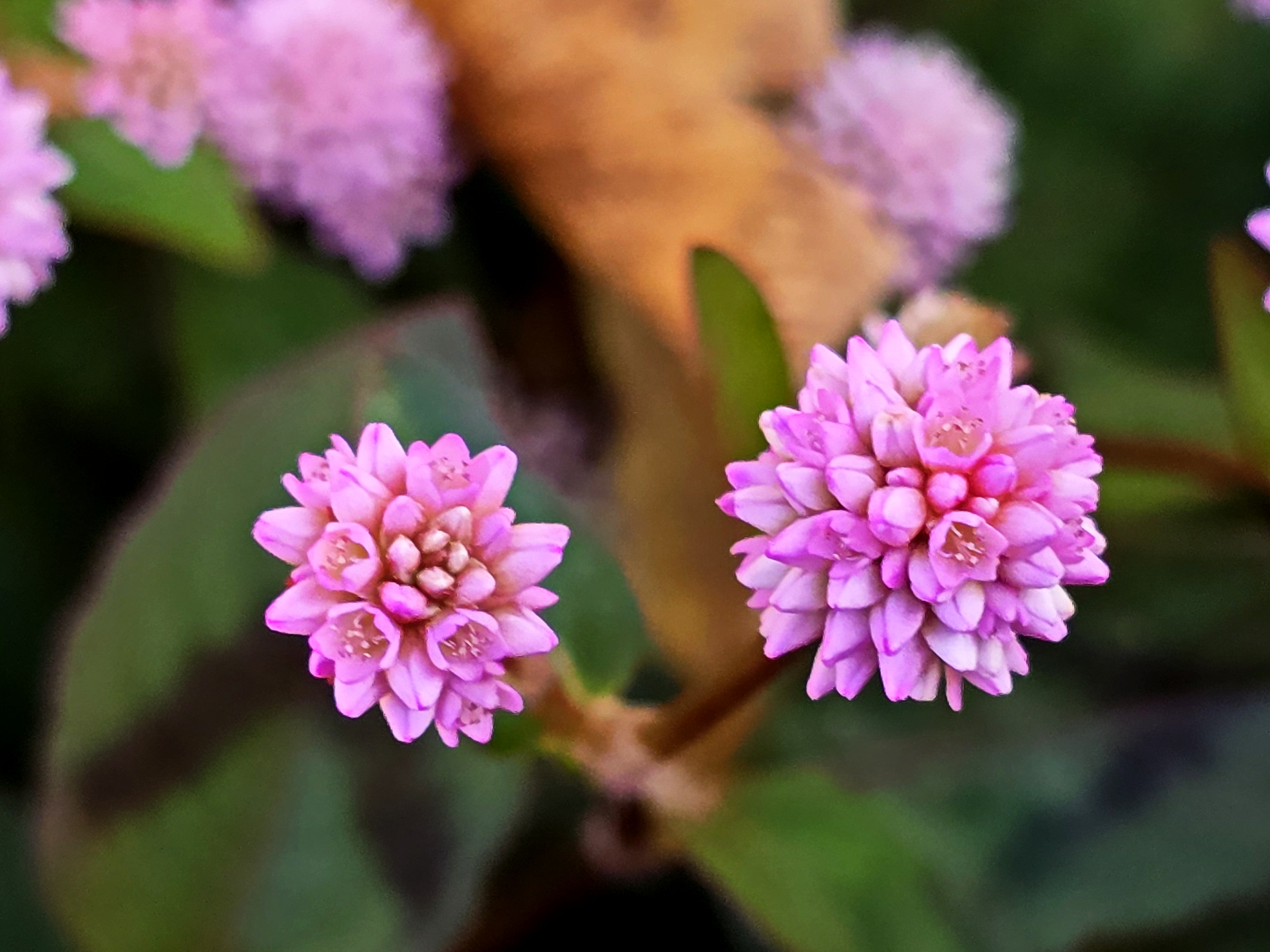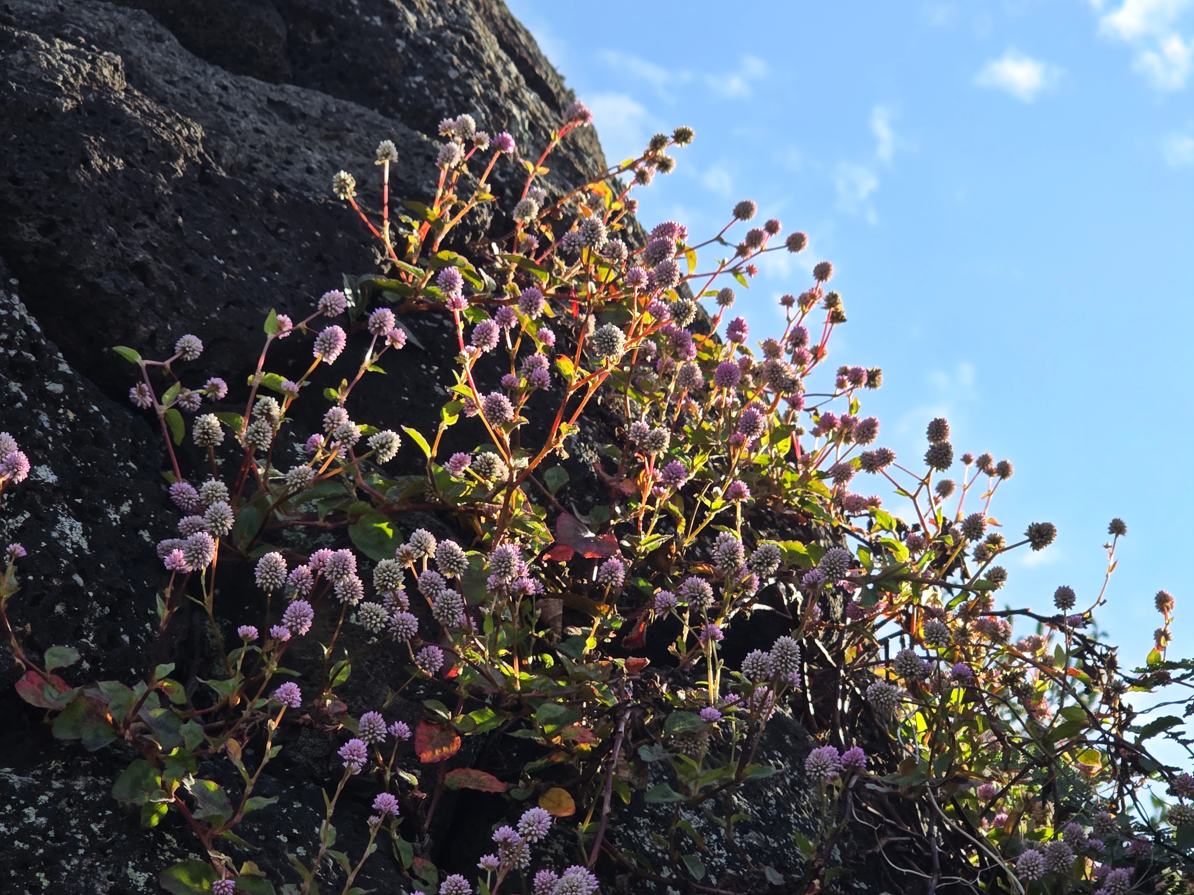 메밀여뀌; 남부지방과 제주도의 바닷가나 양지바른 언덕에서 자라는 한해살이풀인데 외래종으로 개모밀덩굴로 불리다가 메밀여뀌로 바뀌었지만 두산백과 등에는 여전히 개모밀덩굴로 나온다. 키가 10~15cm로 낮게 자라며 덩굴을 뻗어나가면서 가을에서 겨울에 걸쳐 공 모양의 작고도 많은 꽃봉오리를 만들어 낸다. 한방에서는 적지리란 이름으로 방광염 등에 사용한다고 한다. 꽃말은 “존엄, 순수”