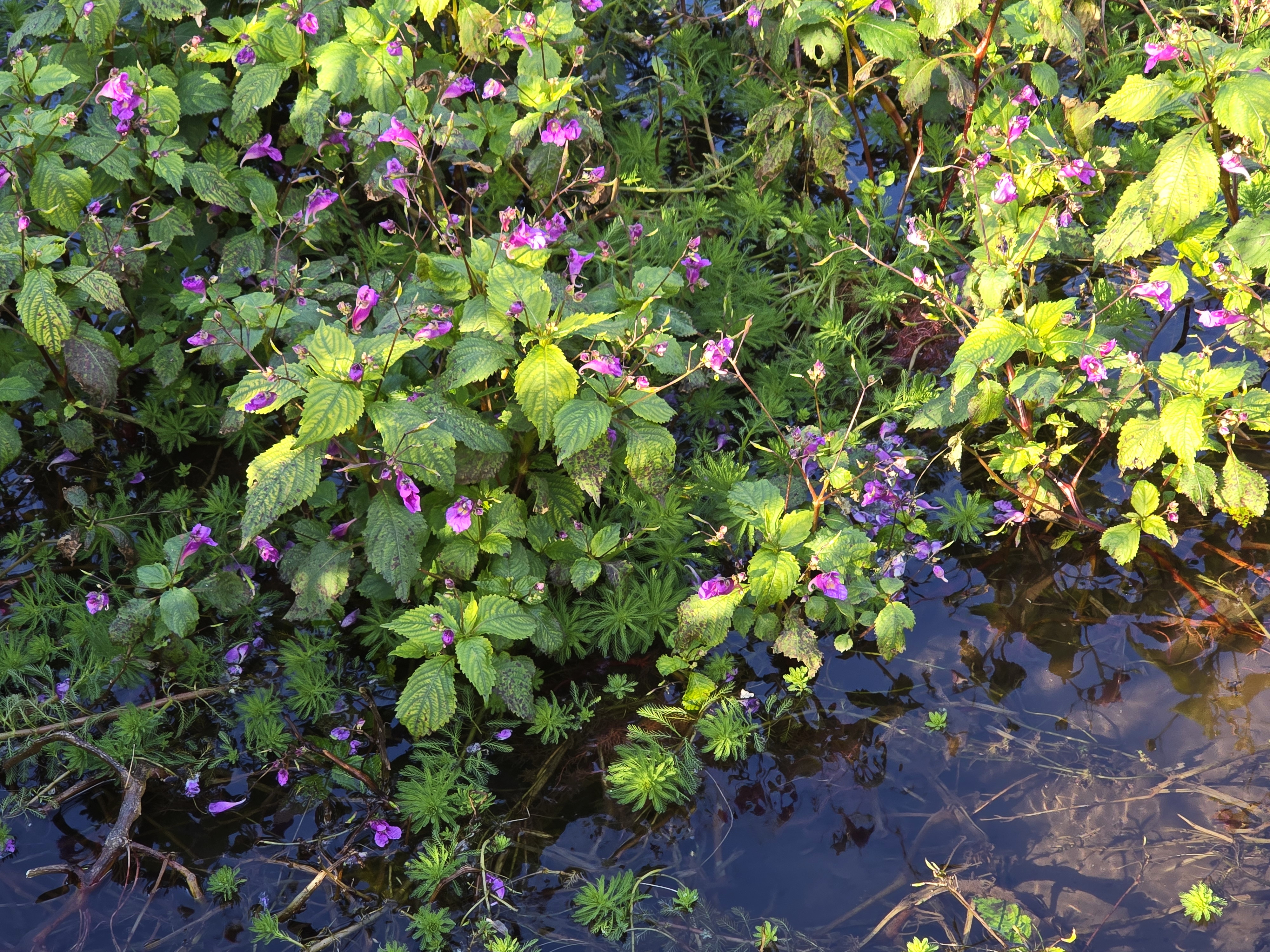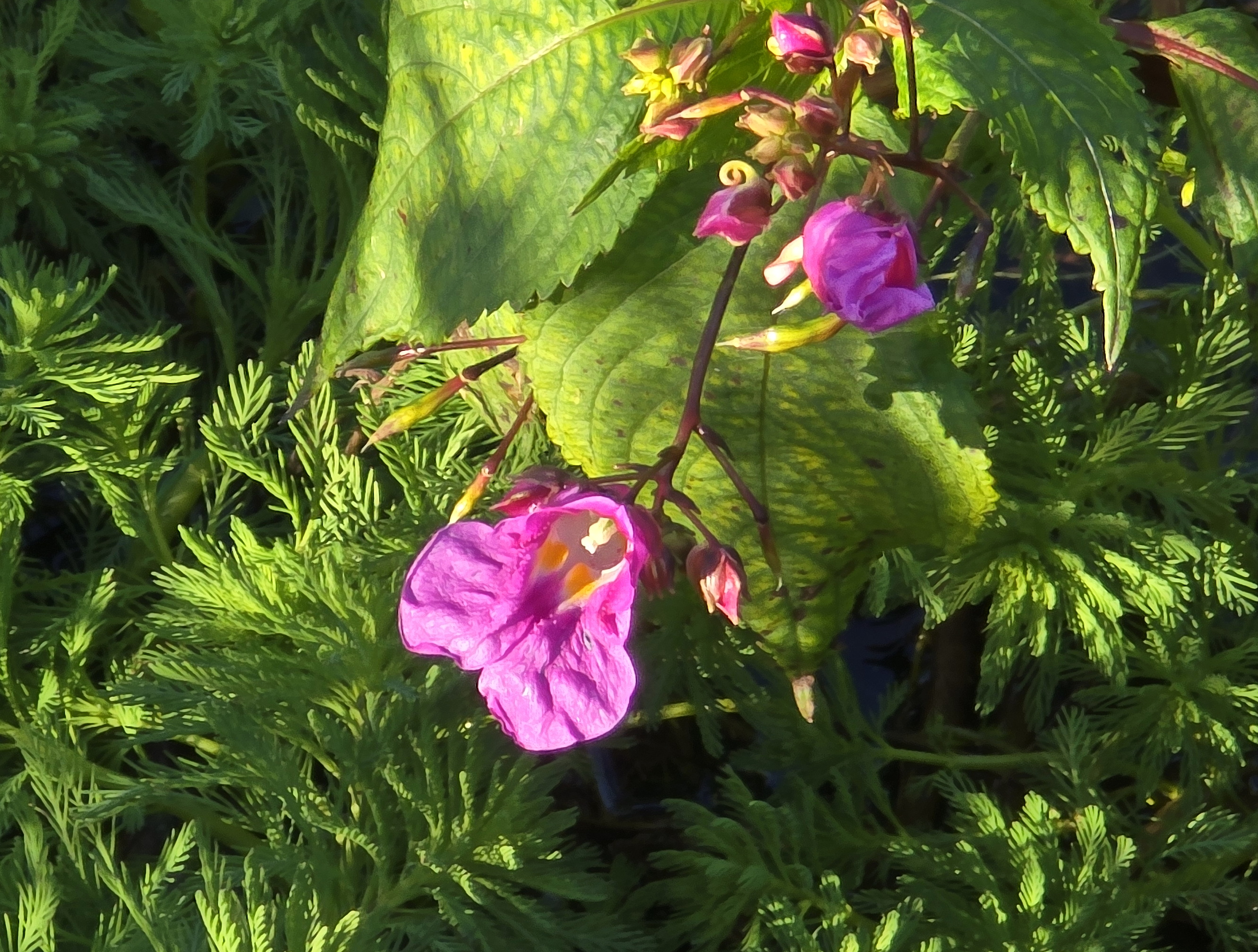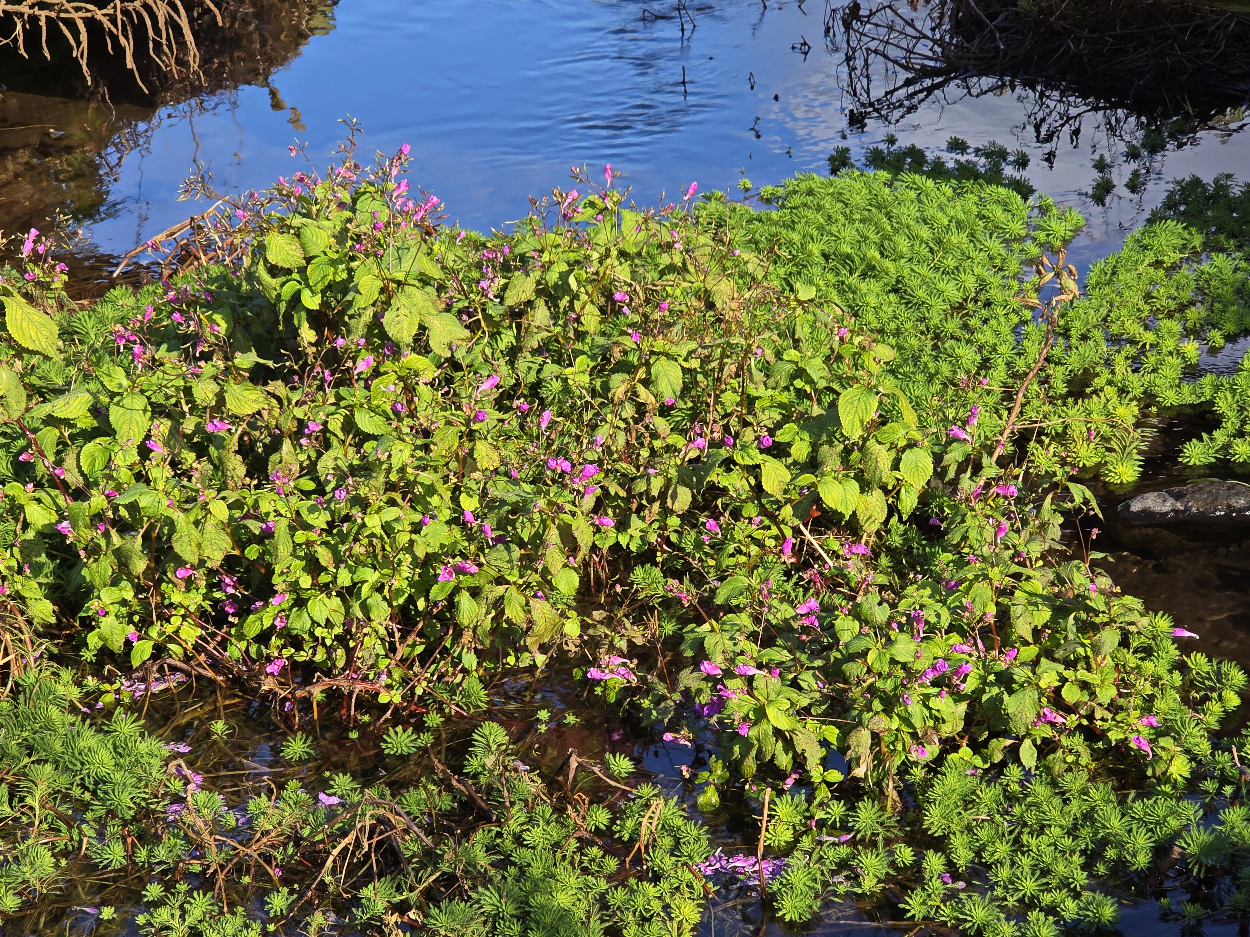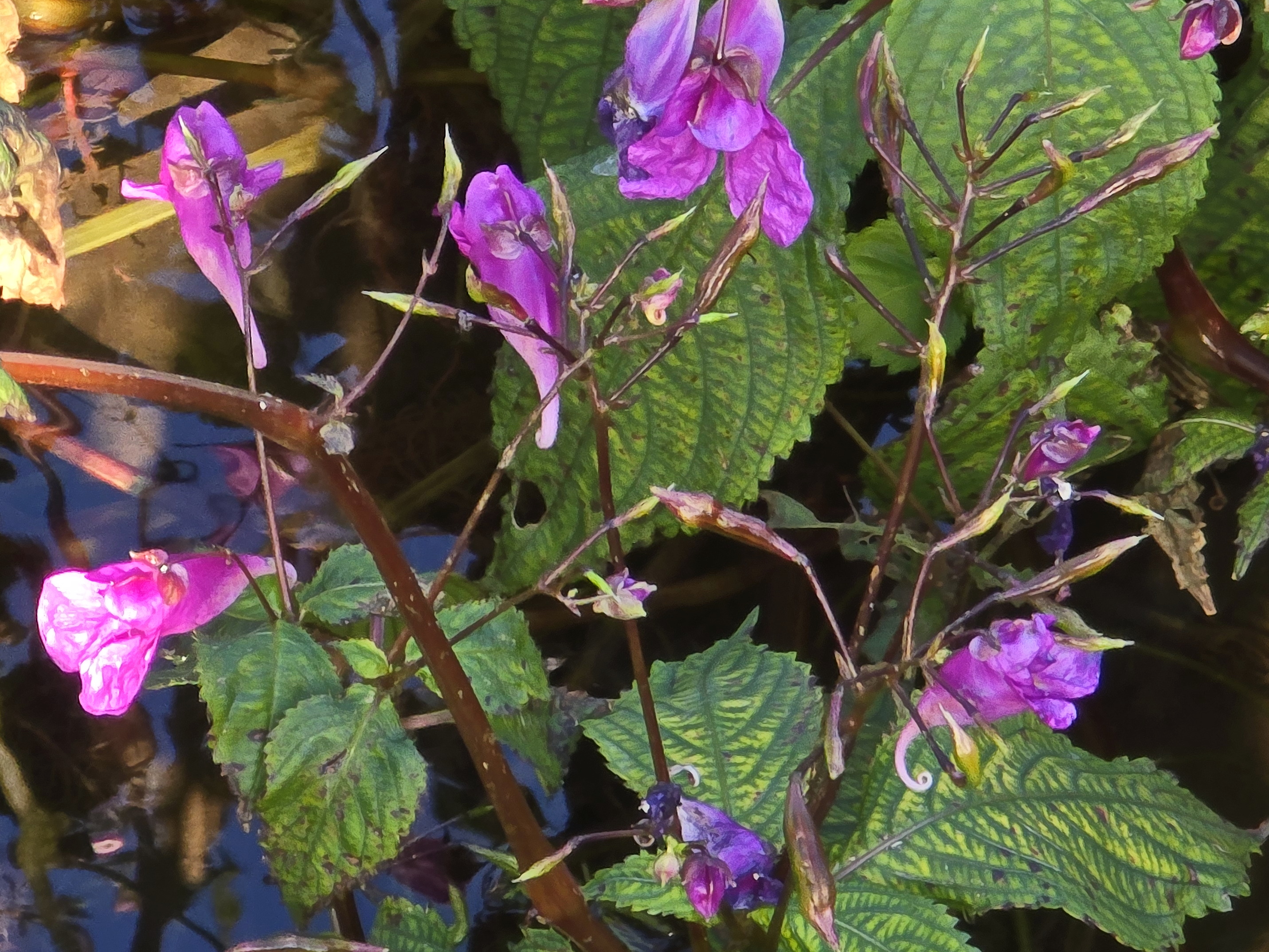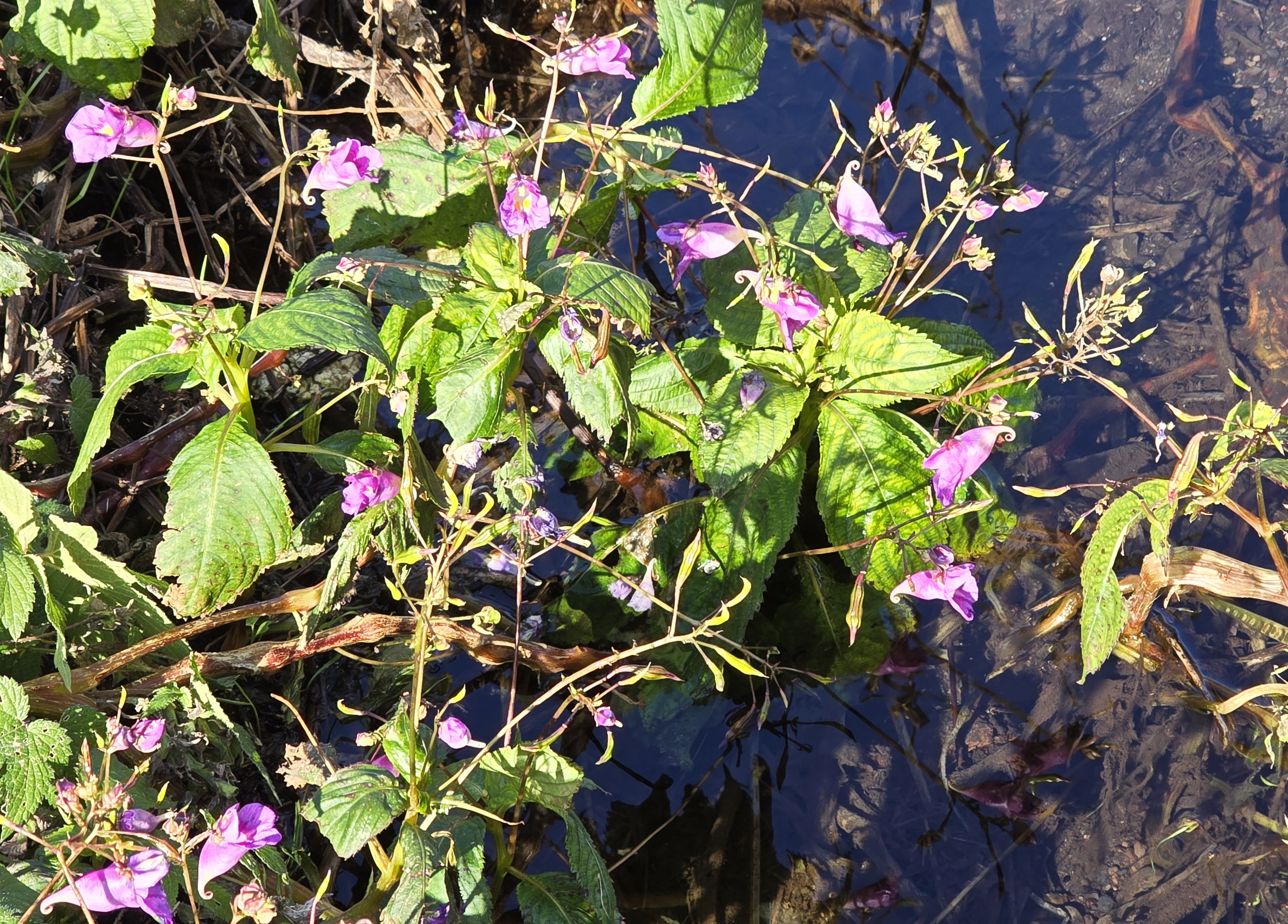 물봉선; 봉선화 또는 봉숭아의 원조이면서 토종이라고 하는데 보통 8~9월에 산이나 들녘에서 꽃을 피운다. 그런데 서귀포의 대왕수천 수로 주변엔 겨울철에도 풍성한 꽃을 볼 수가 있다. 물봉선으로 손톱에 물을 들일 수 있는지 모르겠으나 궁금하기는 하다. 영명인 “Touch me not”을 같이 쓰는 것은 봉선화나 물봉선이나 잘 익은 열매가 손 대면 톡하고 터지기 때문이라고 한다. 꽃말도 모두 똑같은 의미이다. “나를 건드리지 마세요”