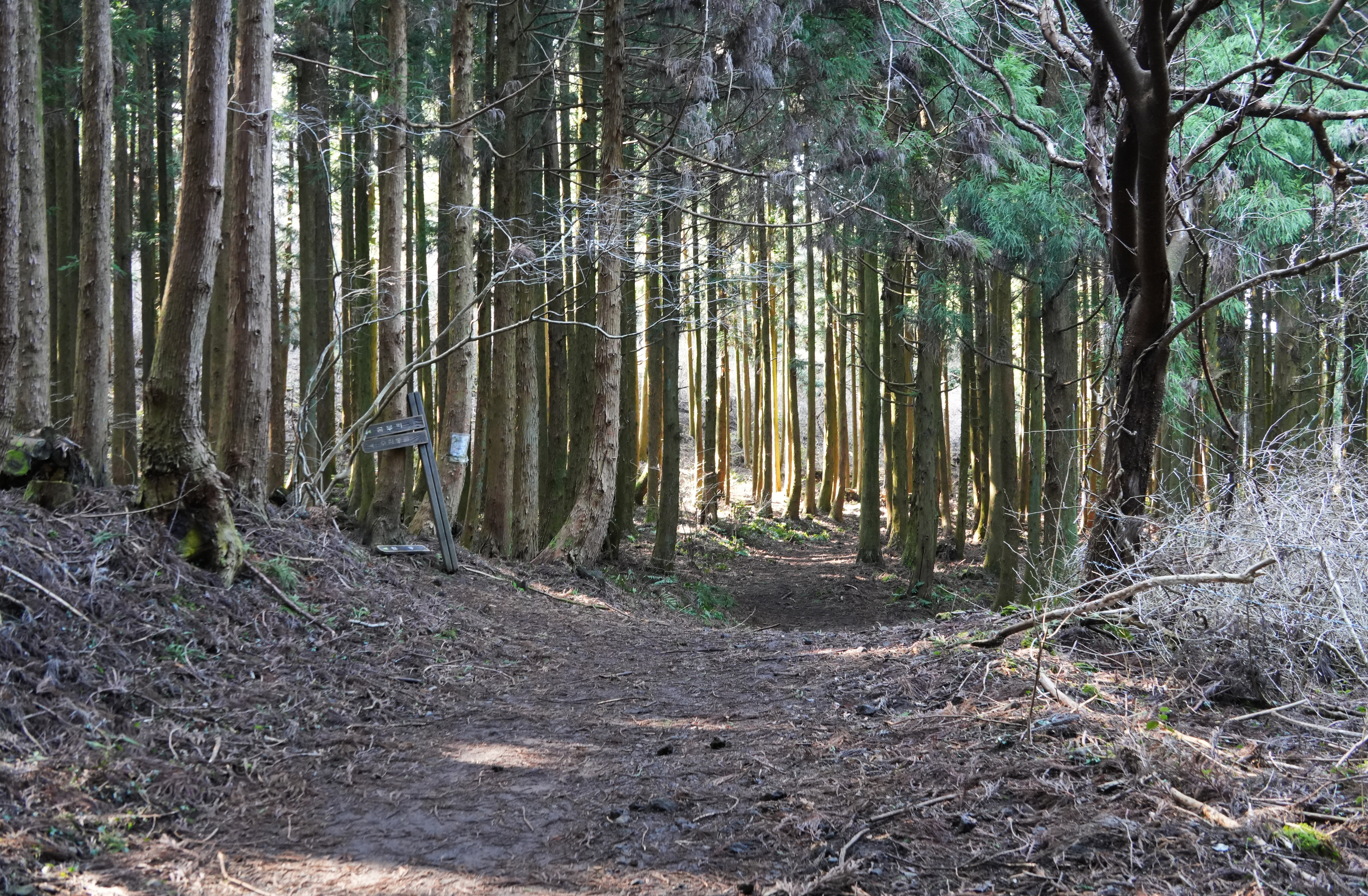 사진 해설; 제주도에는 지난 50년대~70년대에 걸쳐 일본에서 도입한 삼나무가 많이 조림되었다. 한라산에 채종원까지 마련해 놓고 심은 삼나무는 무려 30,000여 ha나 된다고 한다. 제주말로 쑥쑥 크는 나무라 하여 '쑥대낭'이라고 불리는 삼나무는 높이 50m, 둘레 2m까지 자라서 방풍림으로 제격이었지만 최근에는 봄철 꽃가루 알레르기 문제가 심각한 것으로 알려졌다. 제주도 내 곳곳에 삼나무 숲길이 여러 곳에 있는데 사진 속의 길은 왕이메 오름 주변 모습이다.
