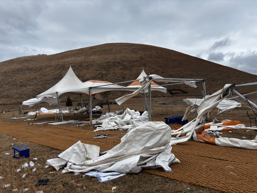 <엇그제 새별오름 앞에서 제주들불축제가 시작되었다가 강풍으로 천막이 다 날아가 전면 취소되었다네요>