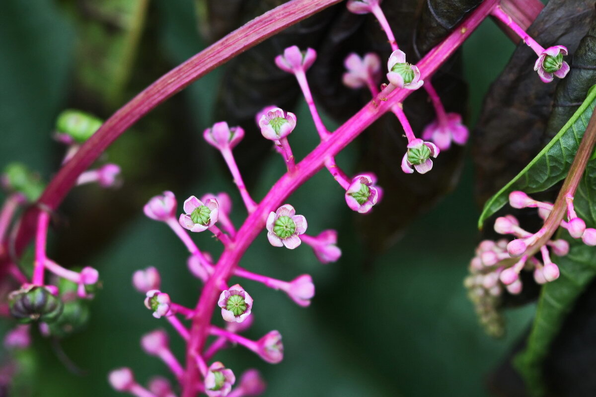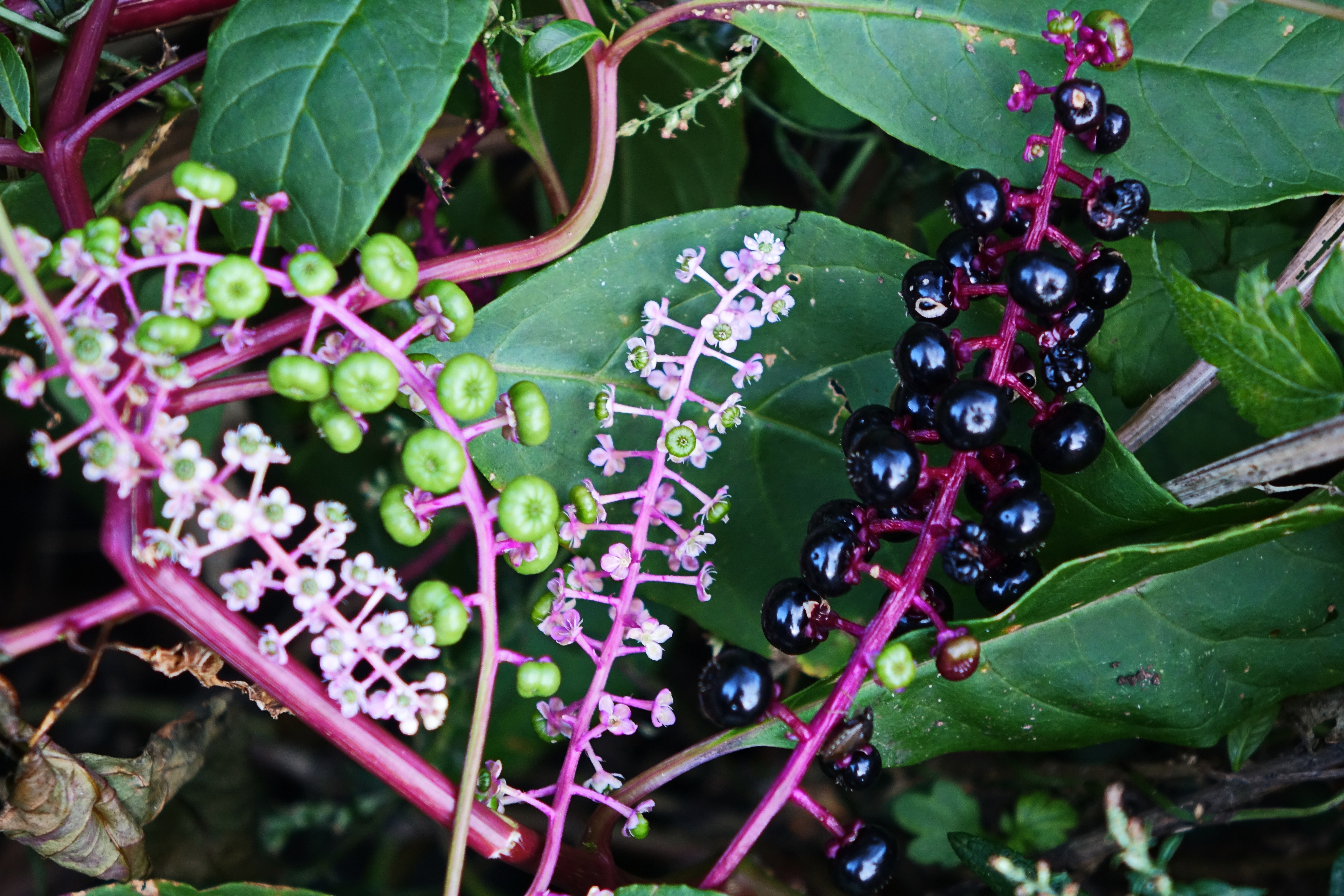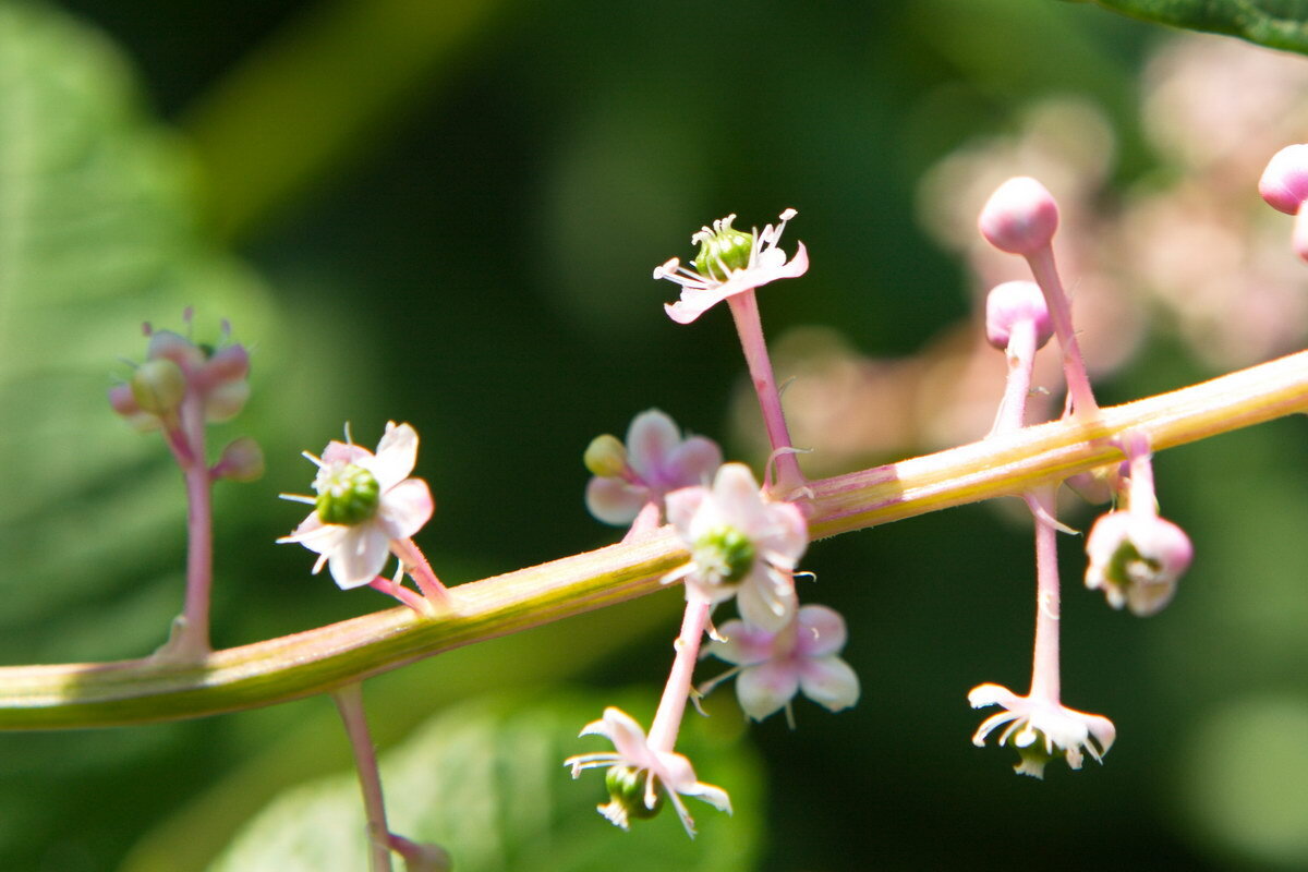 미국자리공; 야산이나 들녘에 자라는 북아메리카 원산의 한해살이풀이다. 굵은 뿌리에서 줄기가 나오며 가지와 열매가 붉은빛이 강한 자주색이다. 잎은 어긋나고 길이 10∼30cm의 긴 타원 모양 또는 달걀 모양이고 꽃은 6∼9월에 붉은빛이 도는 흰색으로 핀다. 전체적으로 독성이 있지만, 염료나 제초제 등으로 활용되었고 한방에서는 뿌리를 미상륙(美商陸)이라는 약재로 능막염 등에 쓴다고 하며 원주민들은 종기와 진균에 의한 피부병에 짓찧어 붙였다고 한다. 꽃말은 “환희”