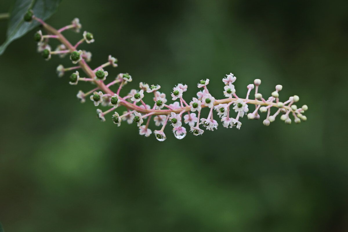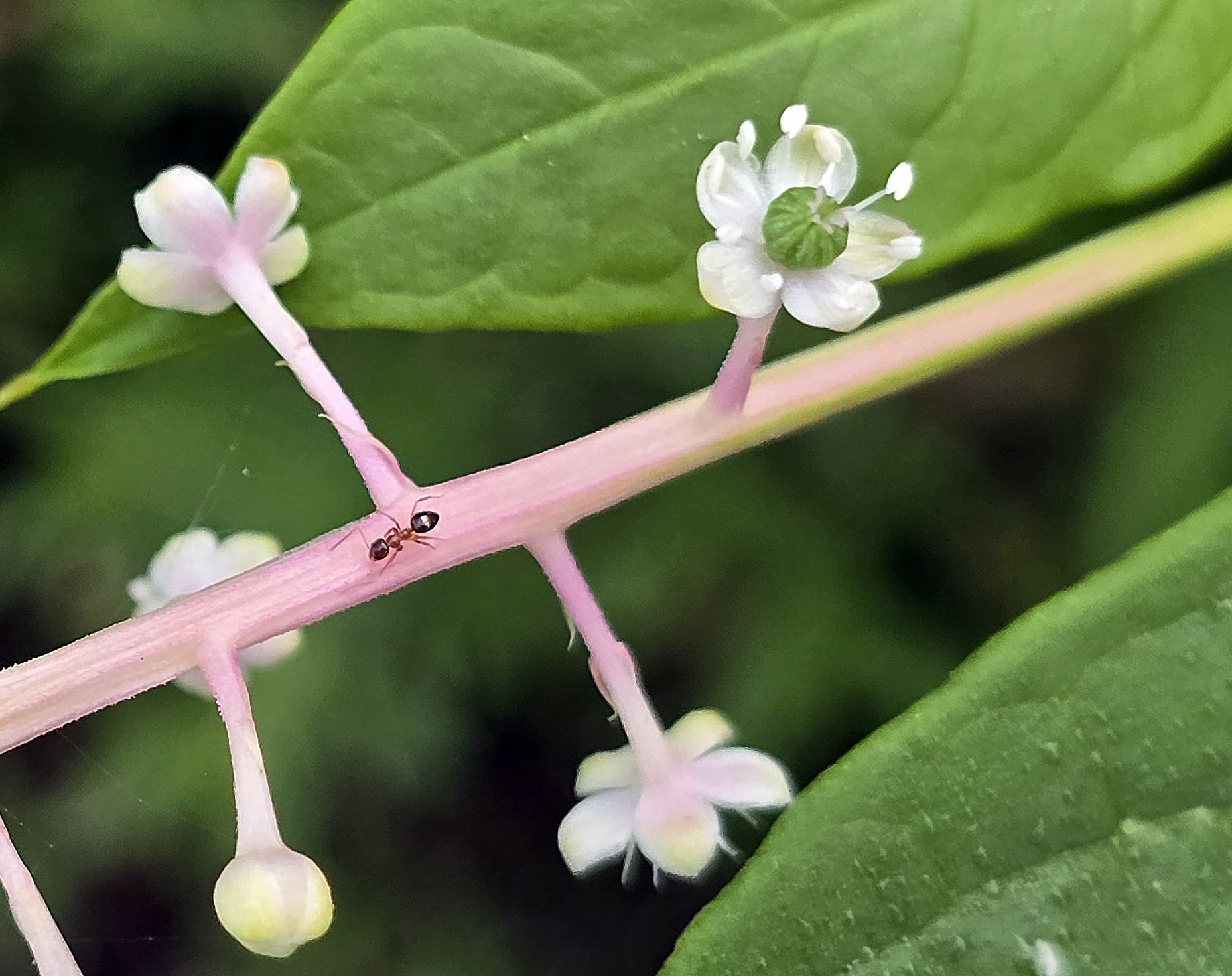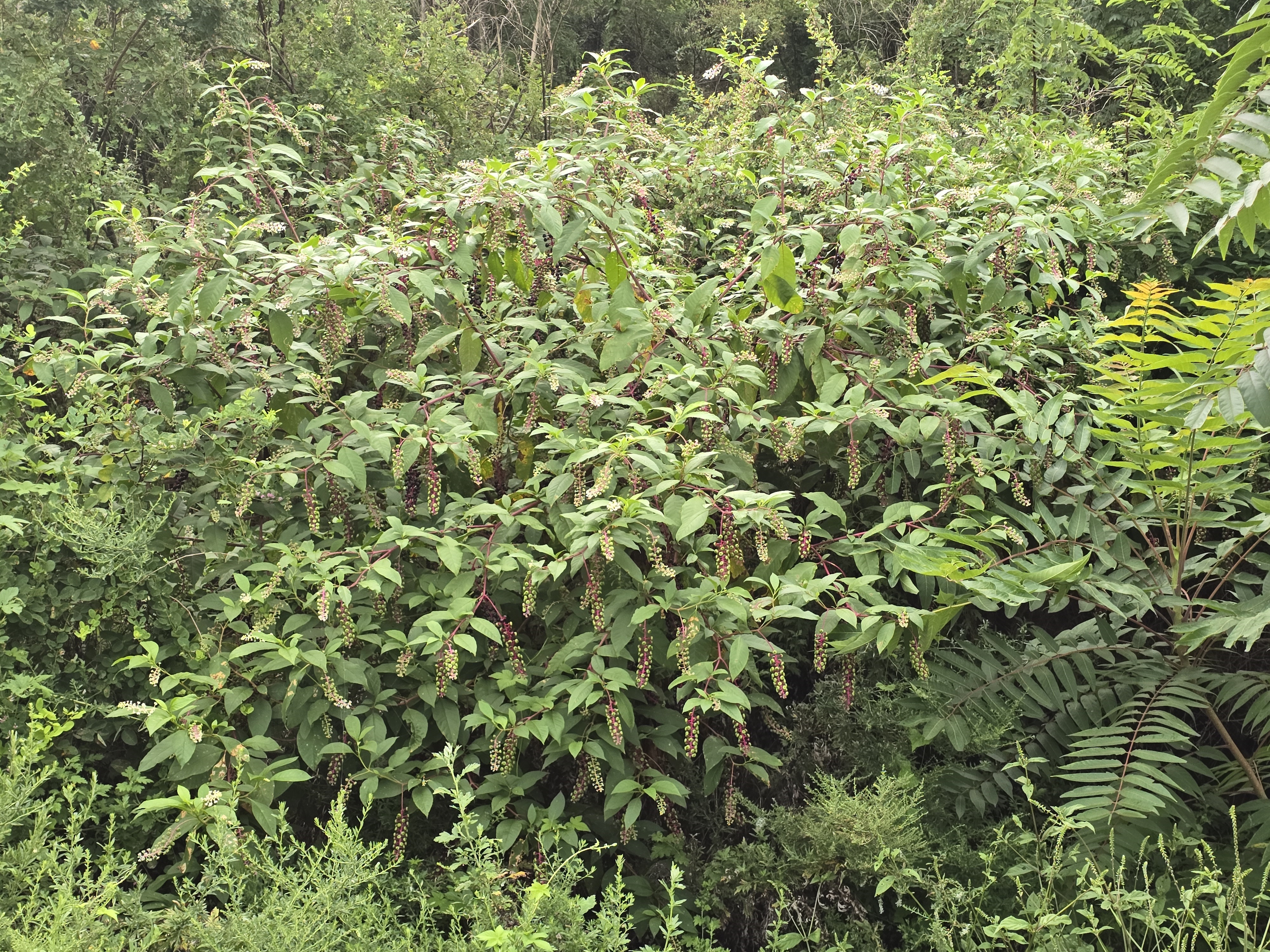 미국자리공; 야산이나 들녘에 자라는 북아메리카 원산의 한해살이풀이다. 굵은 뿌리에서 줄기가 나오며 가지와 열매가 붉은빛이 강한 자주색이다. 잎은 어긋나고 길이 10∼30cm의 긴 타원 모양 또는 달걀 모양이고 꽃은 6∼9월에 붉은빛이 도는 흰색으로 핀다. 전체적으로 독성이 있지만, 염료나 제초제 등으로 활용되었고 한방에서는 뿌리를 미상륙(美商陸)이라는 약재로 능막염 등에 쓴다고 하며 원주민들은 종기와 진균에 의한 피부병에 짓찧어 붙였다고 한다. 꽃말은 “환희”