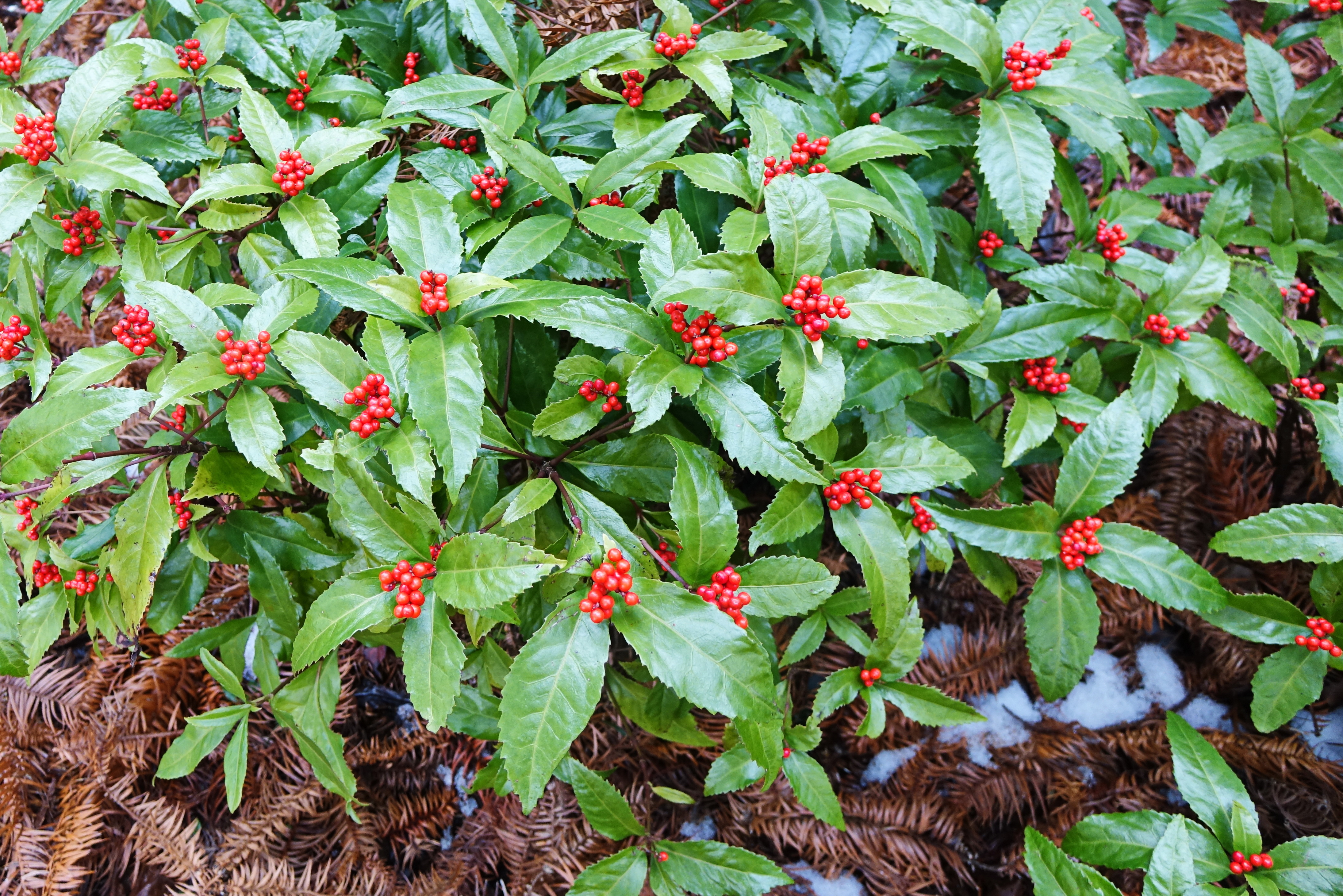 죽절초; 제주도 남쪽 지역 물줄기 주변 숲속에서 자라는 늘푸른떨기나무로 줄기에 대나무 같은 마디가 있어 죽절초란 이름이 붙었다고 하는데 나무임에도 풀 이름 사연은 알 수 없다. 6~7월에 황록색의 볼품없는 꽃이 피지만 붉은 열매는 아름답고 겨우내 볼 수 있어 관상용으로 인기가 높다. 12월의 나무이며 불우이웃돕기 '사랑의 열매' 모델이다.