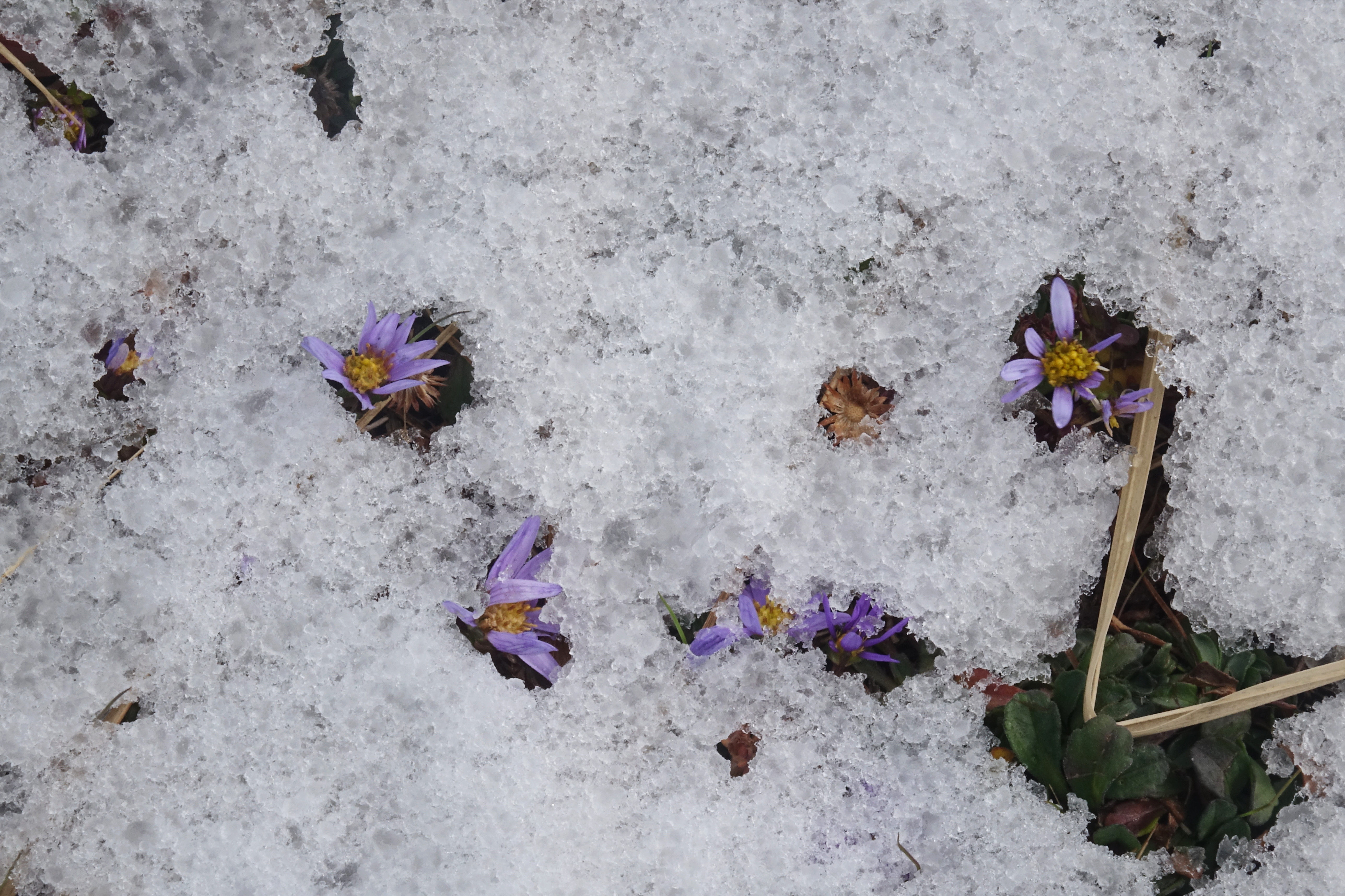 갯쑥부쟁이; 쑥부쟁이는 가을 들국화의 기본으로 쑥과 부쟁이(부지깽이나물)의 합성어라고 하는데 국가표준식물목록에 17종이 기록되어 있다고 한다. 섬갯쑥부쟁이는 제주도 동쪽 바닷가에서 사는 갯쑥부쟁이가 키가 작고 바닥에 붙어서 자란다는 둥 조금 다른 형태를 보임에 따라 새로 붙은 이름이 되었다. 꽃은 쑥부쟁이 종류보다 조금 늦게 10~11월에 피는데 한겨울 눈 속에서 보이는 것도 있다. 꽃말은 “그리움”
