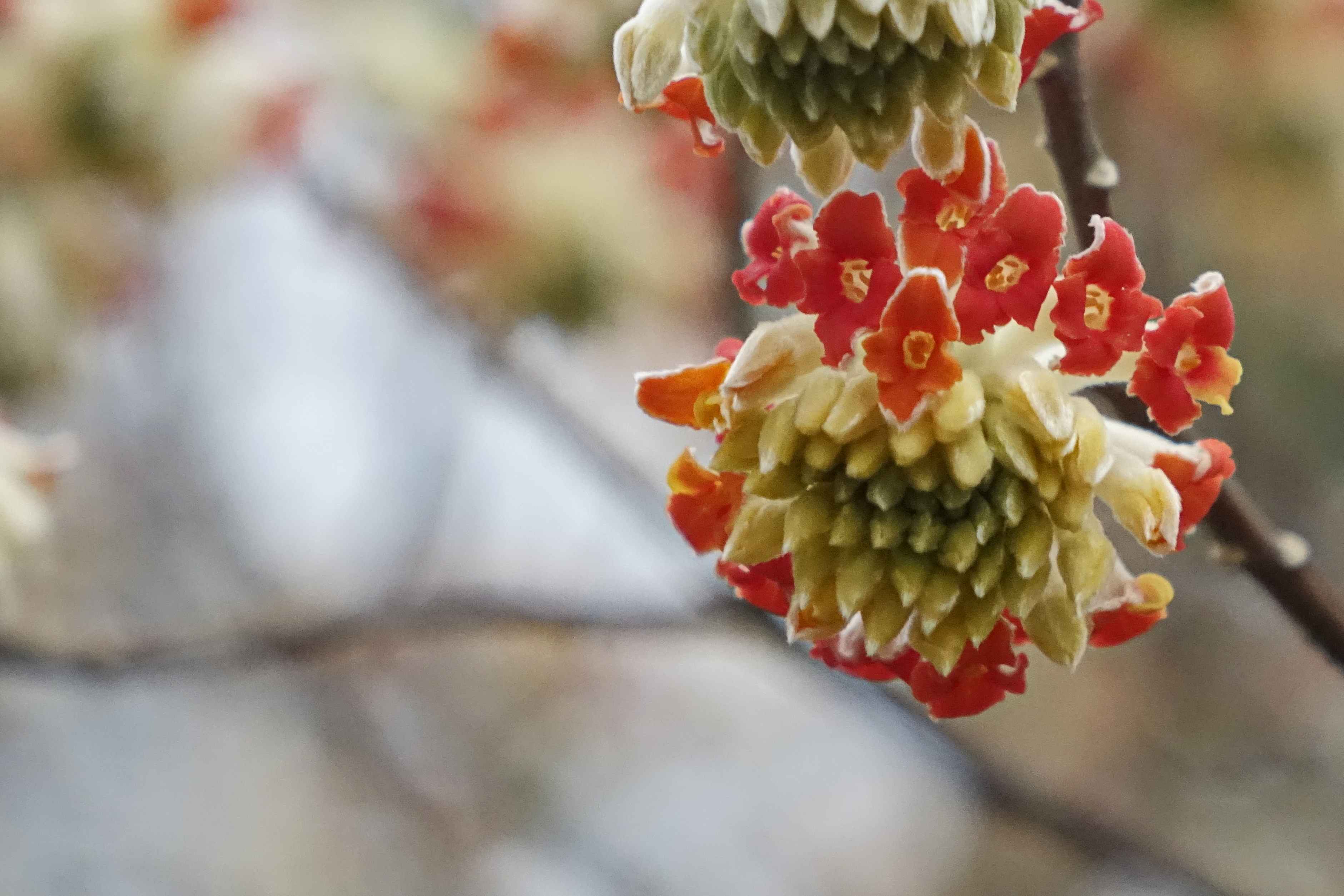 삼지닥나무; 가지가 세 갈래로 갈라지는 닥나무로 한라산과 남해안에서 자라며 종이 원료로 사용되었다고 한다. 꽃은 겨우내 하얀 솜털로 쌓여 크다가 이른 봄에 샤워기 모양으로 아래로 쳐진 노란 꽃을 피우는데 관상용으로 재배되는 붉은 꽃도 있다. 전체적으로 봄의 진한 향기가 나오는 꽃봉오리를 몽화, 뿌리를 몽화근이라는 이름으로 시신경이나 조루 등에 처방한다고 한다. 꽃말은 "당신께 부를 드립니다.“