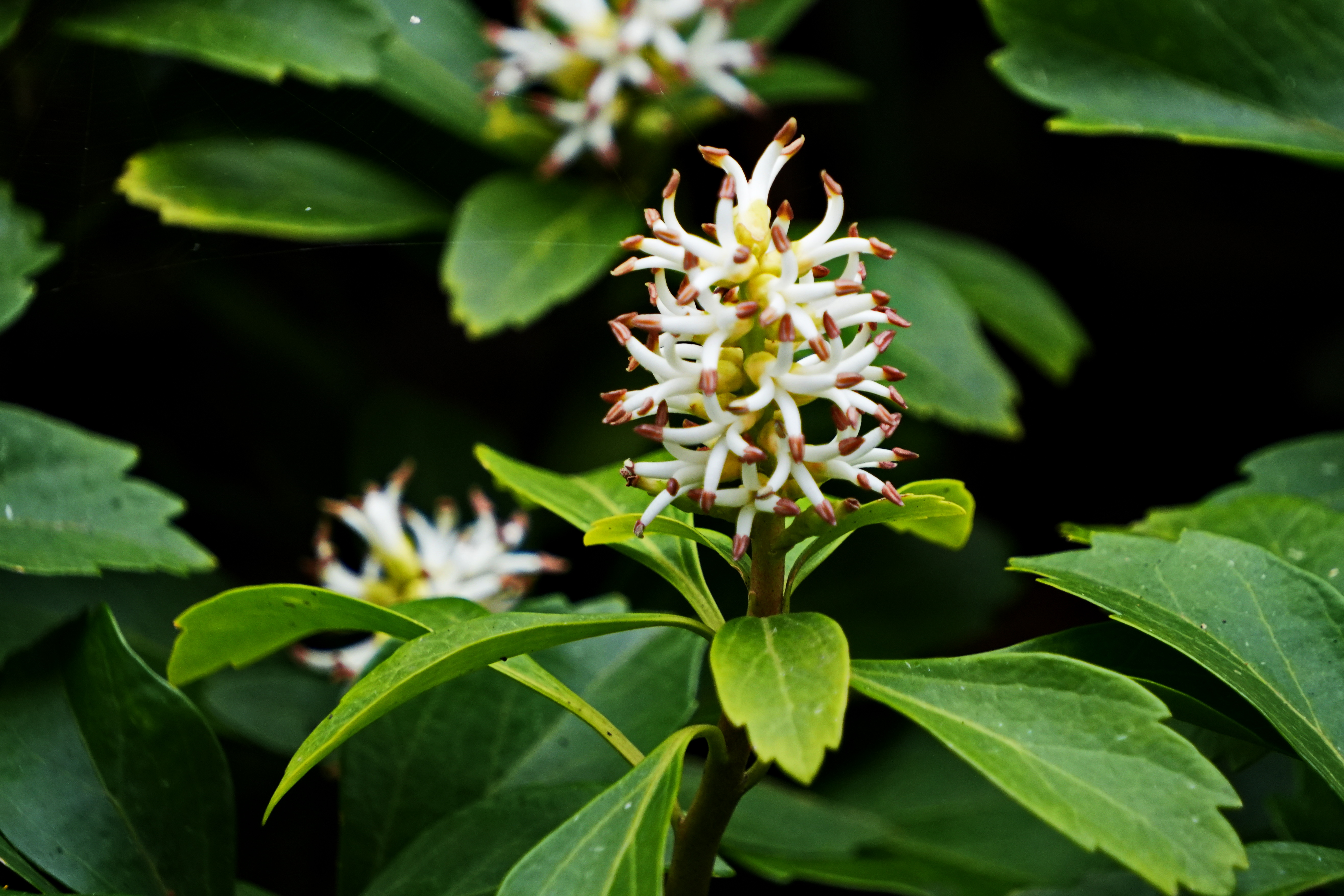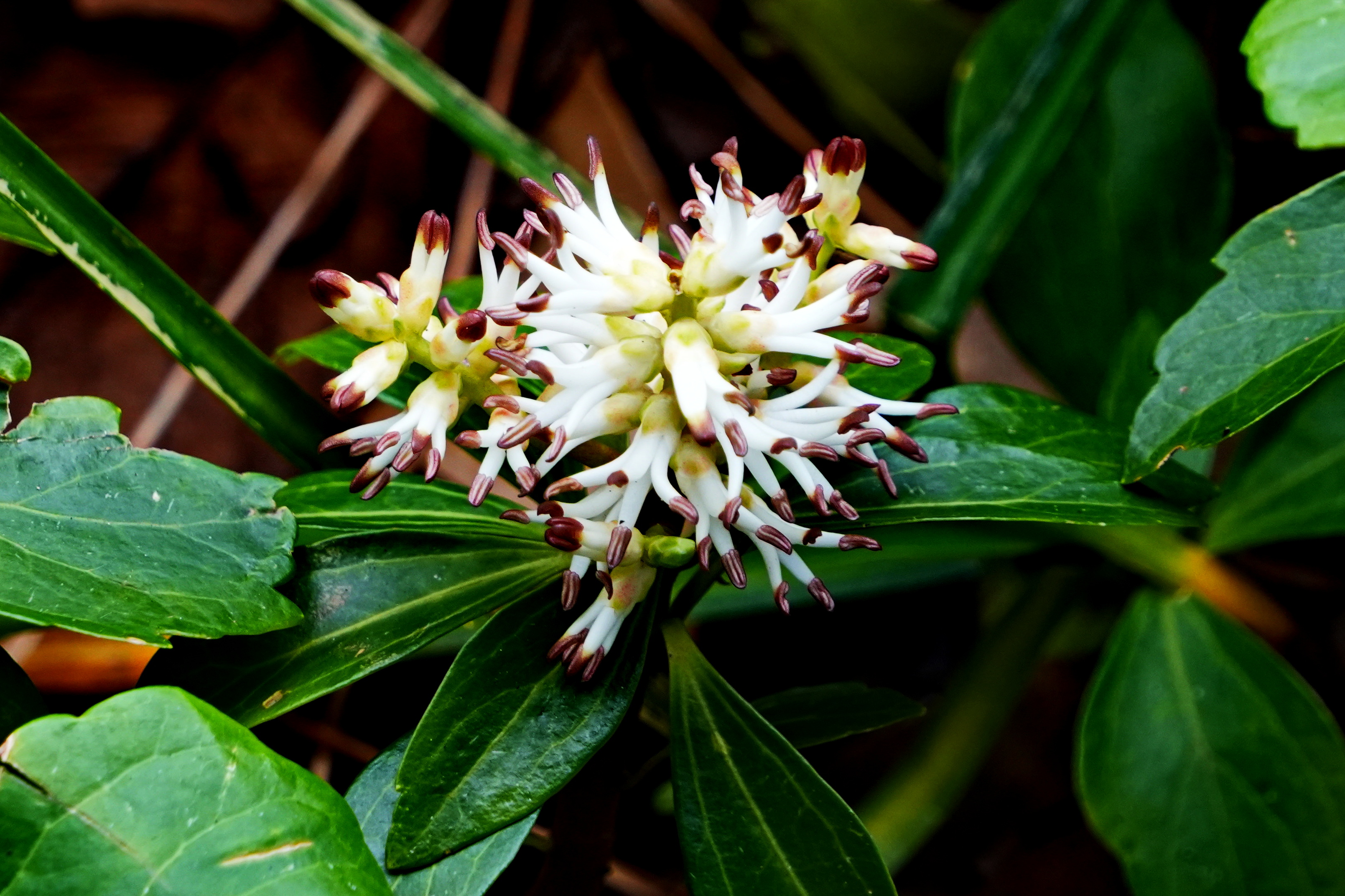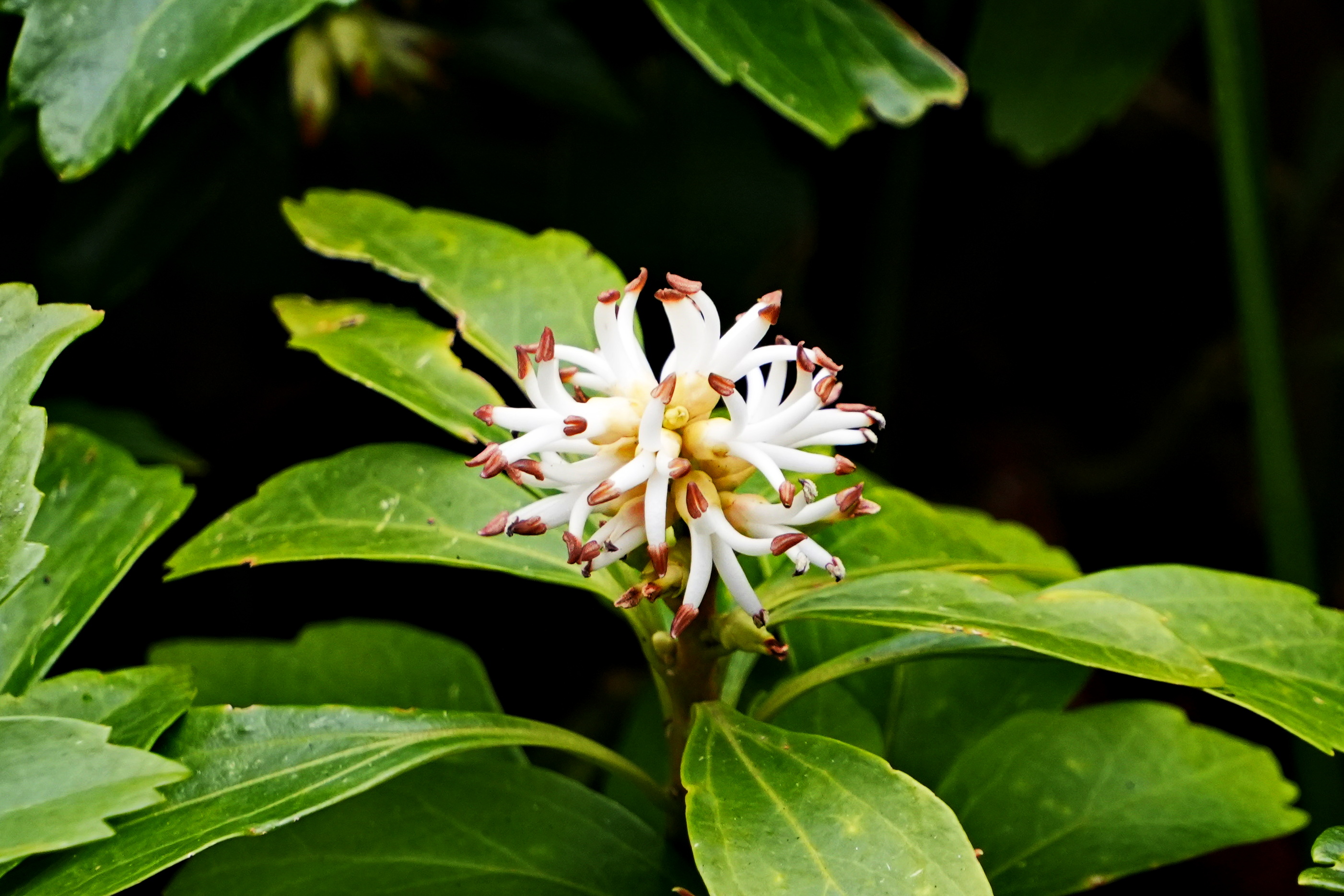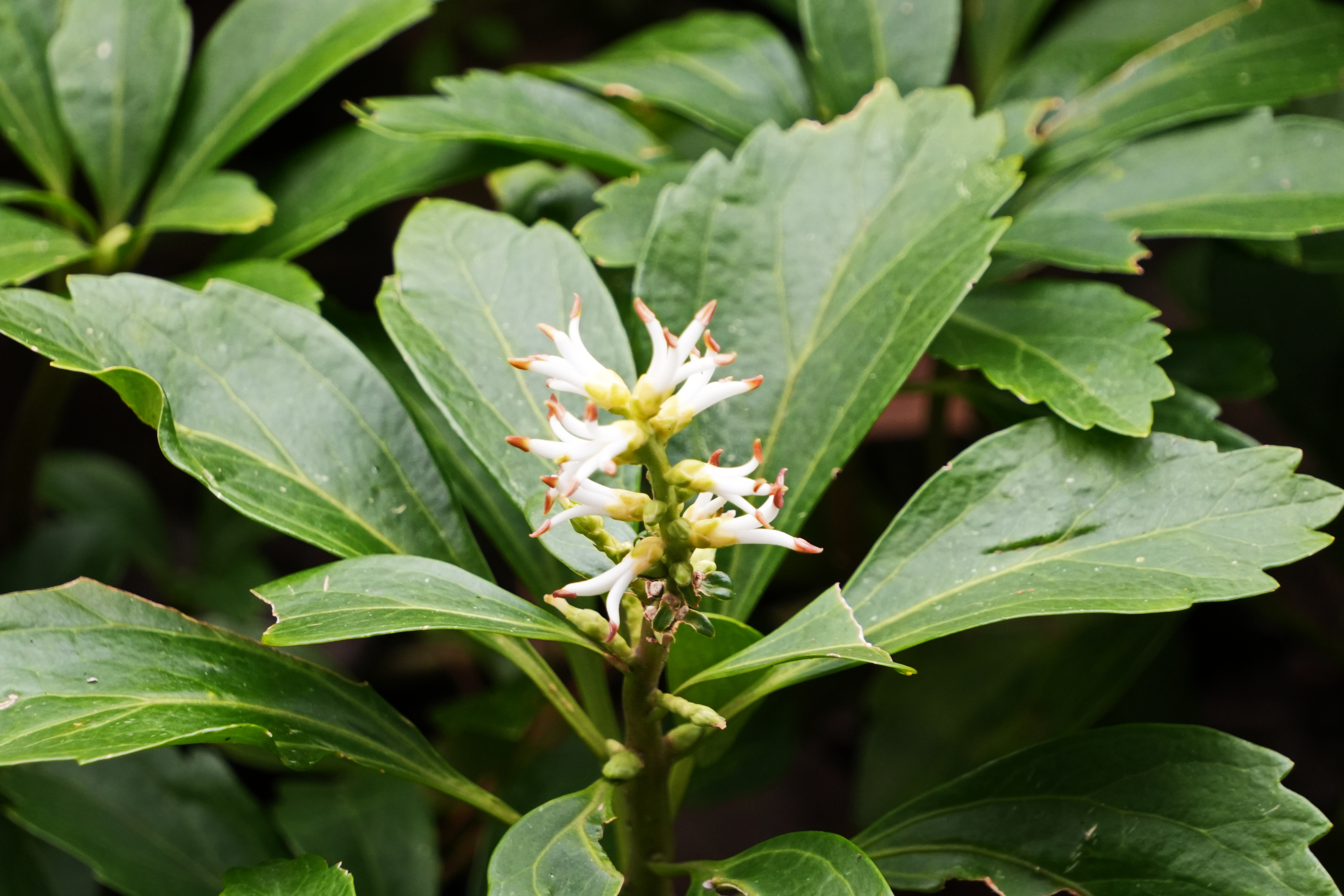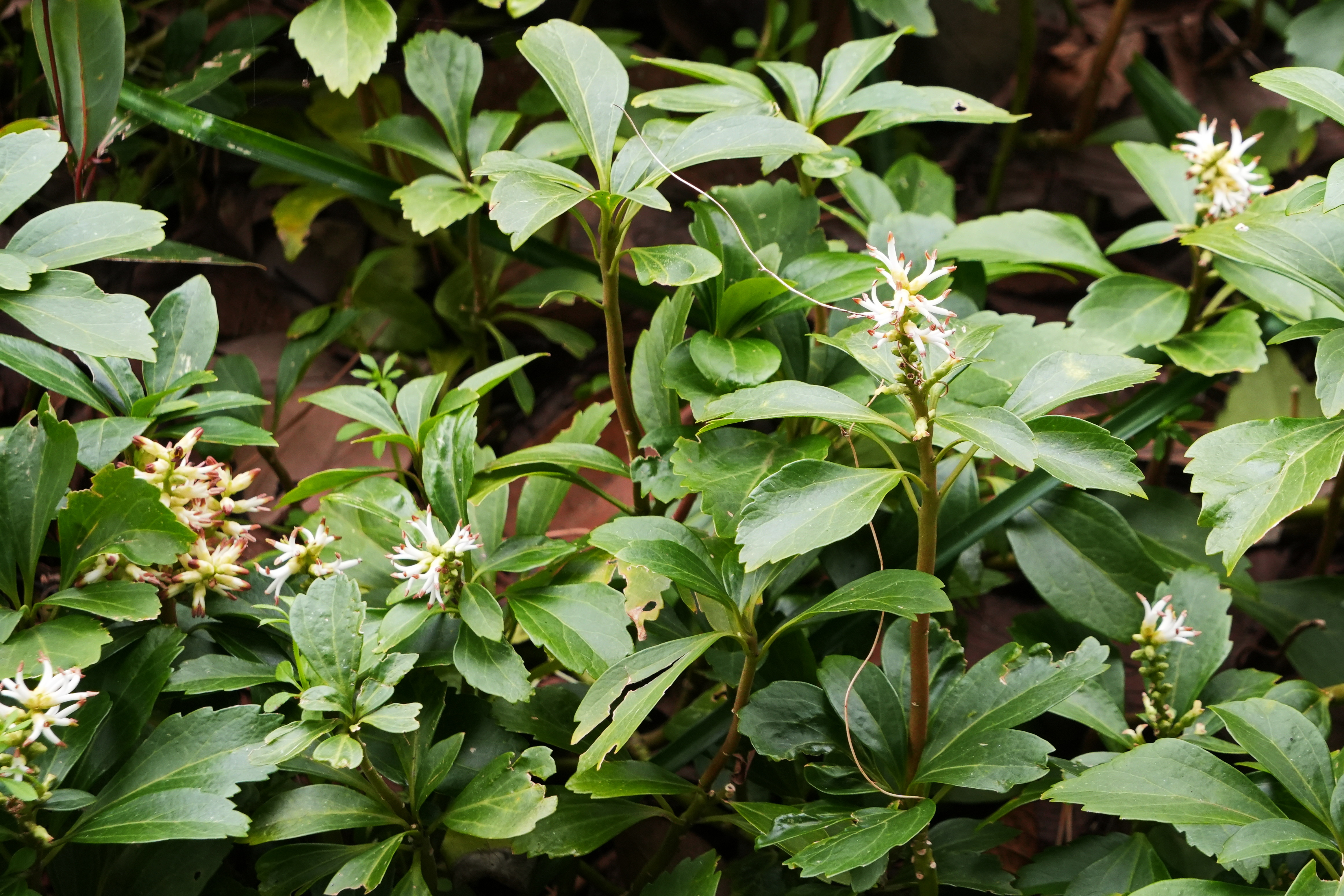 수호초; 일본이 원산지로 정원이나 공원에서 주로 가꾸는 상록성 여러해살이풀이다. 회향목과에 속하지만 나무가 아닌 높이 30cm 정도 낮게 자라는 풀로 잎이 풍성하며 4~5월에 흰색의 꽃이 핀다. 그늘지고 습한 숲속이나 공터에서 주로 자리 잡아 옆으로 기면서 땅을 덮는 지피식물 역할을 한다. 일본에서는 부귀초라는 이름으로 약재로도 쓰인다고 하는데 여성 질병과 위장 및 감기 치료제로 활용된다고 한다. 꽃말은 “동장군”