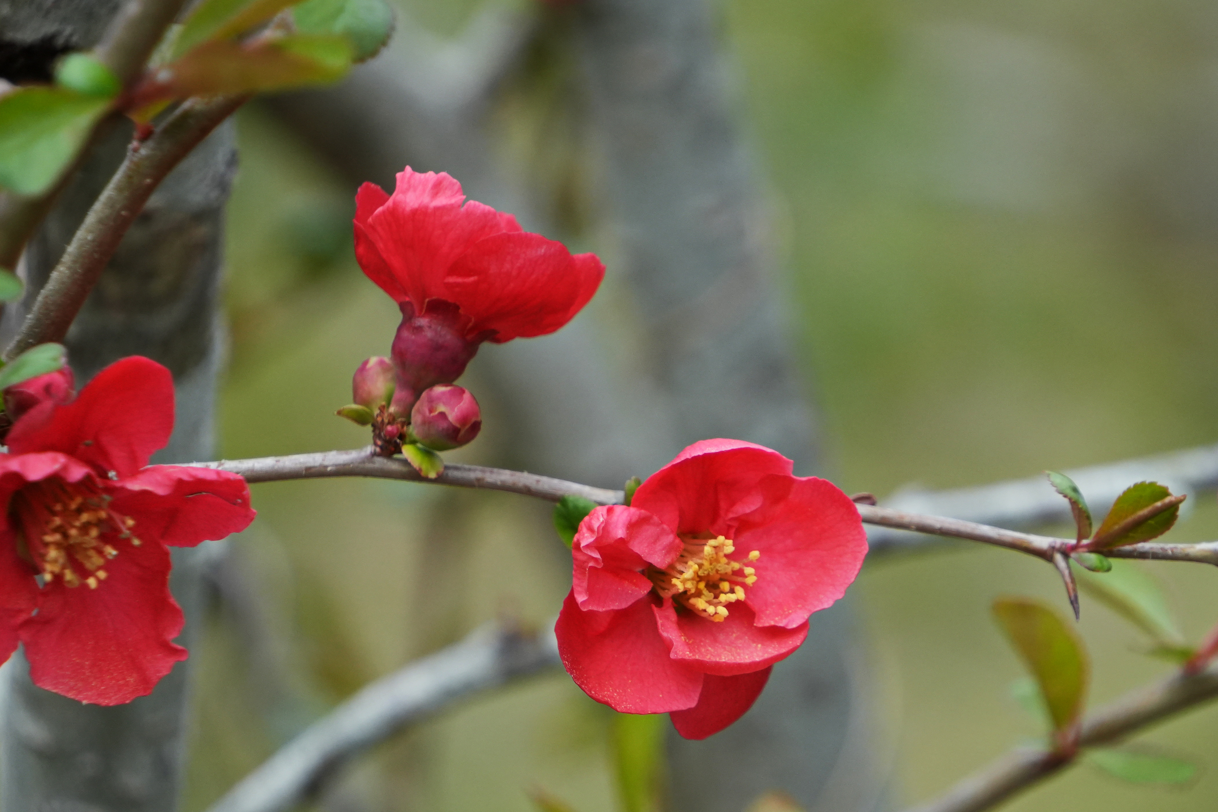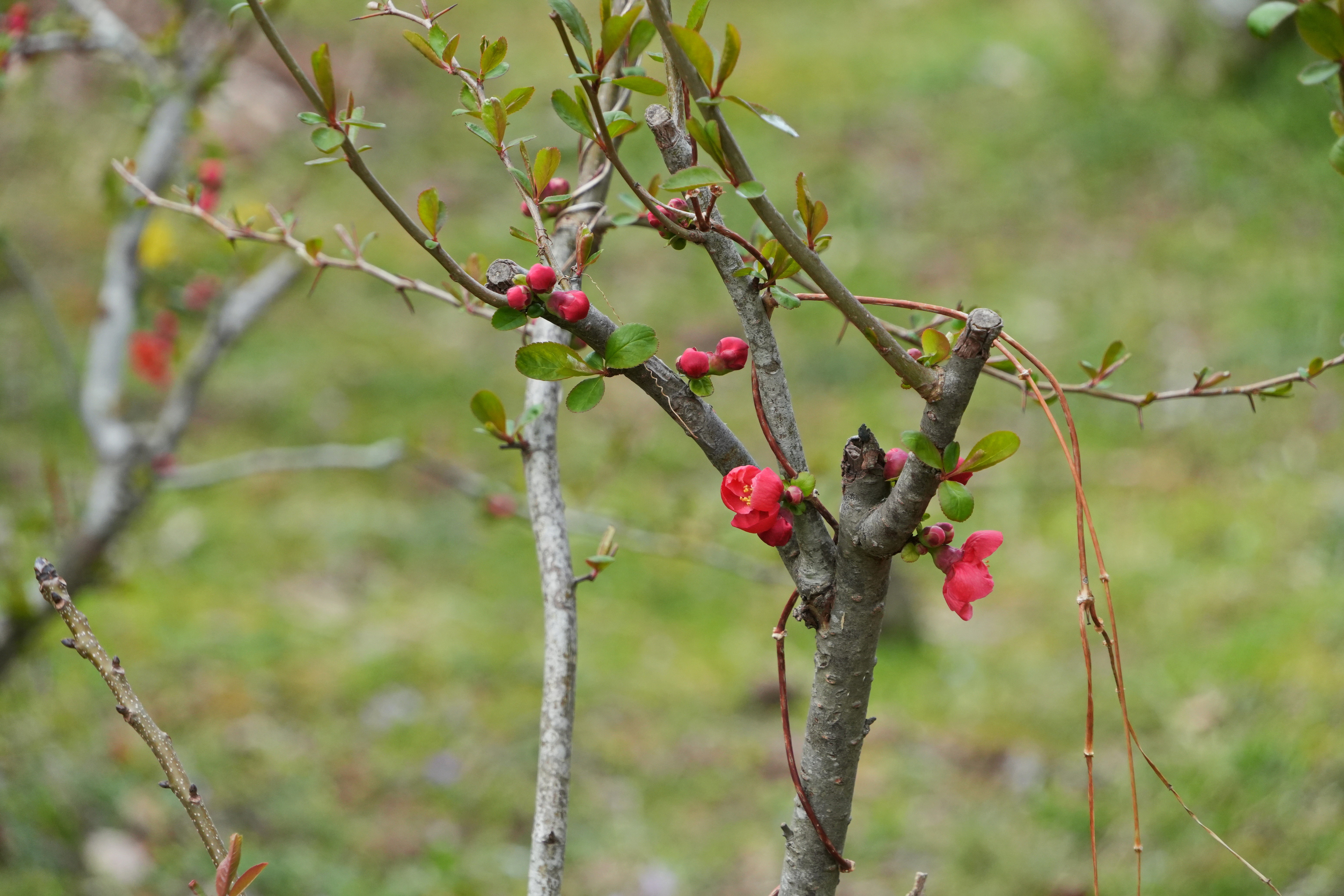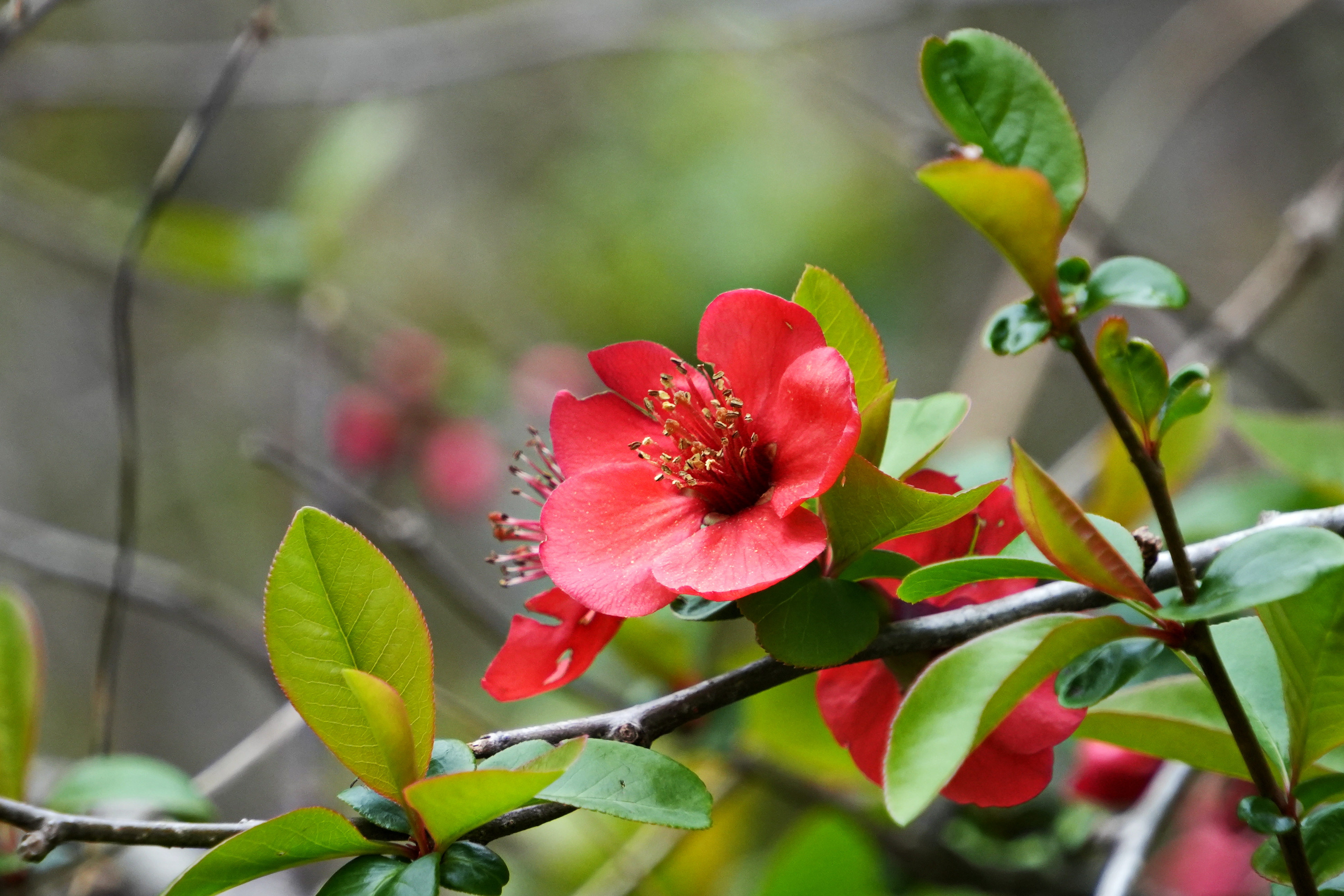 명자꽃; 산당화라는 명칭으로 등록되어 있다가 최근 명자나무로 개정한 봄의 꽃이다. 옛날부터 지방마다 다르게 처녀꽃, 아가씨꽃, 애기씨꽃, 기생꽃 등의 이름이 있었다고 하는데 어느 일본 학자가 이를 보고 아끼꼬(明子)나무라 불렀다는 말도 있다. 이른 봄에서 늦은 봄까지 주로 선홍색의 꽃을 피워 봄의 정령을 상징한다고 한다. 열매는 木果라 하여 식초를 만들거나 근육경련 등 약용으로 사용한다. 꽃말은 "겸손, 조숙"